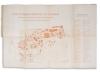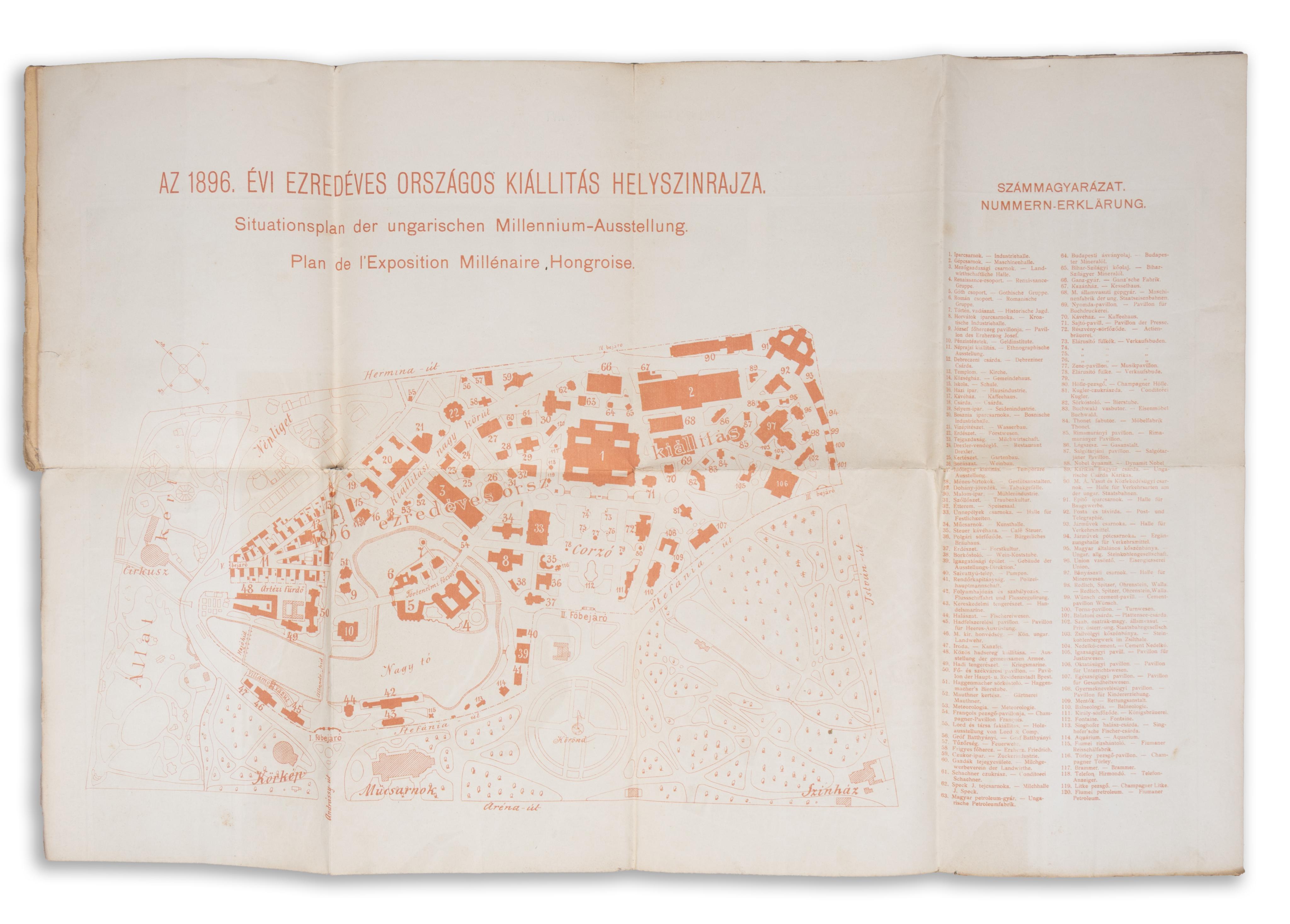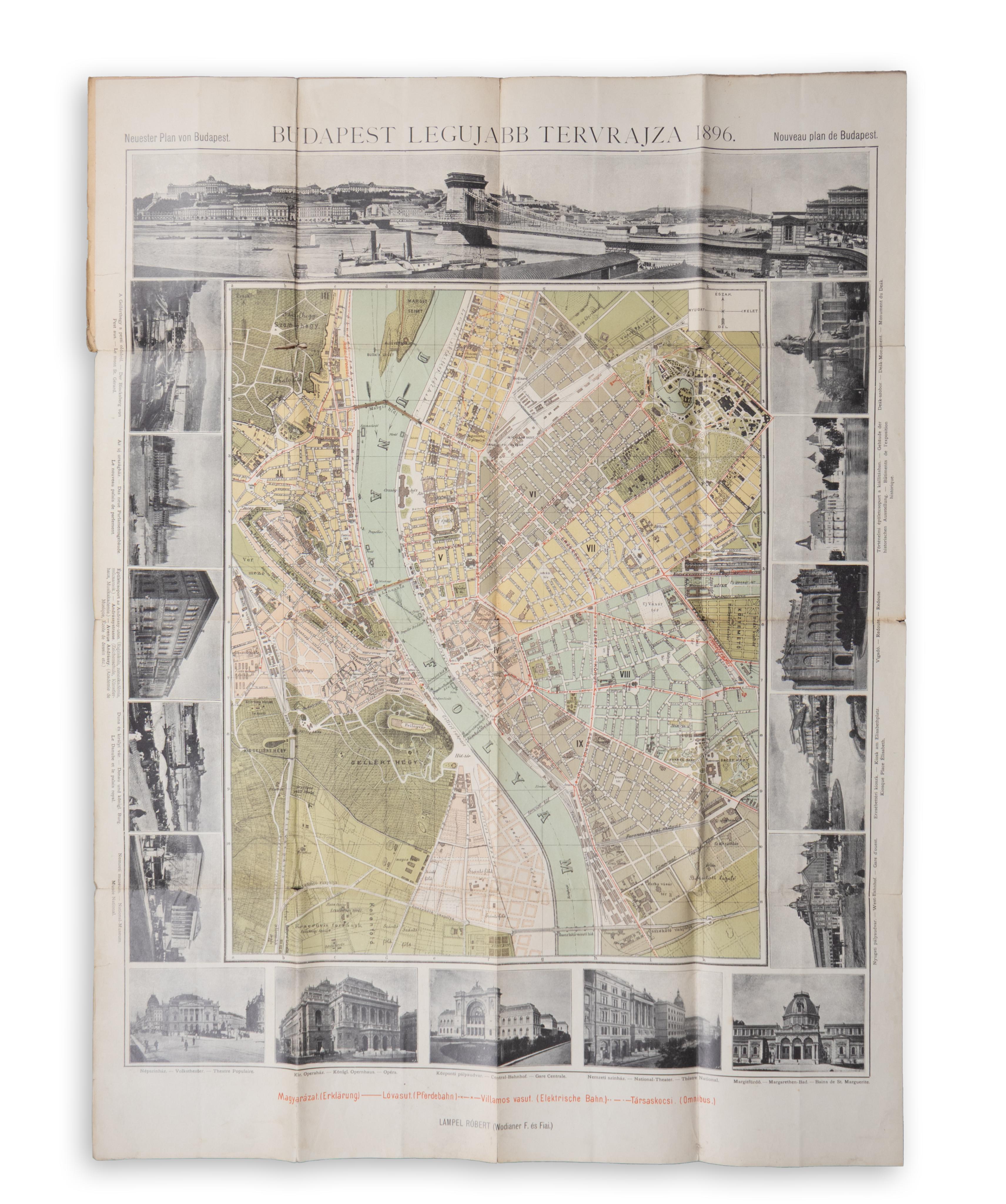 Budapest panorámaképe. Színes, lith. hajtogatott, javított térkép. A térképlap hátoldalán felkasírozva az 1896. évi ezredéves országos kiállítás helyszínrajza. Keretképekkel, kiadói papír mappában.