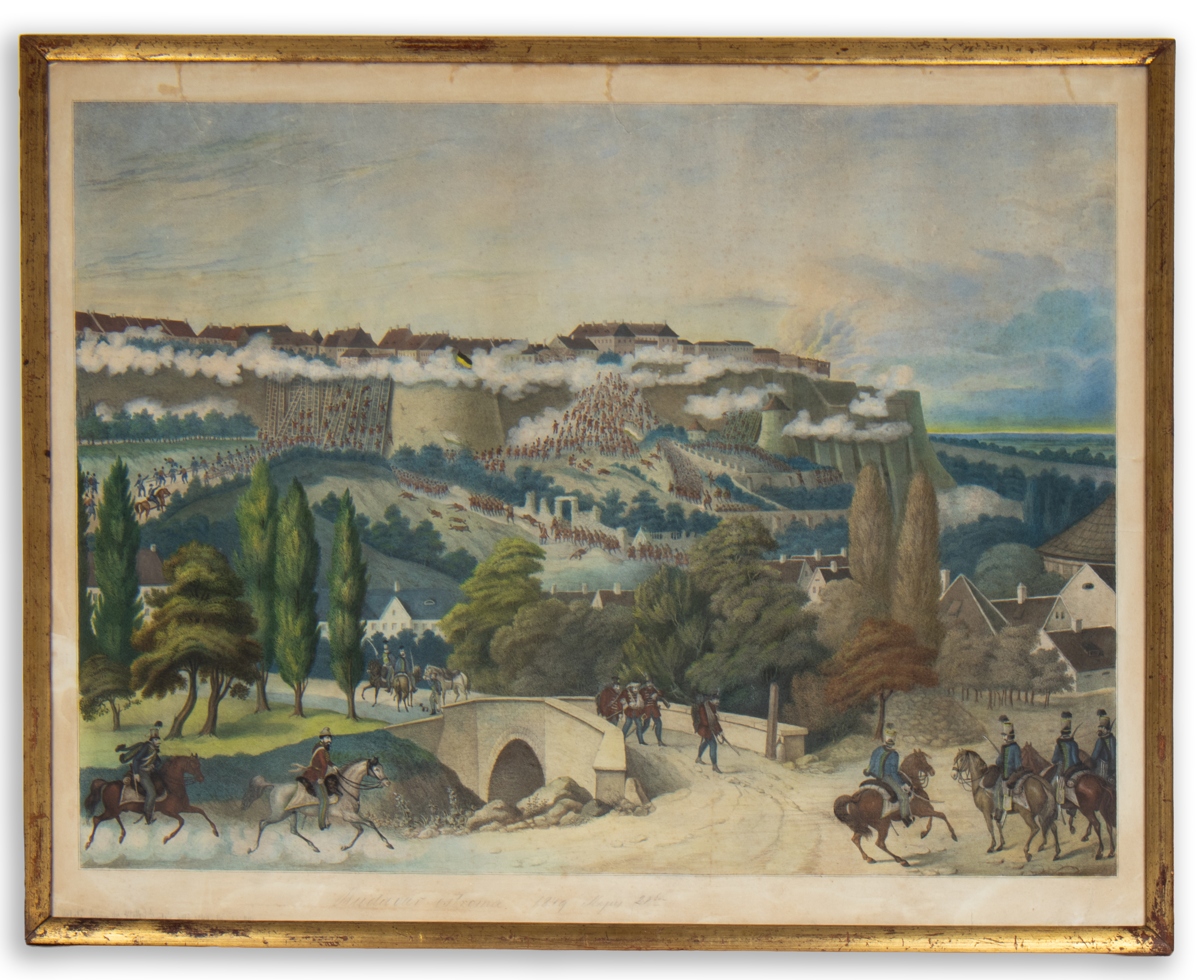 Színezett kőnyomat. Monumentális ostromkép nyugati irányból felvéve. Címszövege kézírással, példányunk bal sarkán a készítőre utaló ceruzás megjegyzéssel.