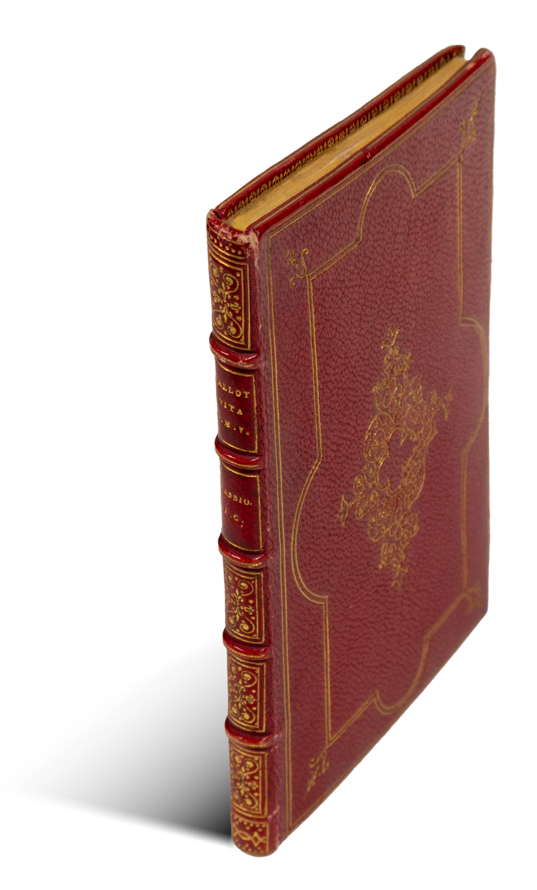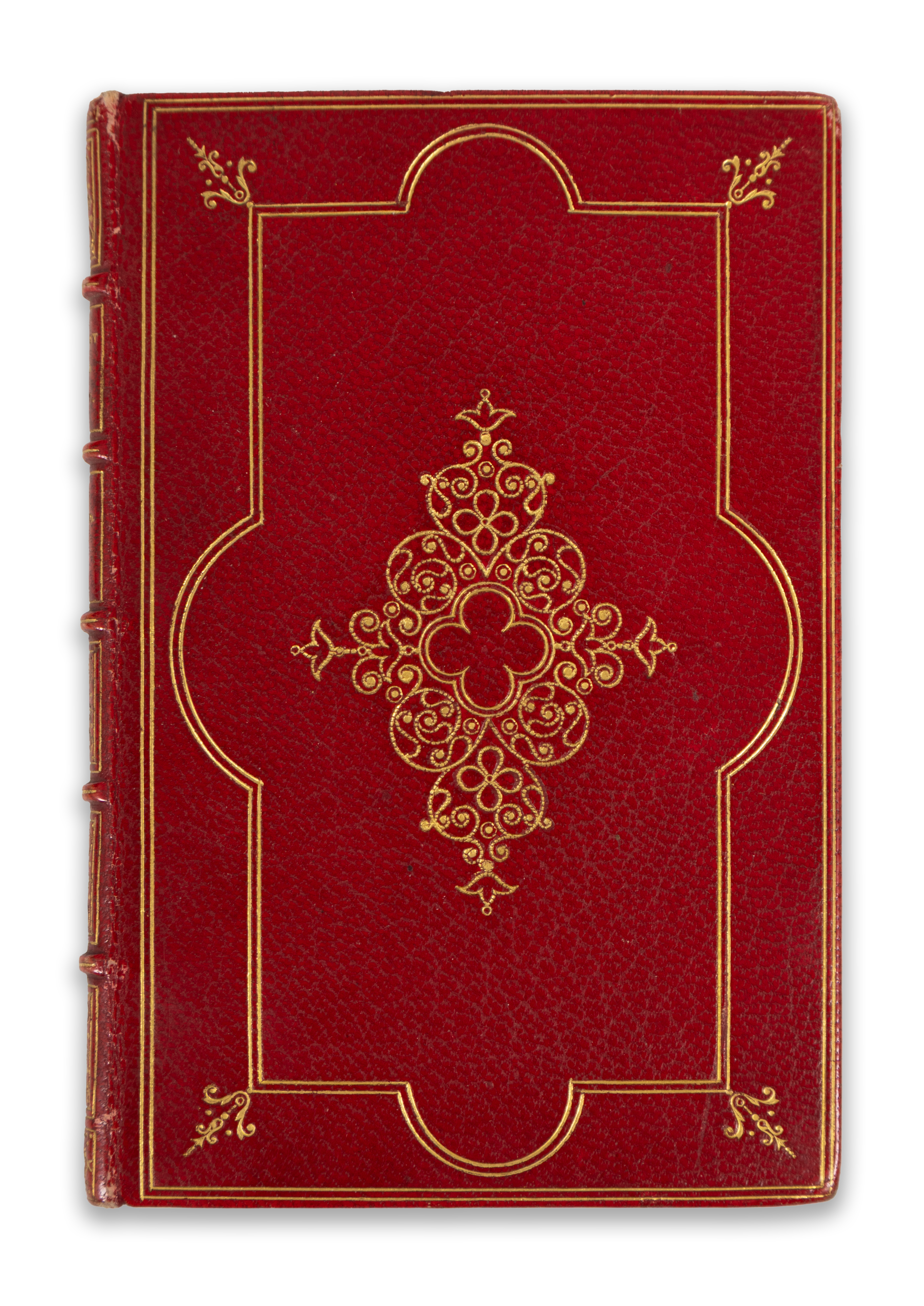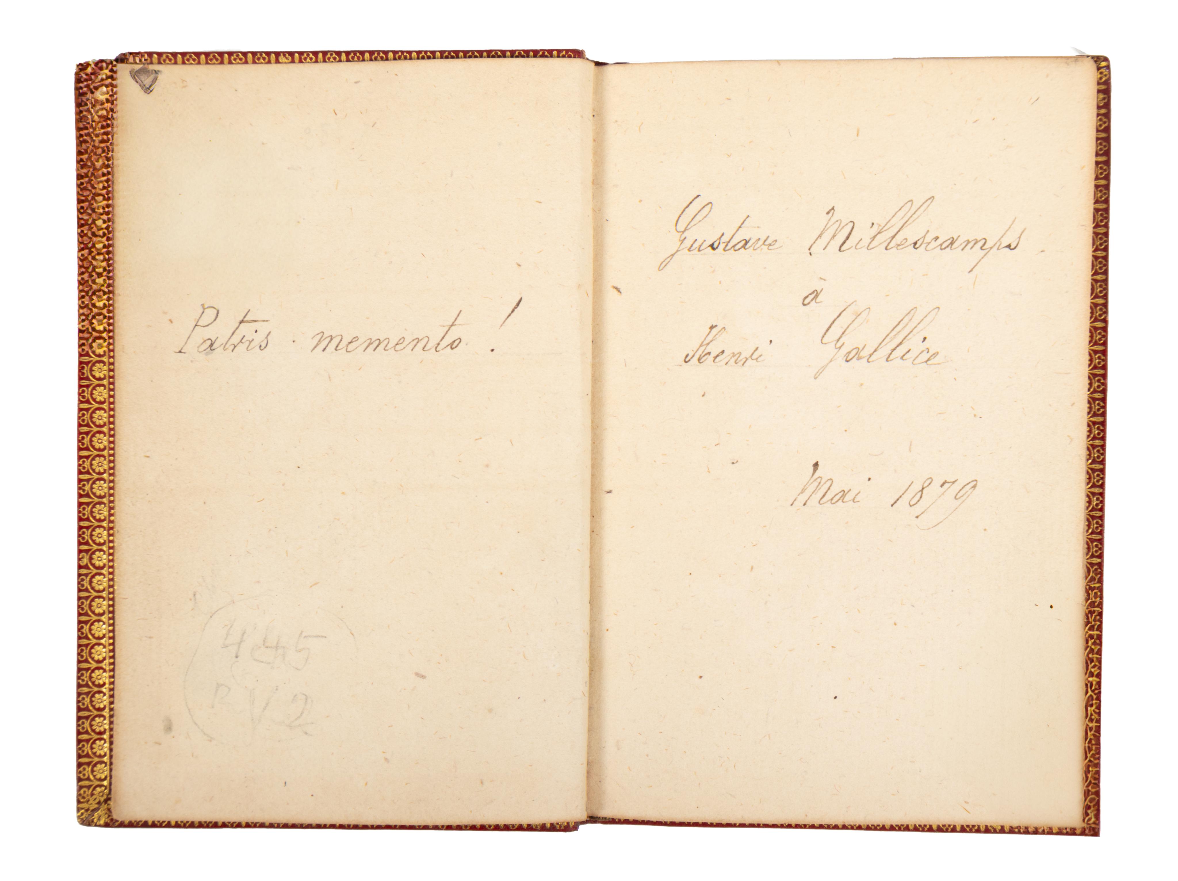 Red maroquen binding with ribbed spine in the style of the 18th century. The boards, spine and inner board edges are richly decorated with gilt and butterfly-painted endpapers. Ex libris on the front pastedown: P Desq. Gift inscription in ink on the front pastedown: "Gustave Millescamps a Henri Gallice mai 1879" Millescamps (1827-91), a French historian and archaeologist, gave it to Henri Gallice (1853-1930), the founder of the Perrier-Jouët champagne factory, who inherited it with his brother in 1878.with "Patris memento!", (Remember your father!) inscription across. A beautiful bibliophile copy (11,2 x 7,6 cm)
