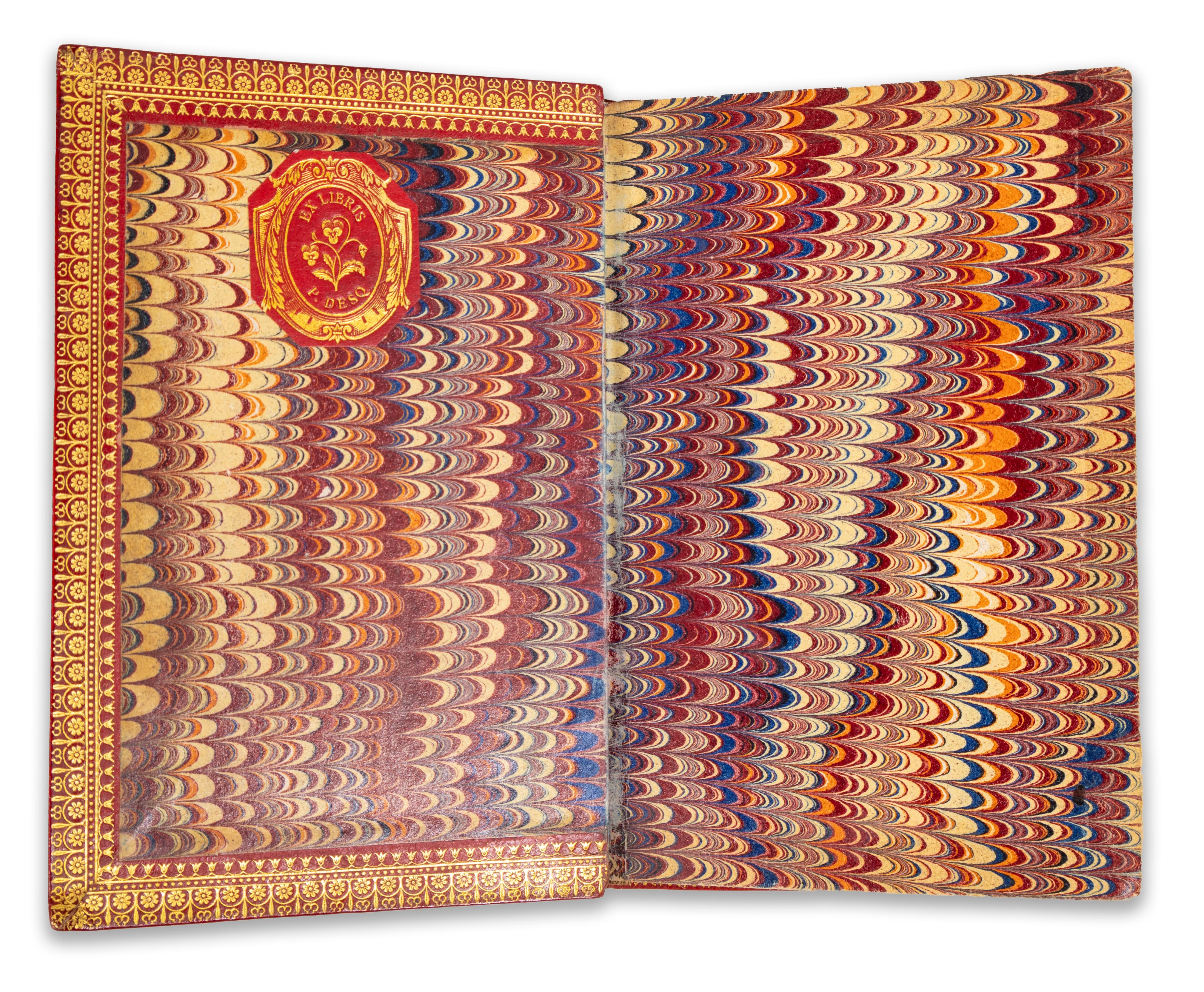 Vörös, bordázott gerincű maroquen kötés a 18. század stílusában. A táblák, a gerinc és belső táblaperemek gazdag aranyozással és pillangós festésű előzéklapokkal. Az első táblaverzón beragasztott ex libris: P Desq.