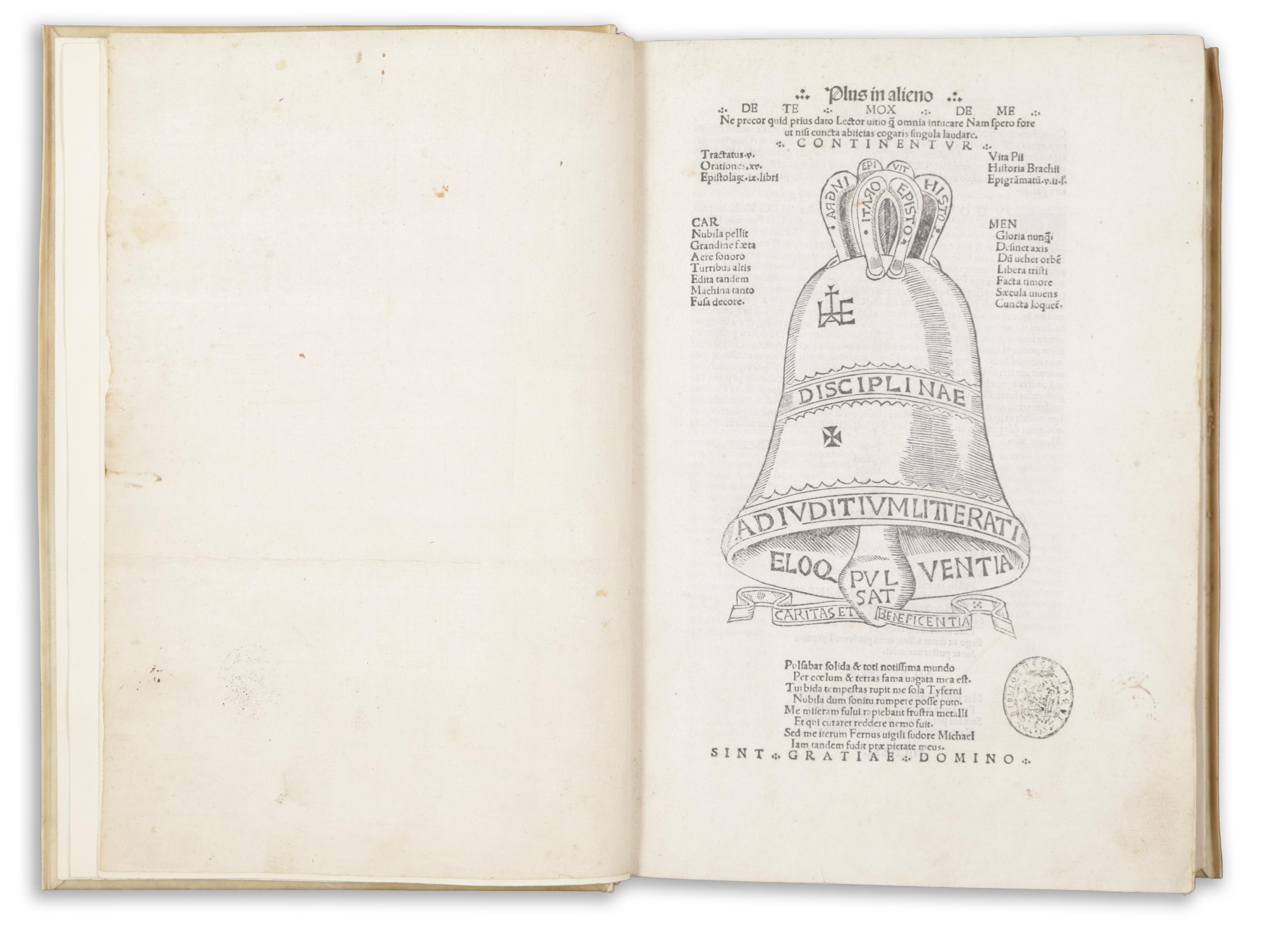 Campano műveinek első kiadása két fametszetű illusztrációt tartalmaz: a címlapon egy nagyméretű harangot xilográfiai felirattal - a szerző nevével való játék -, valamint egy nagyméretű fametszetet az F4-en, mindkettő a HAE (Eucharius Argenteus Herbipolensis) ábrázolással. Az egyházi ember, humanista és szónok Campano a retorika tanáraként és ügyvédként tevékenykedett, mielőtt 1463-ban Crotone püspöke lett, és 1472-1474 között Todi pápai helytartójaként szolgált. Kiterjedt írásai között traktátusok, szónoklatok, levelek, sírfeliratok és epigrammák, II. Pius pápáról szóló életrajz, és Aquinói Szent Tamás élete, valamint Braccio Fortebraccci, a condottiere és Motone grófjának hosszú életrajza szerepel. Campano barátja, Michele Ferno, aki ezt a kötetet szerkesztette, életrajzot közöl a szerzőről, valamint bőséges bevezető szövegeket és szerkesztői megjegyzéseket. Eucharius Silber, aki eredetileg a németországi Würzburgból származott, 1480-tól a XVI. század elejéig Rómában nyomtatott.