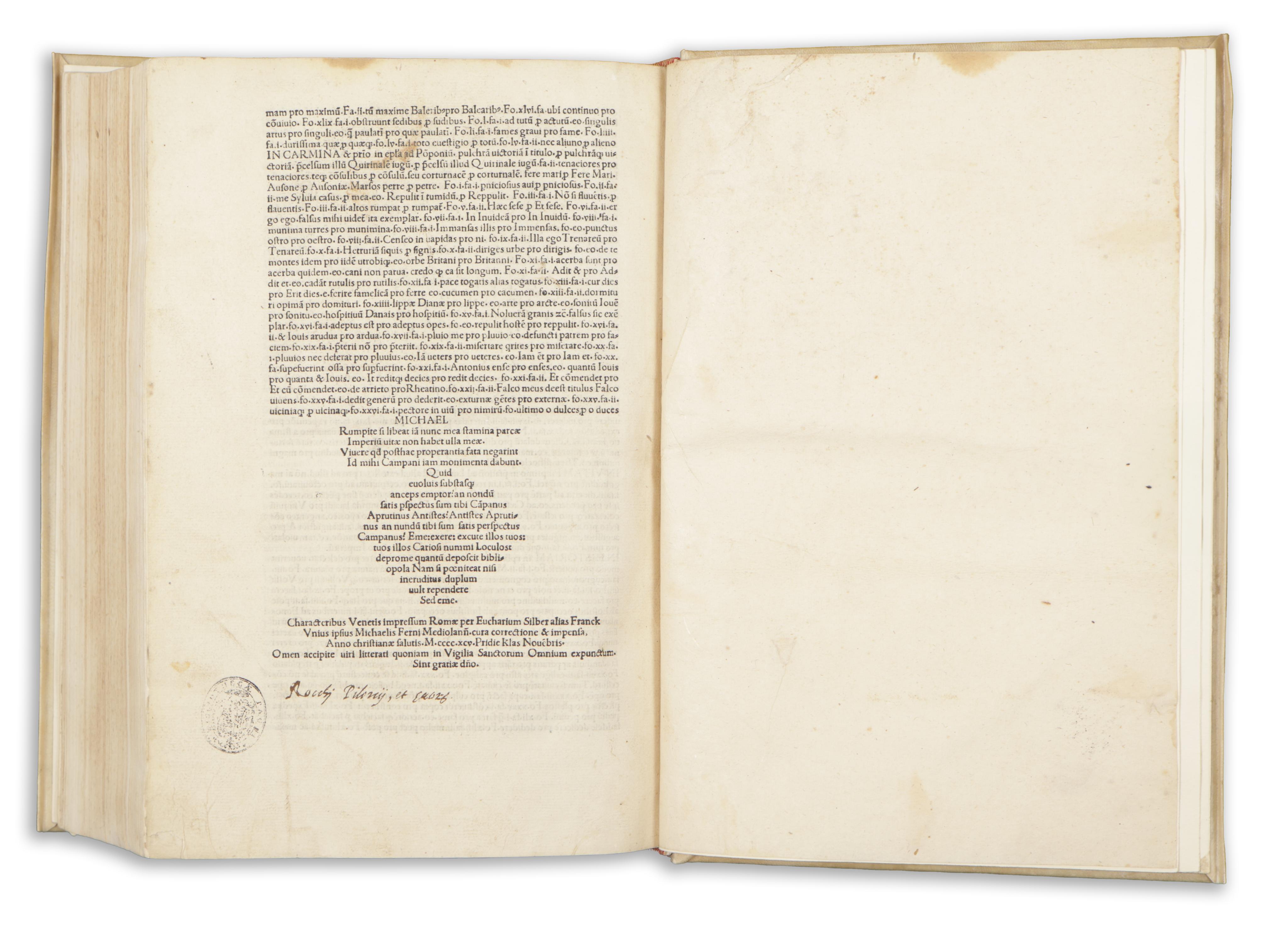 Characteribus Venetis impressum Romae per Eucharium Silber alias Franck Unius ipsius Michaelis Ferni Mediolan[e]n[sis]. cura correctione & impensa. Anno christianae salutis. M.cccc.xcv. Pridie k[a]l[end]as Nove[m]bris. Omen accipite viri litterati quoniam in Vigilia Sanctorum Omnium expunctum. Sint gratiae d[omi]no.