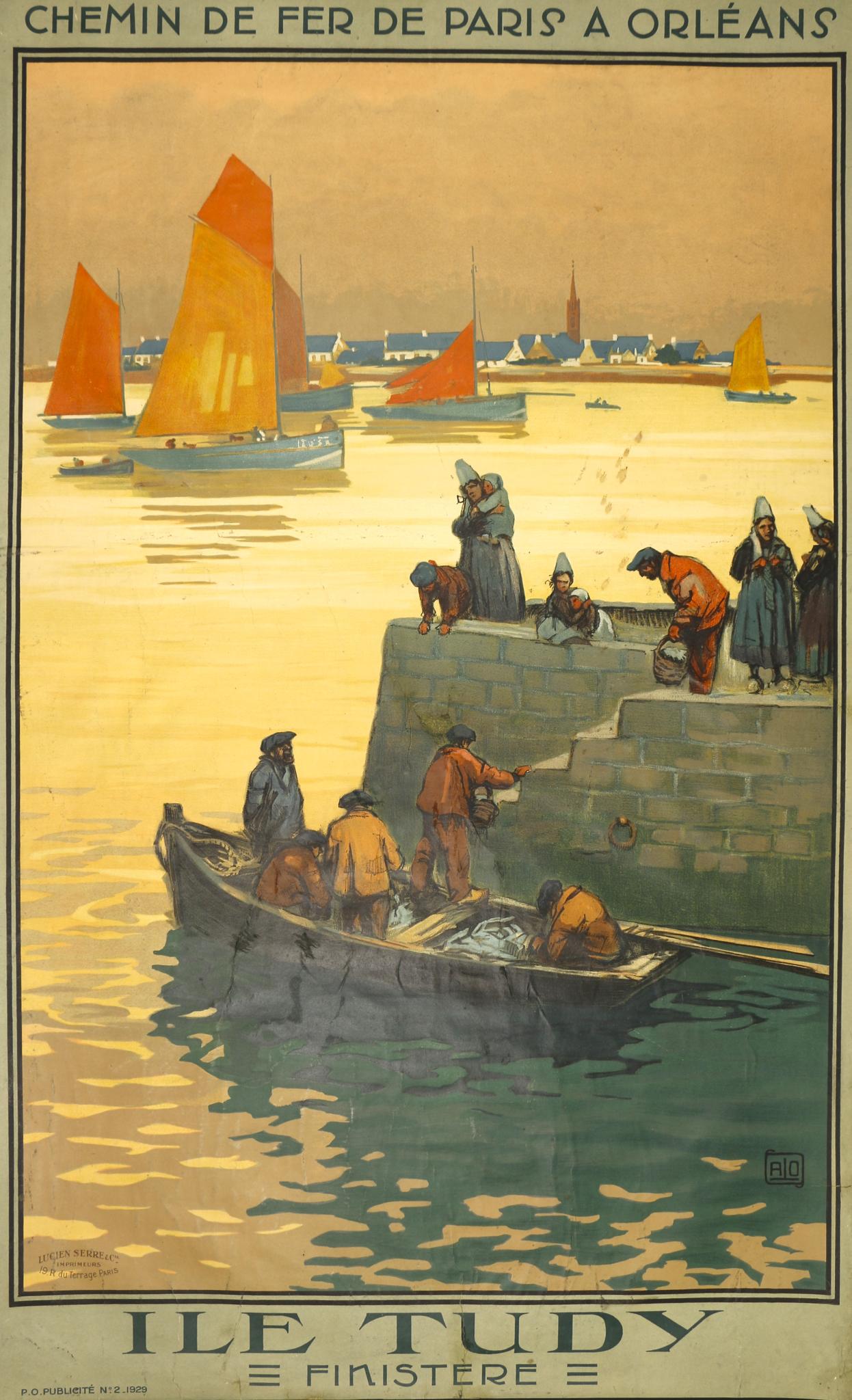 The travel poster of a French state railways depicting the port takes you to the picturesque Île Tudy in Brittany.