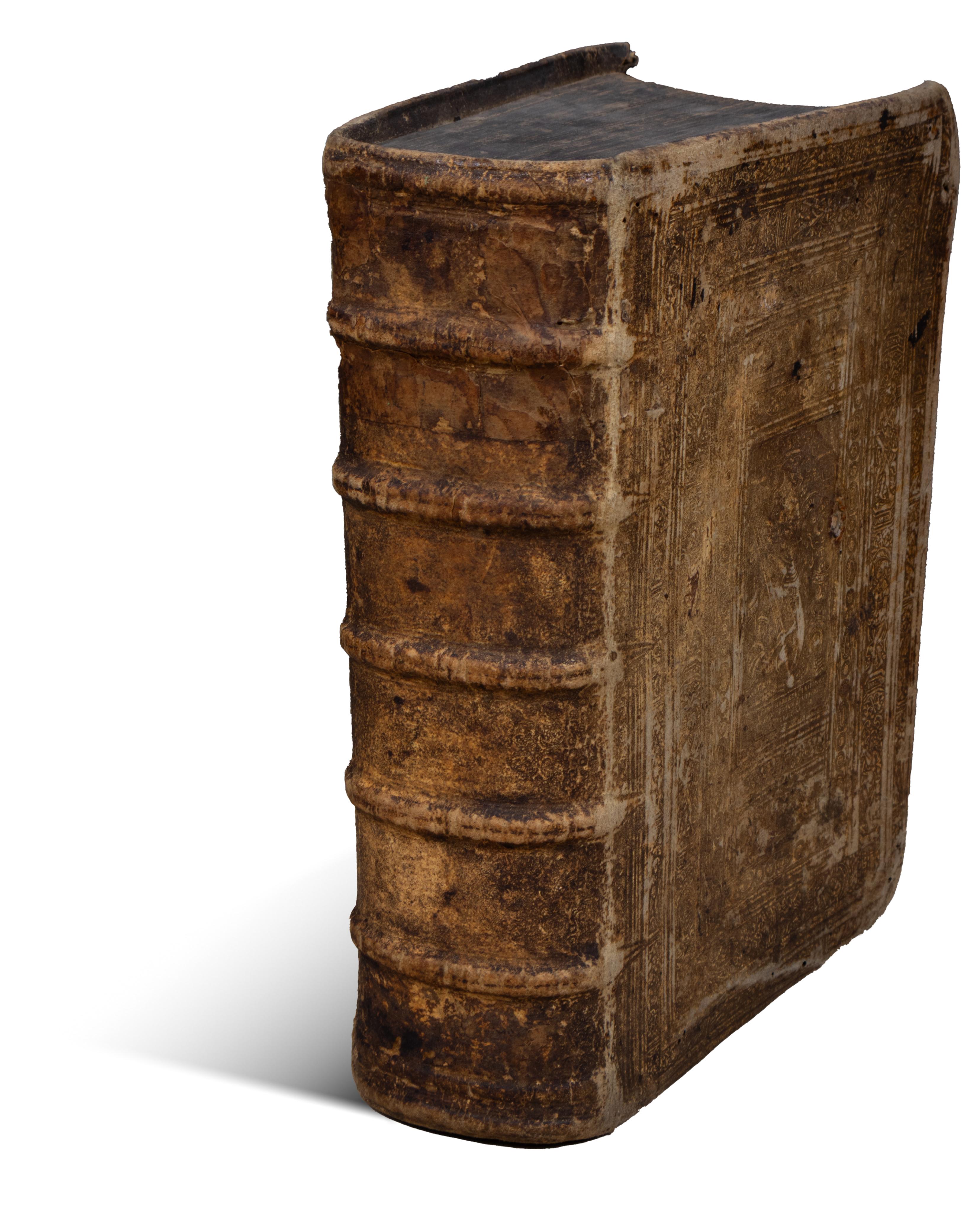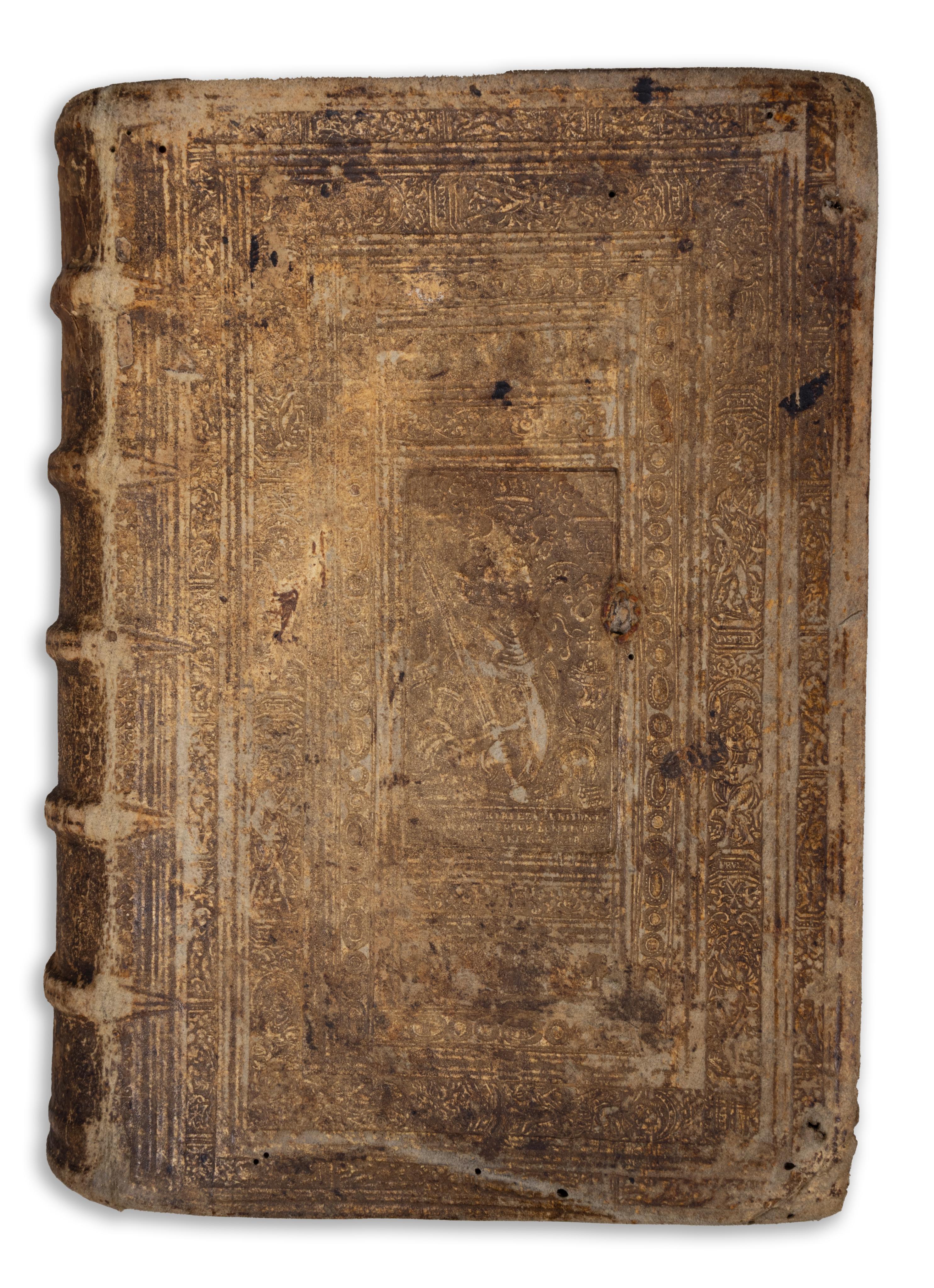 The four parts are bound together, in a contemporary, five-ribbed, Renaissance full-leather binding richly decorated with lines and scrolls. In the middle of the first panel is Charles V, Holy Roman Emperor. Its title page is richly framed. Some of its pages have short underlines. The binding is worn, there is a minor damage to the front, several small creases at the back, and the corners are slightly broken. Despite this, the volume is solidly bound and clean.