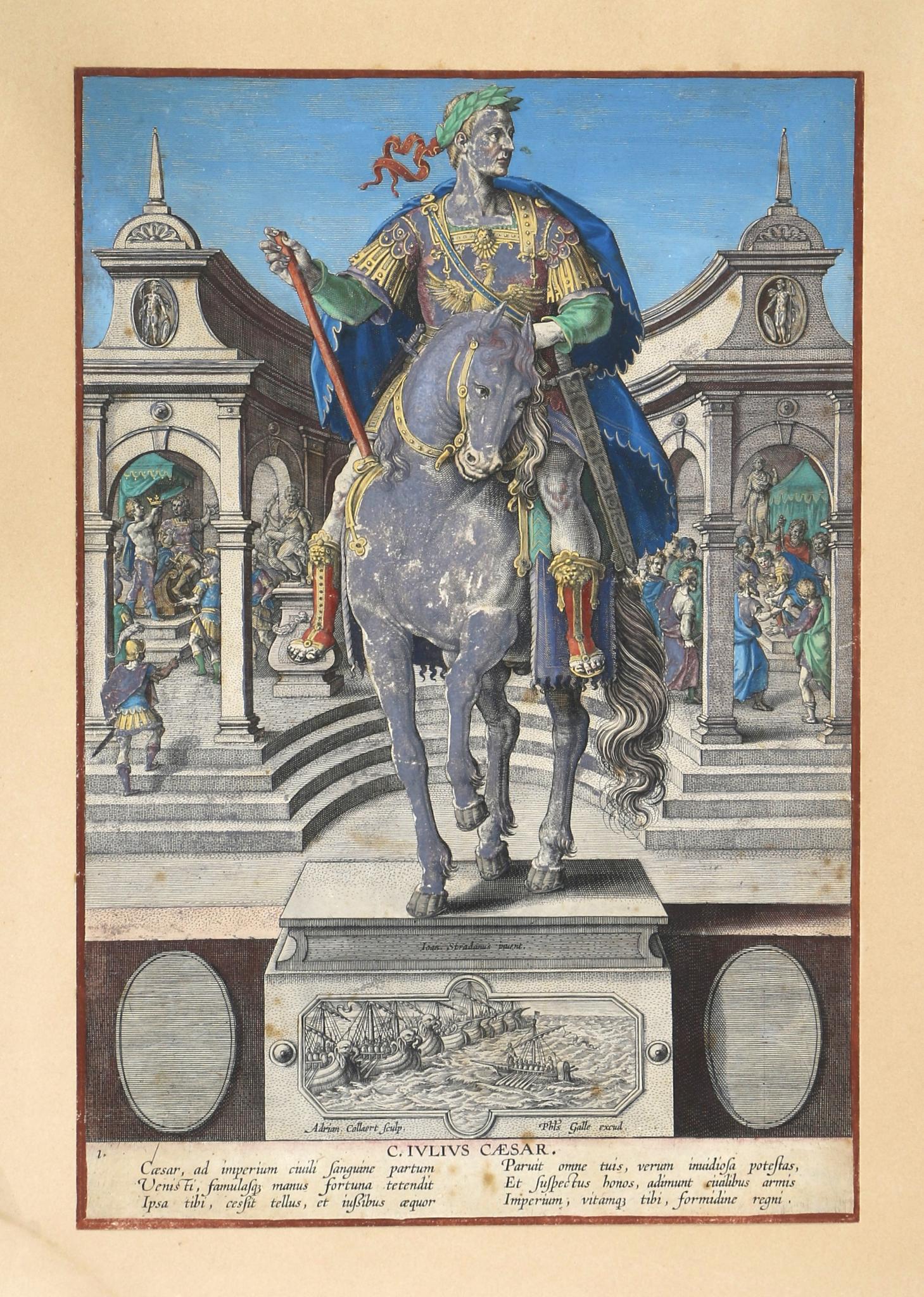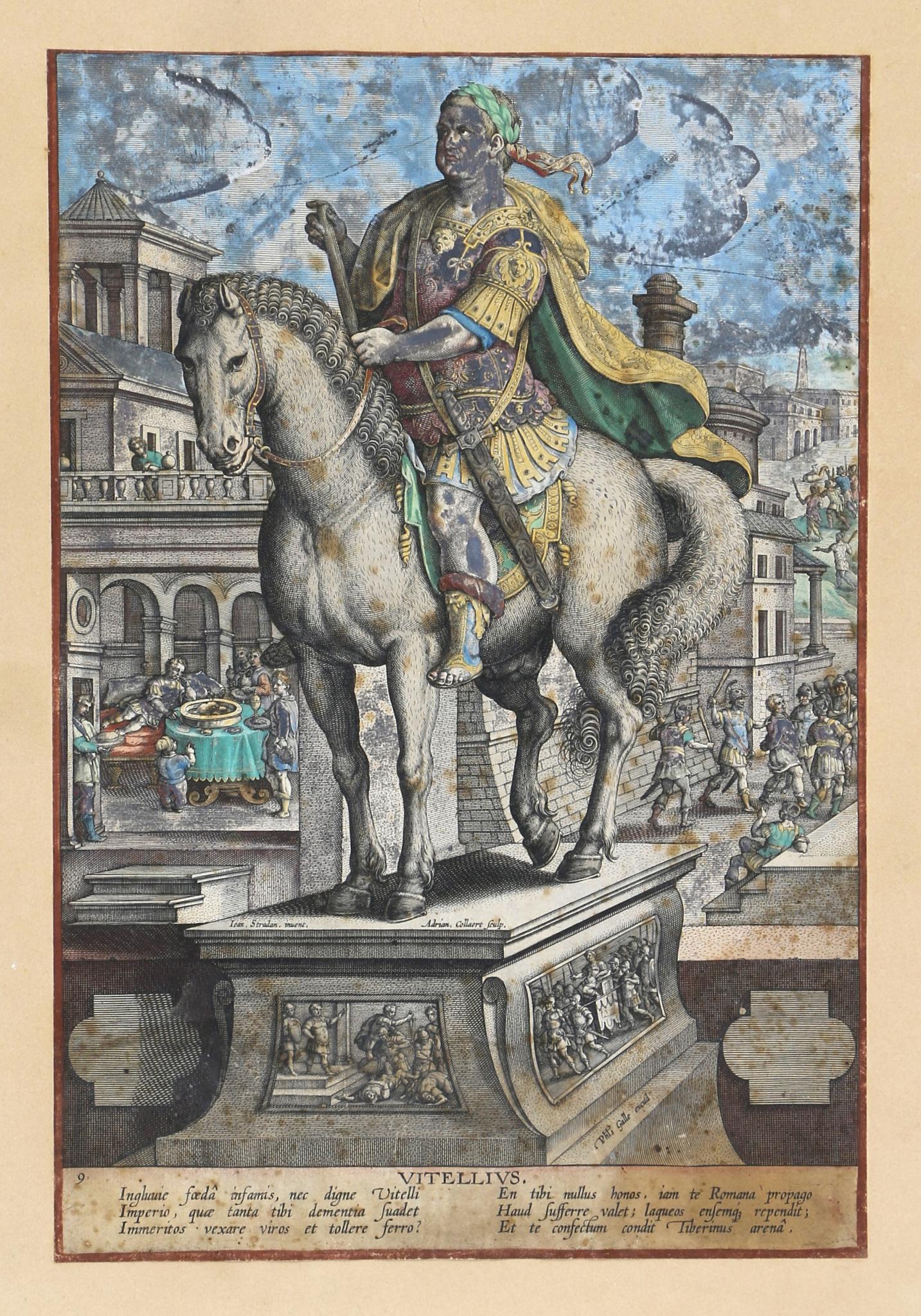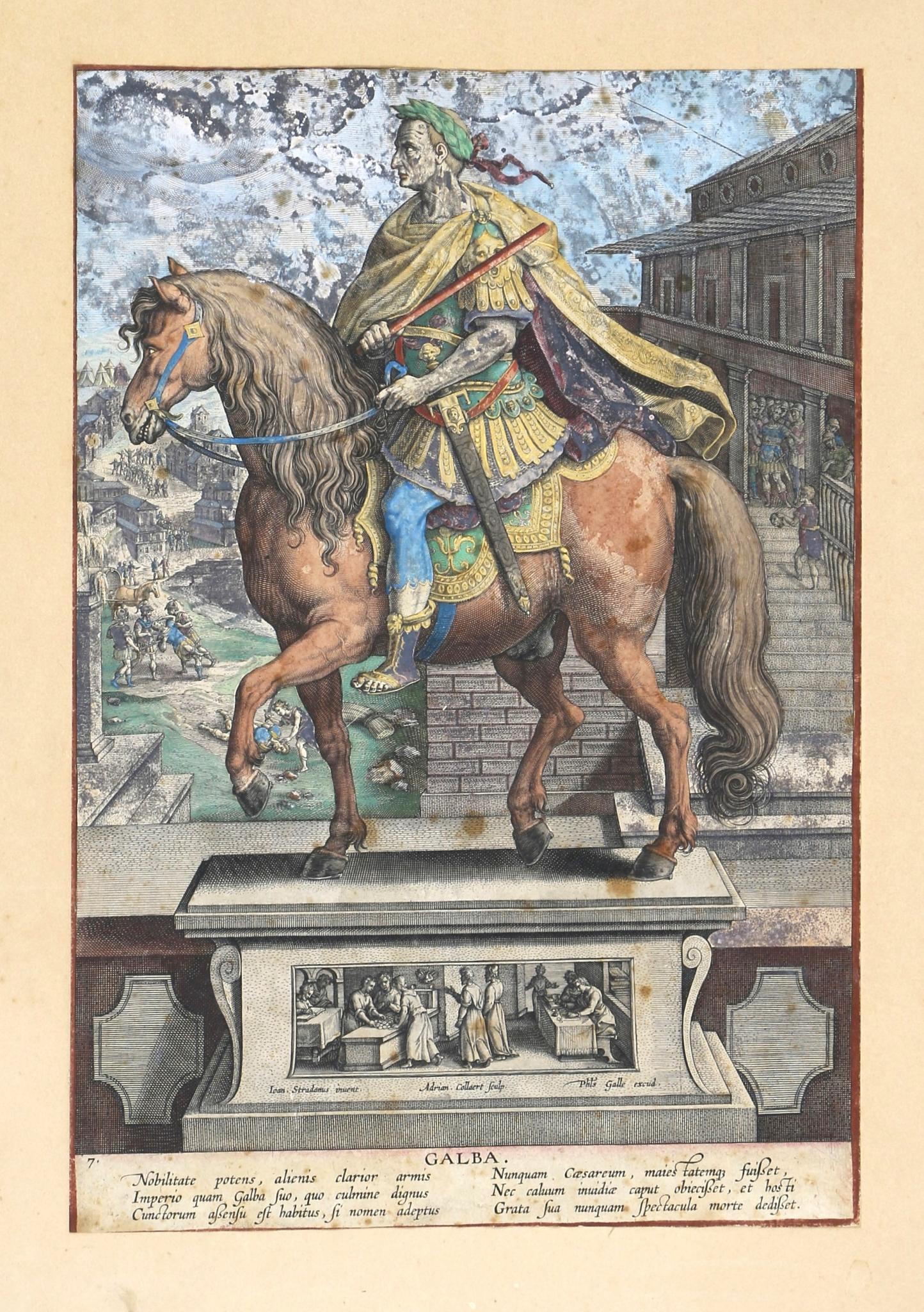 Tizenkét római császár lovasszobrát ábrázoló metszetsorozat. Adriaen Collaert (1560-1618 körül) metszete Jan van der Straet, más néven Stradanus (1523-1605) munkája után. Kiadta Philip Galle Antwerpenben. A sorozat tizennégy metszetből áll, melyből jelen kollekció a következő tizet tartalmazza: 1. Julius Caesar, 2. Augustus, 5. Claudius, 7. Galba, 8. Otho, 9. Vitellius, 10. Vespasianus, 11. Titus, 12. Domitianus, 13. Iulius Caesar diadalmenete.