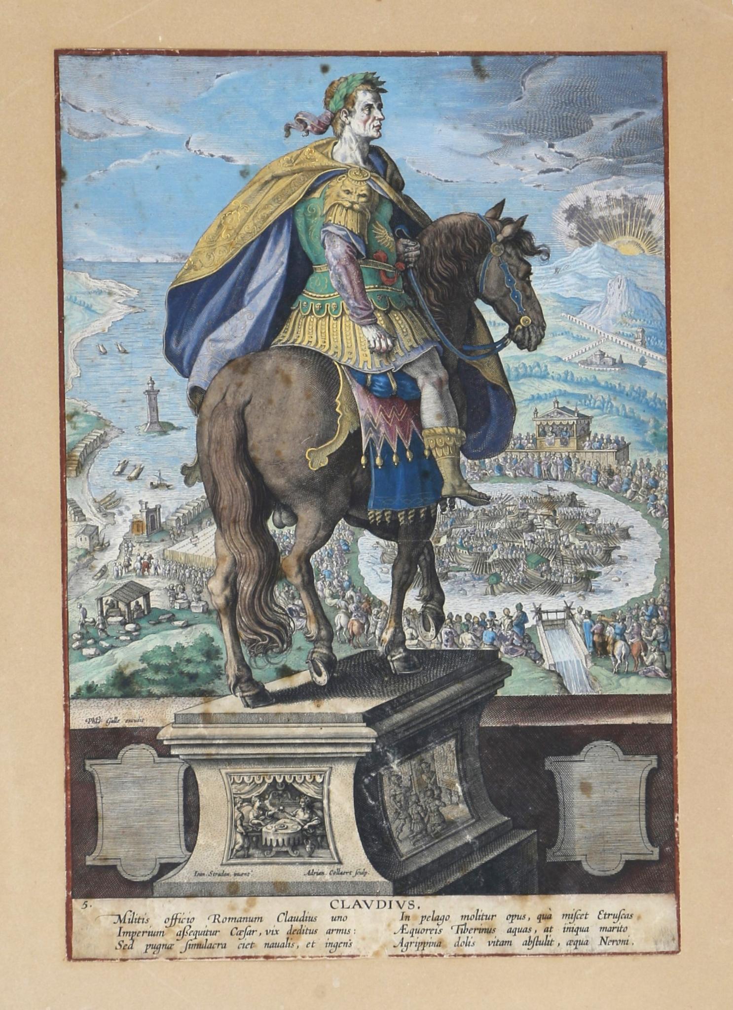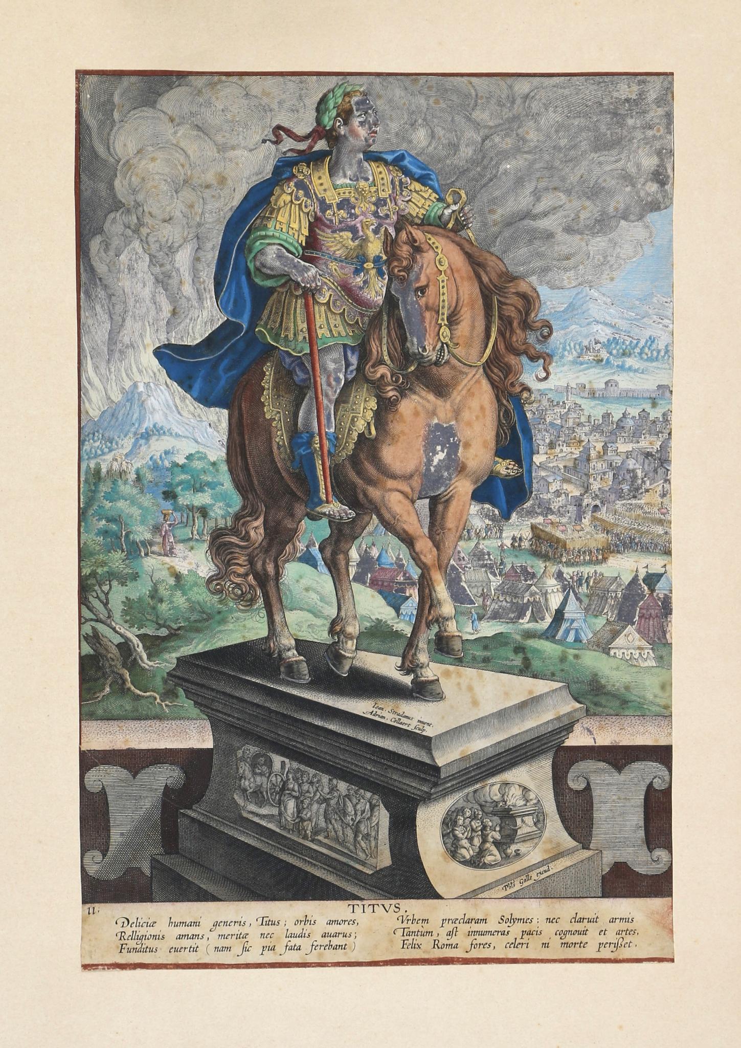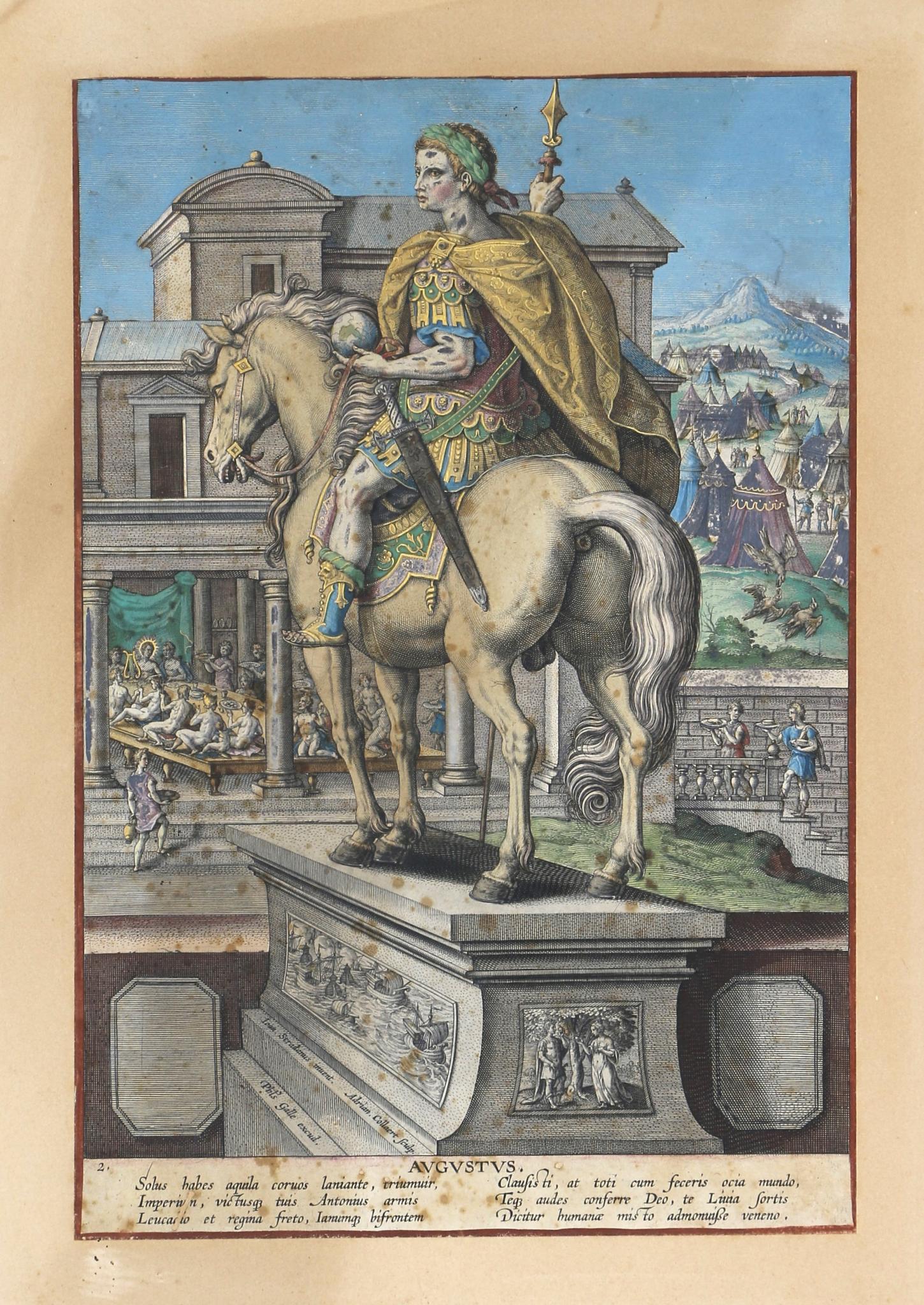 Tizenkét római császár lovasszobrát ábrázoló metszetsorozat. Adriaen Collaert (1560-1618 körül) metszete Jan van der Straet, más néven Stradanus (1523-1605) munkája után. Kiadta Philip Galle Antwerpenben. A sorozat tizennégy metszetből áll, melyből jelen kollekció a következő tizet tartalmazza: 1. Julius Caesar, 2. Augustus, 5. Claudius, 7. Galba, 8. Otho, 9. Vitellius, 10. Vespasianus, 11. Titus, 12. Domitianus, 13. Iulius Caesar diadalmenete.