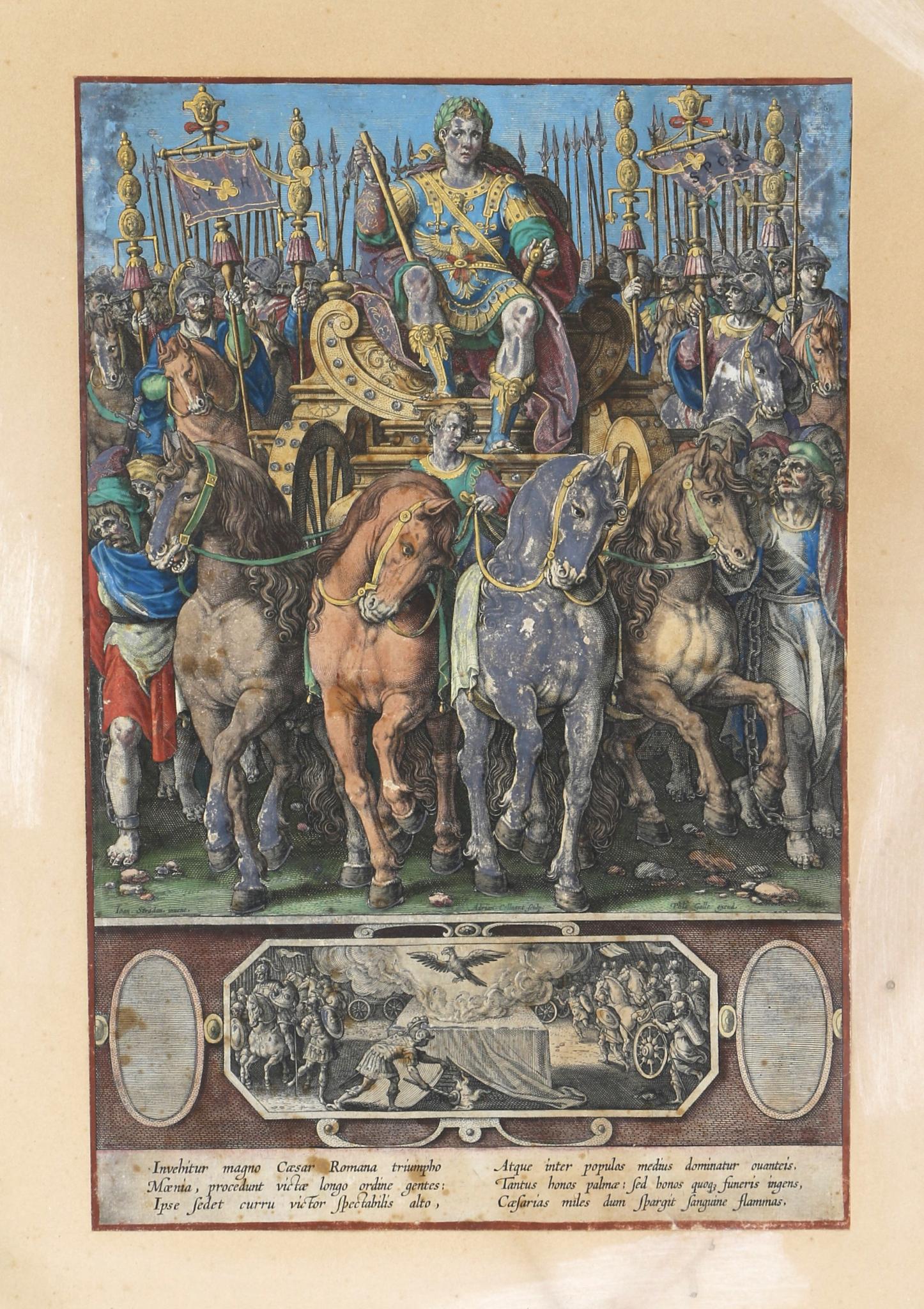 Plate 13: the triumph of Iulius Caesar, in the bottom with a scene of Caesar's burial and apotheosis.