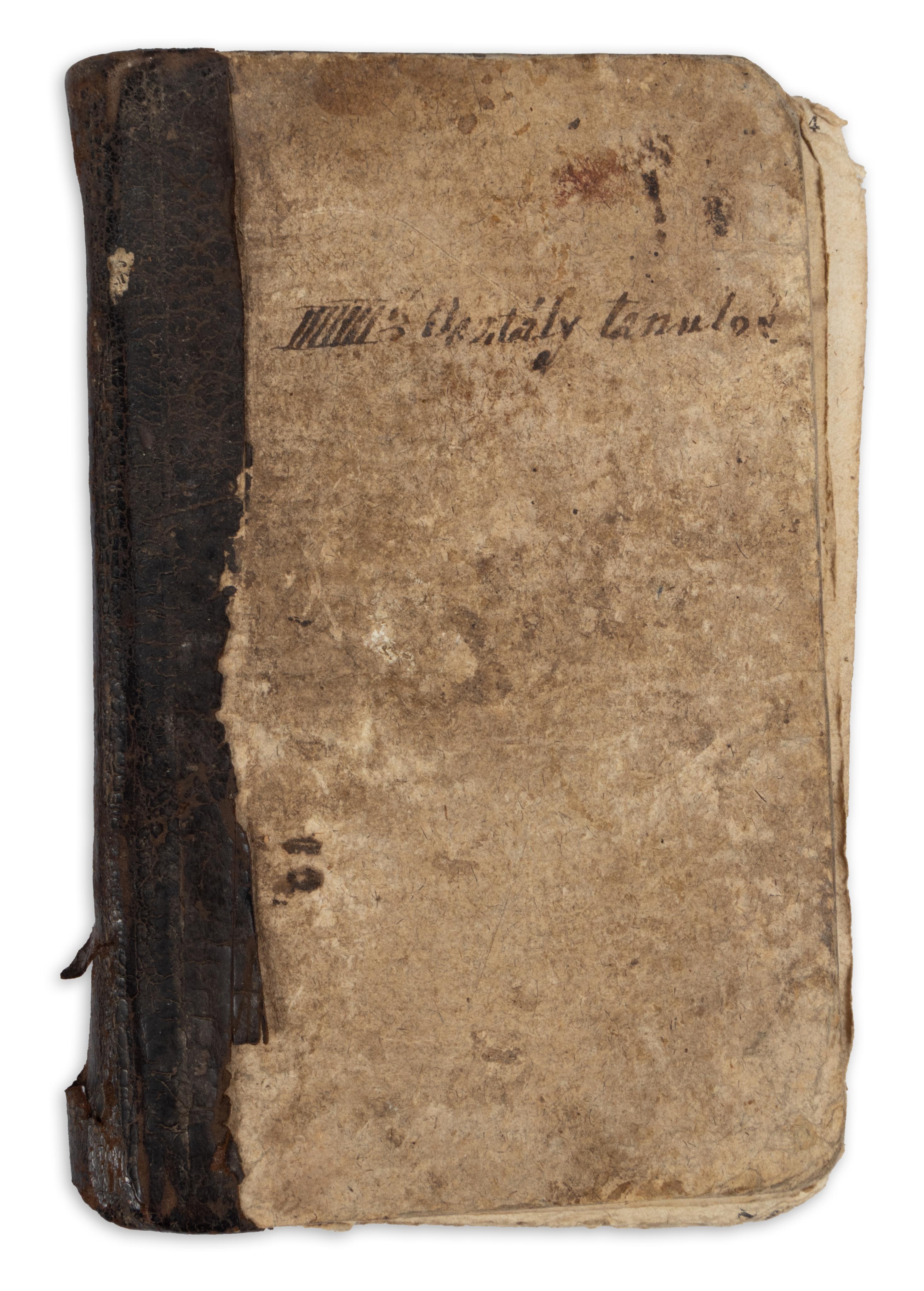 Trilingual dictionary. A heavily worn copy. The cardboard binding is torn, the title page is incomplete, four pages are also missing, and the pages are stained. With numerous name entries.