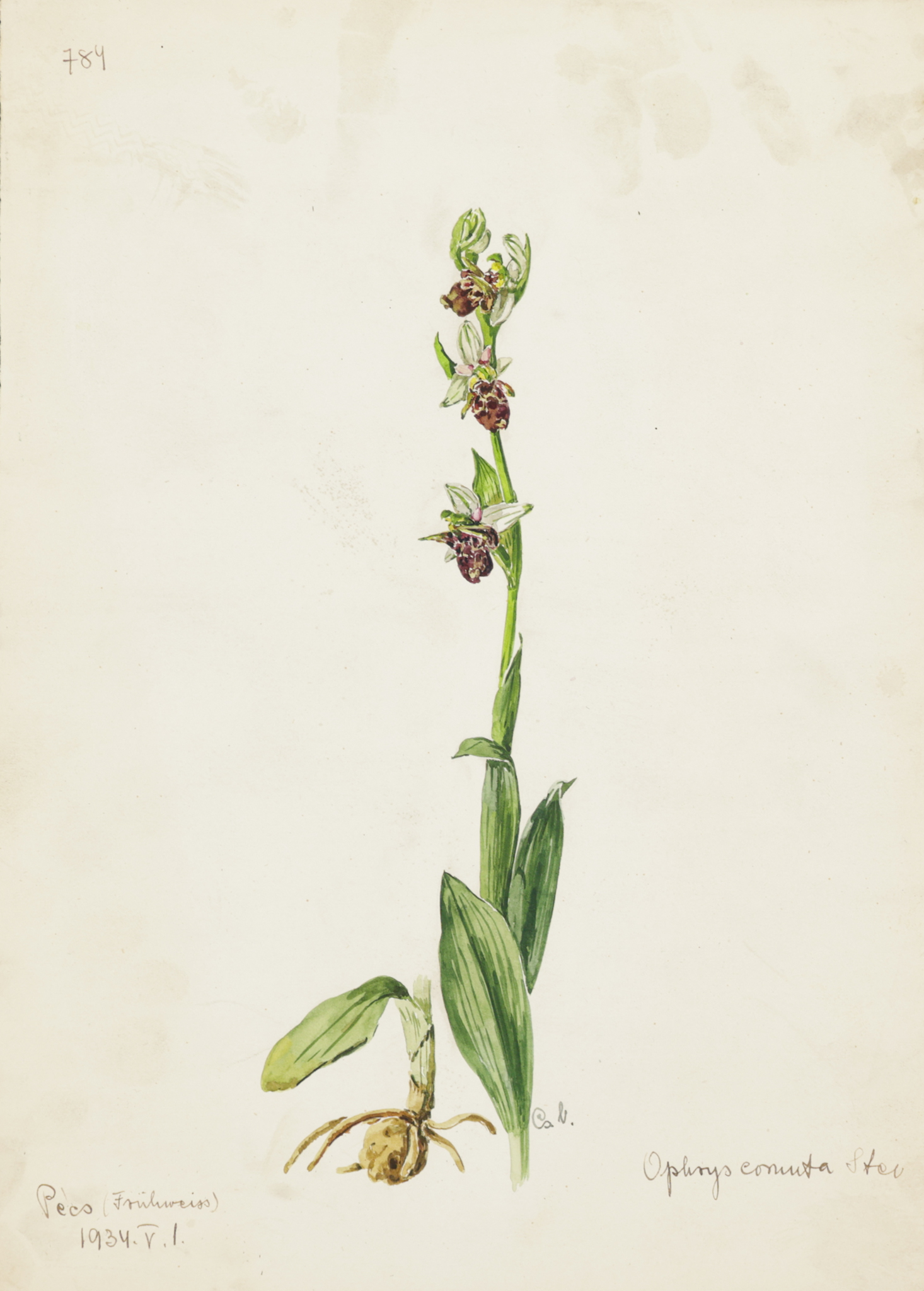 Csapody Vera Ophrys scolopax subsp. cornuta, "szarvas bangó". Colour tempera, dated and signed by the artist.