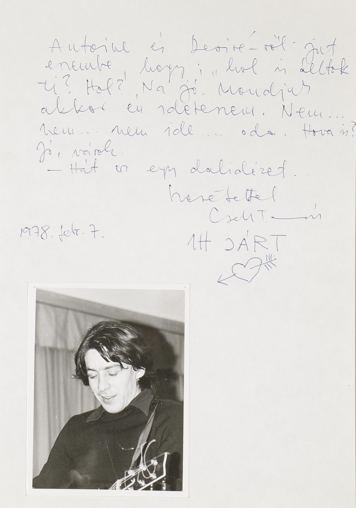 Cseh Tamás vendégkönyvi bejegyzése: “Antoine és Desiré-ről jut eszembe, hogy; hol is álltok ti? Hol? Na jó. Mondjuk akkor én ideteszem. Nem… nem… nem ide… oda. Hova is? Jó, várok. - Hát ez egy dalidézet. Szeretettel Cseh Tamás 1978. febr. 7.”