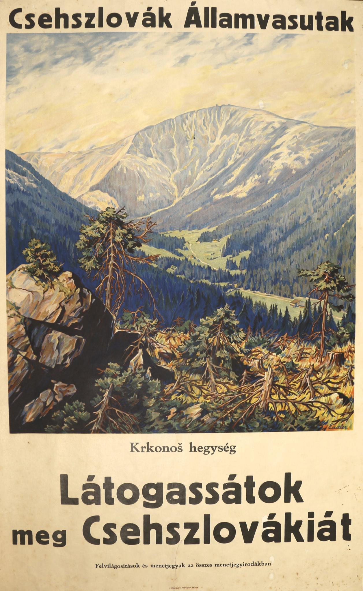 A Csehszlovák államvasutak idillikus reklámplakátján az Óriás-hegység (Krkonoše), a Szudéták legmagasabb pontja látható.