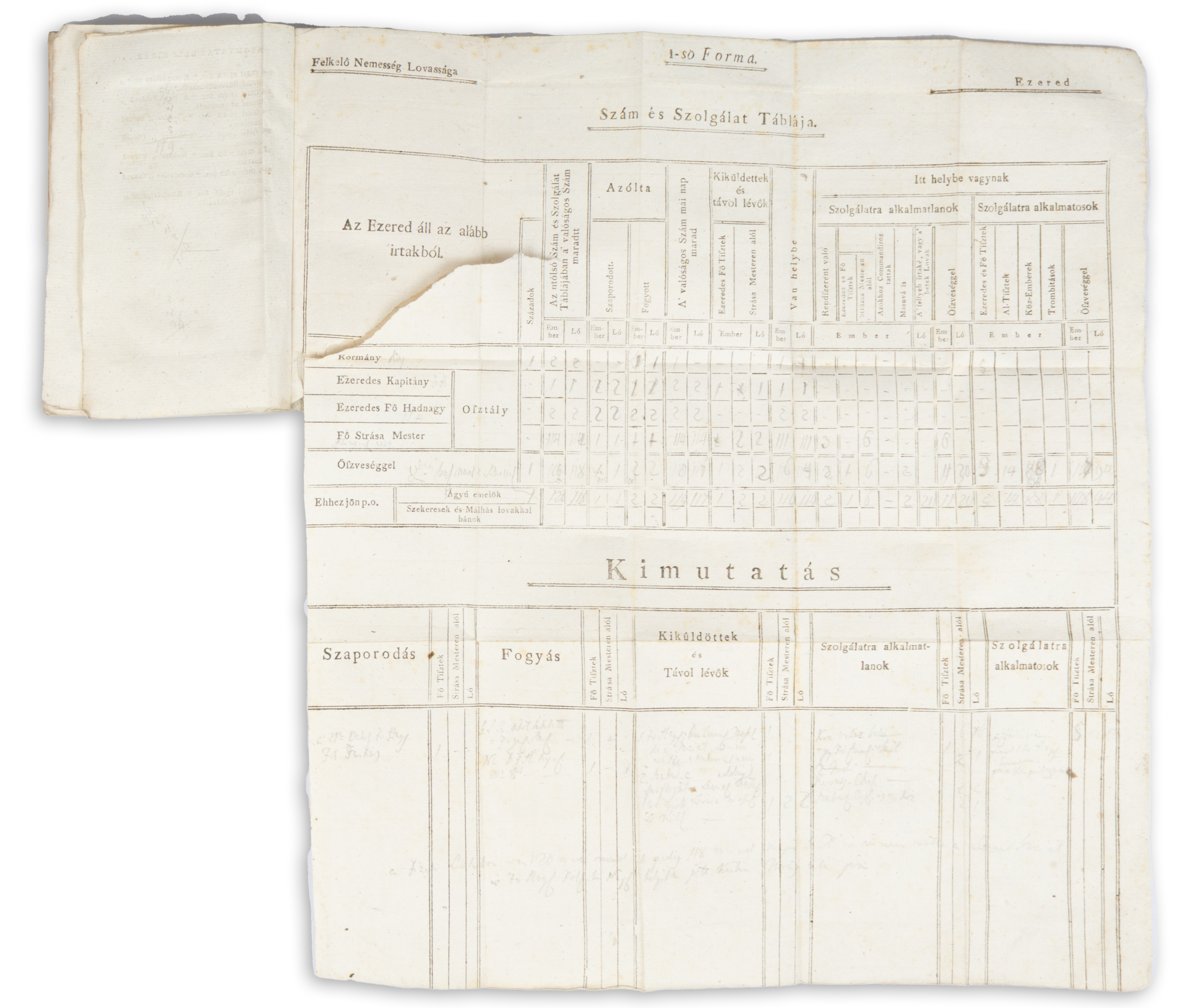 [2] + 112 + 8 + [3] p. + 4 kihajt. mell. (egyik szakadt, ceruzás beírással) A végén magyar-német katonai szakszótár.