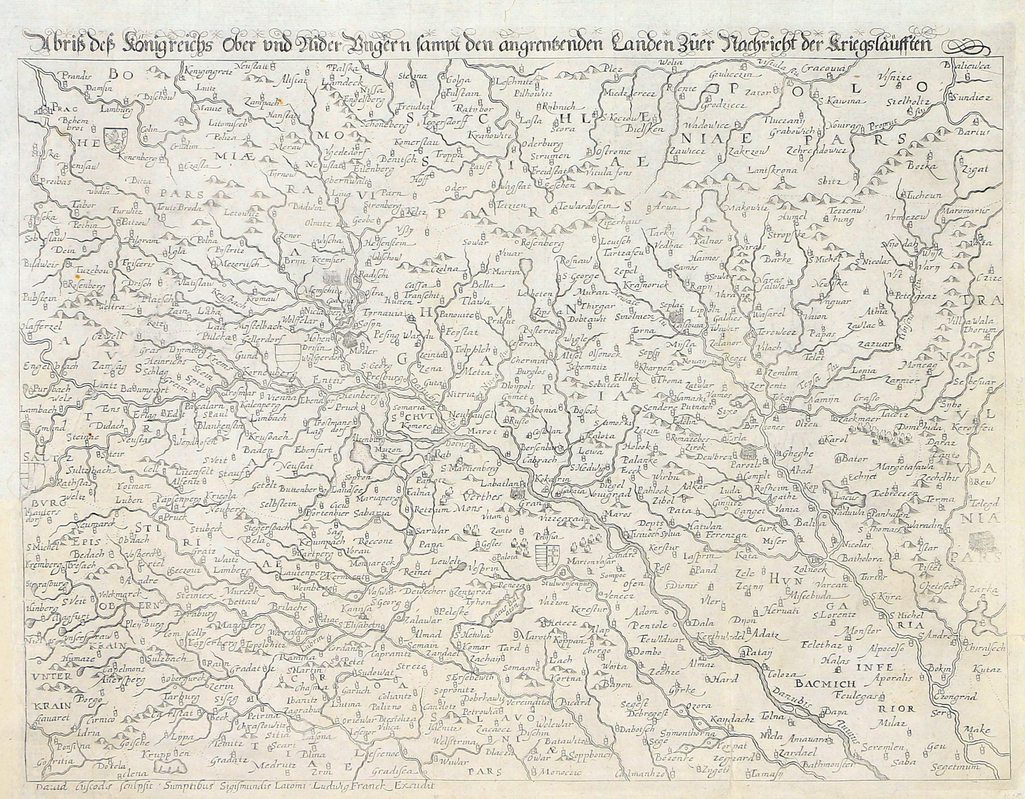 Magyarország David Custos által készített, rézmetszetű térképe az 1619. évi hadiesemények szemléltetésére, amely Nicolaus Bellus Osterreichischer Lorberkrantz… című munkájában jelent meg (Frankfurt/M. 1625(?)).