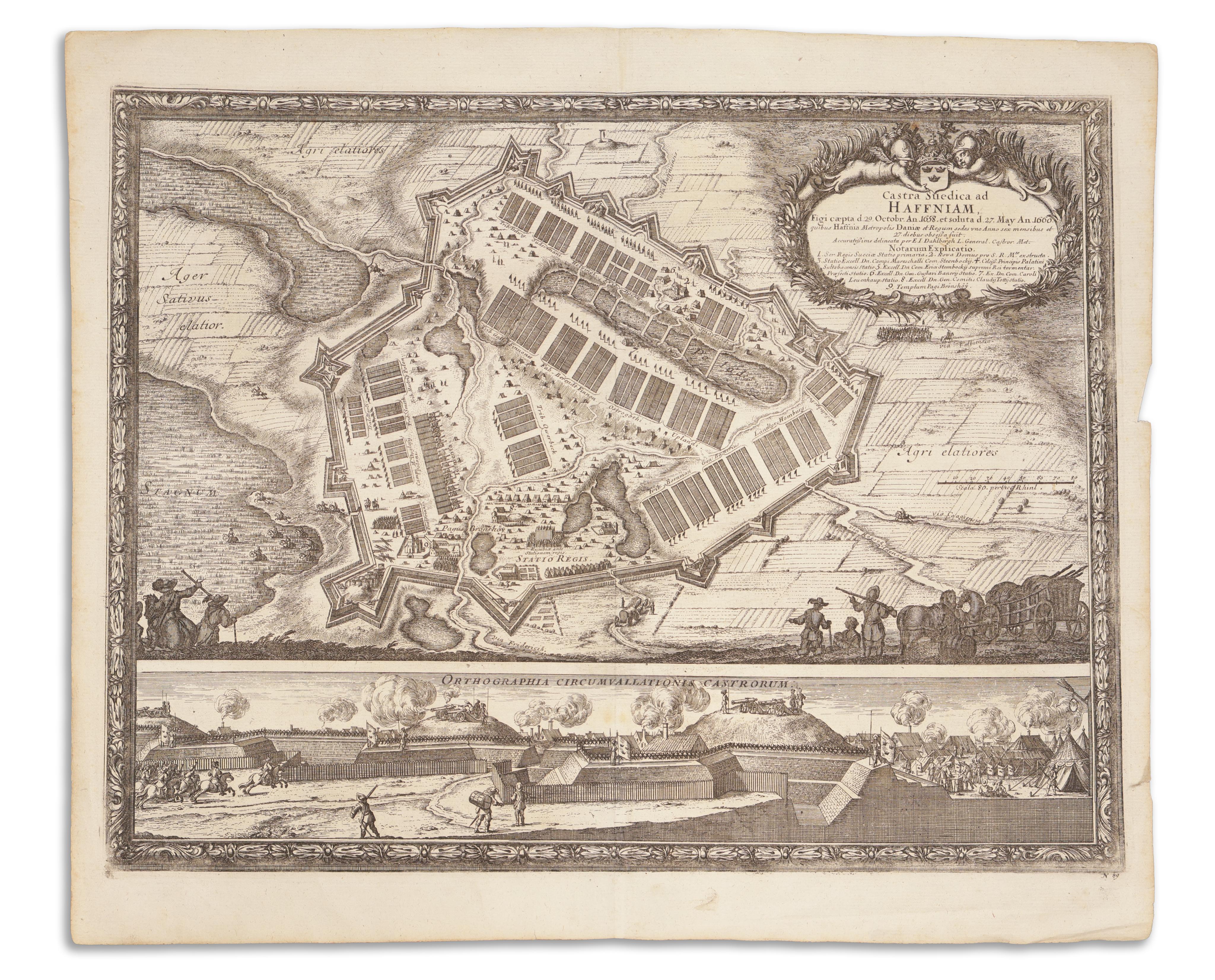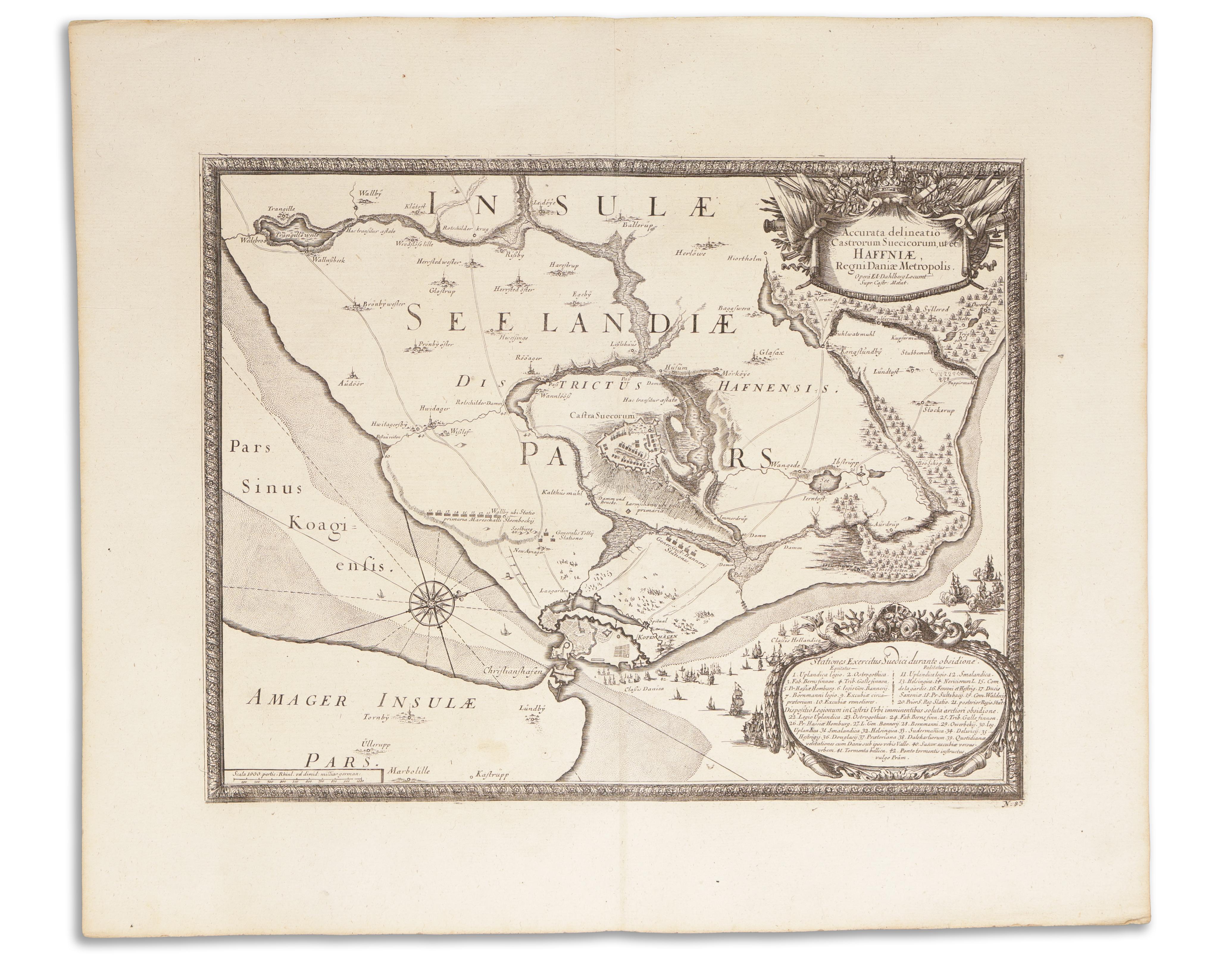 Castra Suedica ad Haffniam : figi cæpta d. 29. Octobr. An. 1658. et soluta d. 27. May An. 1660. quibus Haffnia Metropolis Daniæ et regum sedes vno Anno sex mensibus et 27. diebus obsessa fuit. Title (alt.): Orthographia circumvallationis castrorum. [1696], [Nuremberg], [Sumptibus Christophori Riegelij]. Cartographer: Dahlbergh, Erik Jönsson. Includes foreground illustration, references, decorative title cartouche and decorative border. Table 89 of Pufendorf's work.