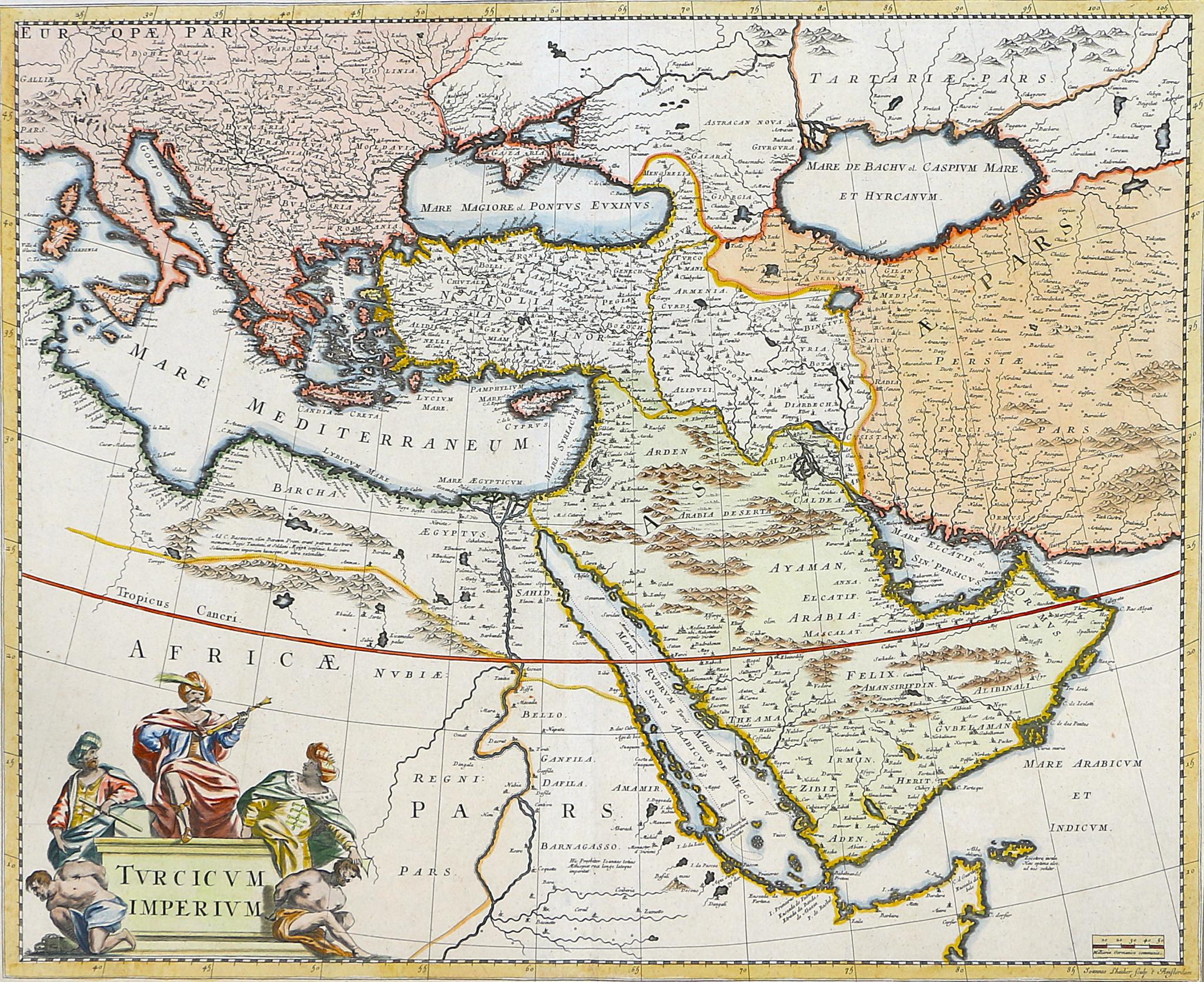 1670 AmsterdamAz Oszmán Birodalom térképe, amely A Szent Liga háborúja (1683-1699) előtti állapotot mutatja be. A térképen a birodalom a Földközi-tenger keleti részétől, Görögországtól és Olaszországtól nyugaton Szaúd-Arábiáig, a Perzsa-öbölig és a Kaszpi-tengerig terjedt keleten, Törökországgal és Ciprussal a középpontban (lásd még: Közel-Kelet, Szentföld, Kis-Ázsia). A díszes kartus pazar török stílusú ruhába öltözött alakokat ábrázol.