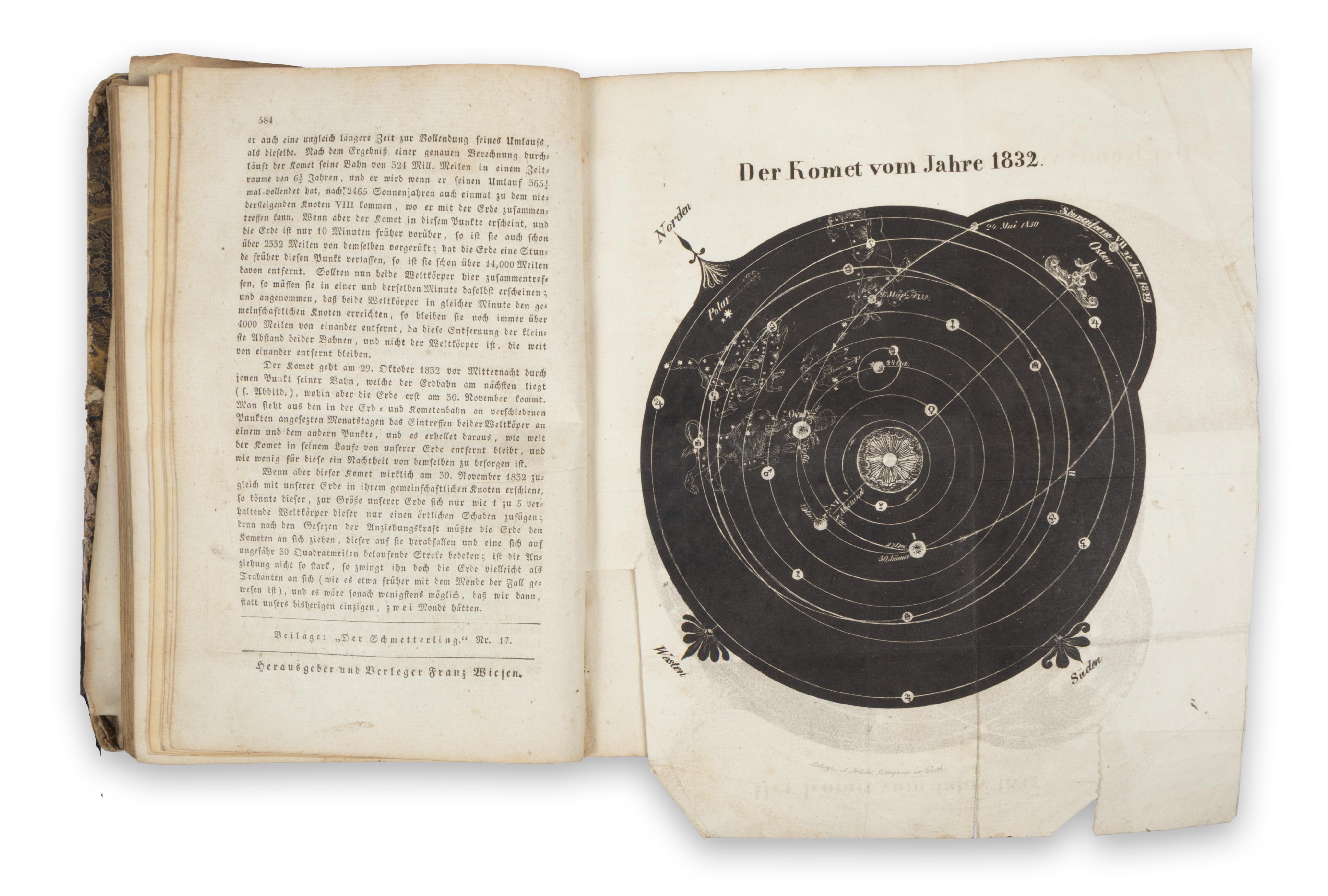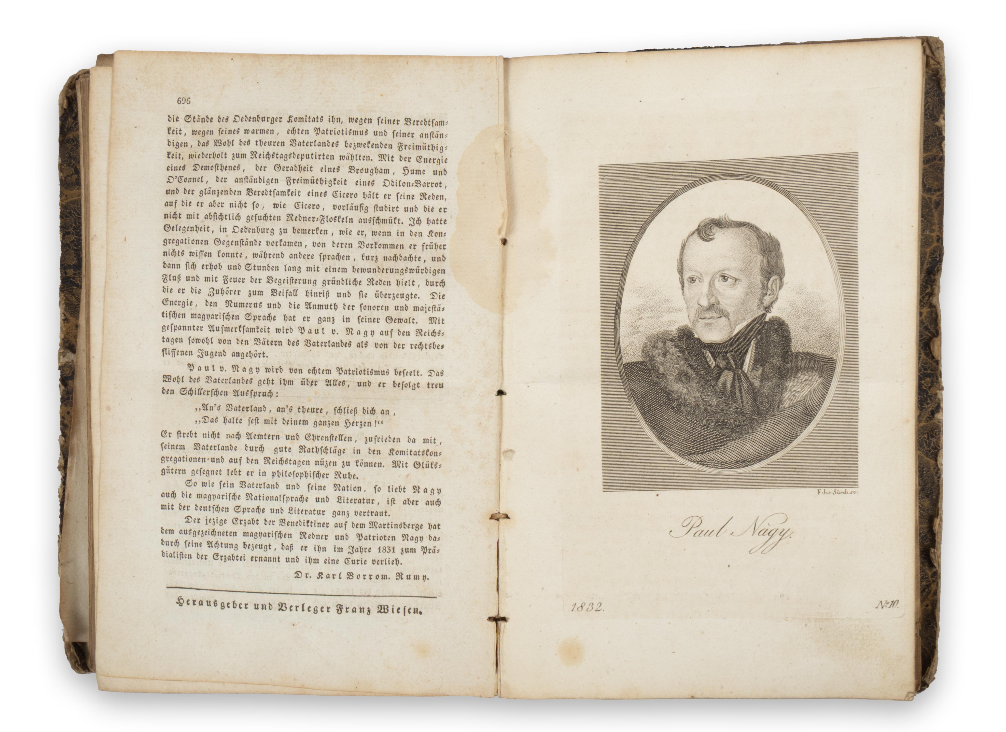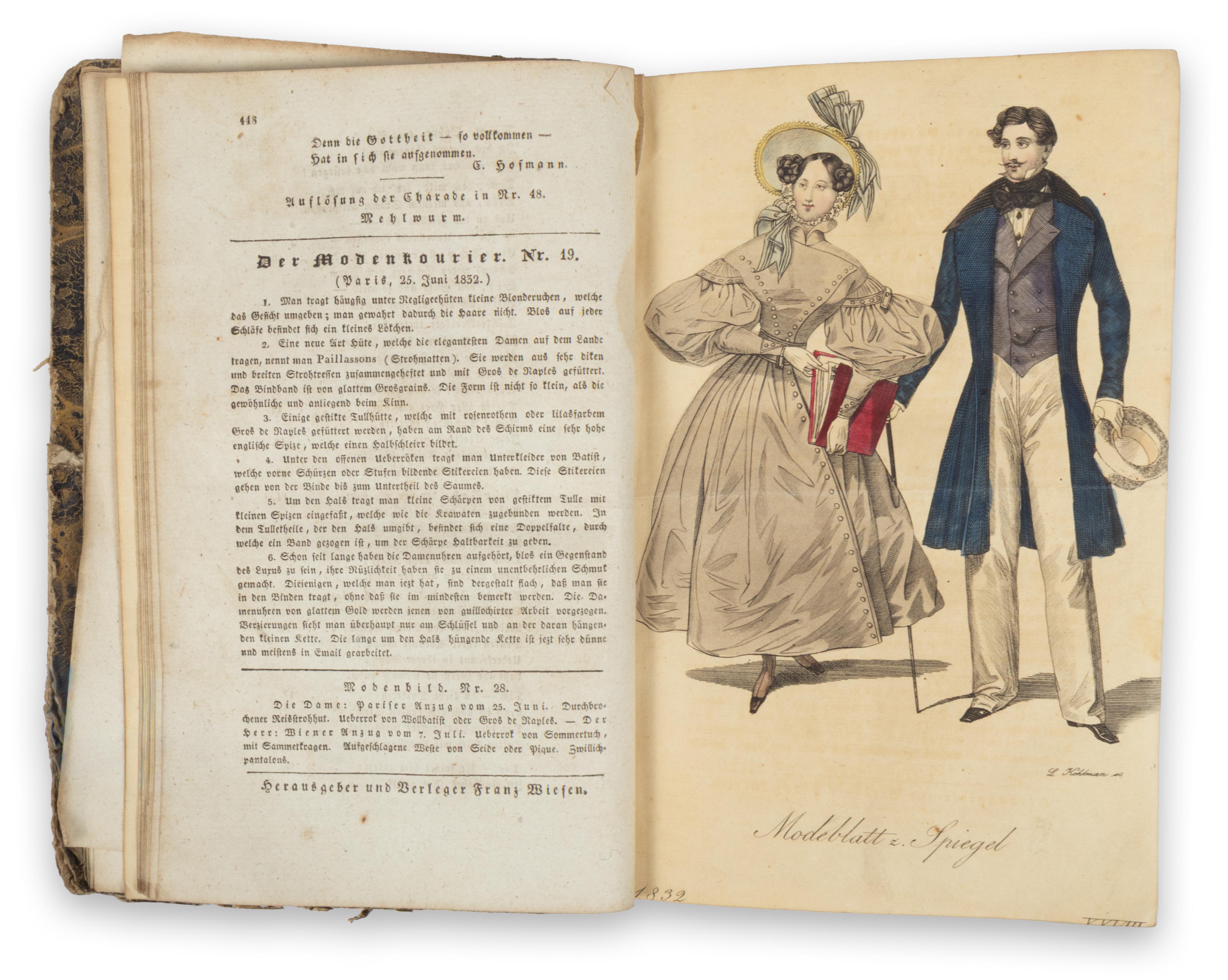 [Ofen – Buda, 1832, Franz Wiesen.]Herausgegeben und verleger Franz Wiesen. [A művészet, az elegancia és a divat tükre.] 417- 828 p. + 29 lith. t. Ebből 22 színes divatkép, 5 ff. portré és 1 kihajt. mell. A portrék közül magyar érdekeltségű Felsőbüki Nagy Pál politikus, MTA tag és Ragályi Tamás politikus, MTA tag, valamint Otto görög király, Gerard marsall és V. Henrik herceg. A mellékleten az 1832. évi üstökös metszete. Korabeli irodalmi, kulturális és művészeti írásokkal.
