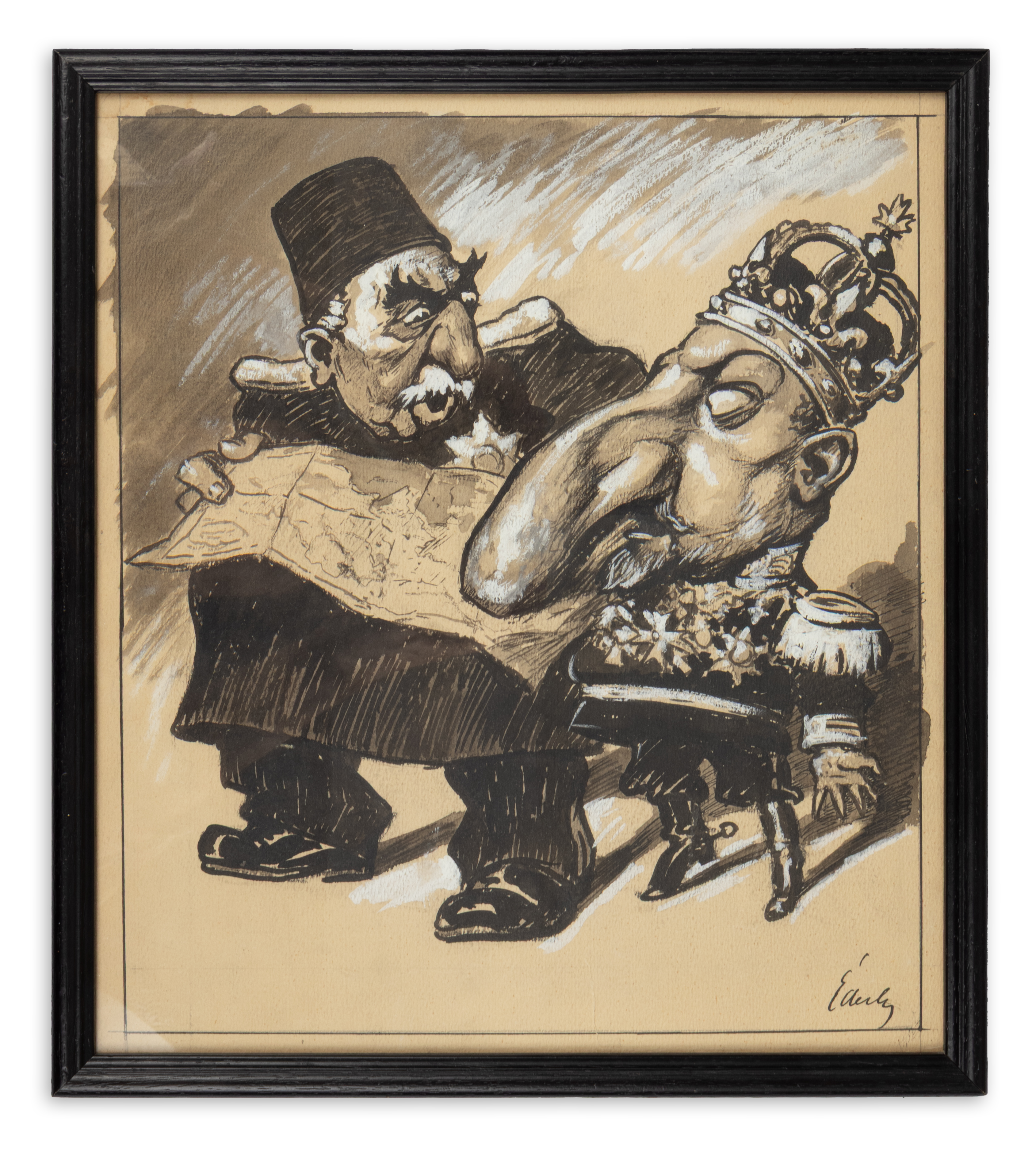 Caricature of Sultan Mehmed V. and Bulgarian Tsar Ferdinand I. The original drawing by painter and graphic artist Gyula Éder (1875-1945) was published in the 1912. X. 6-iki issue of the humor magazine Kakas Márton.