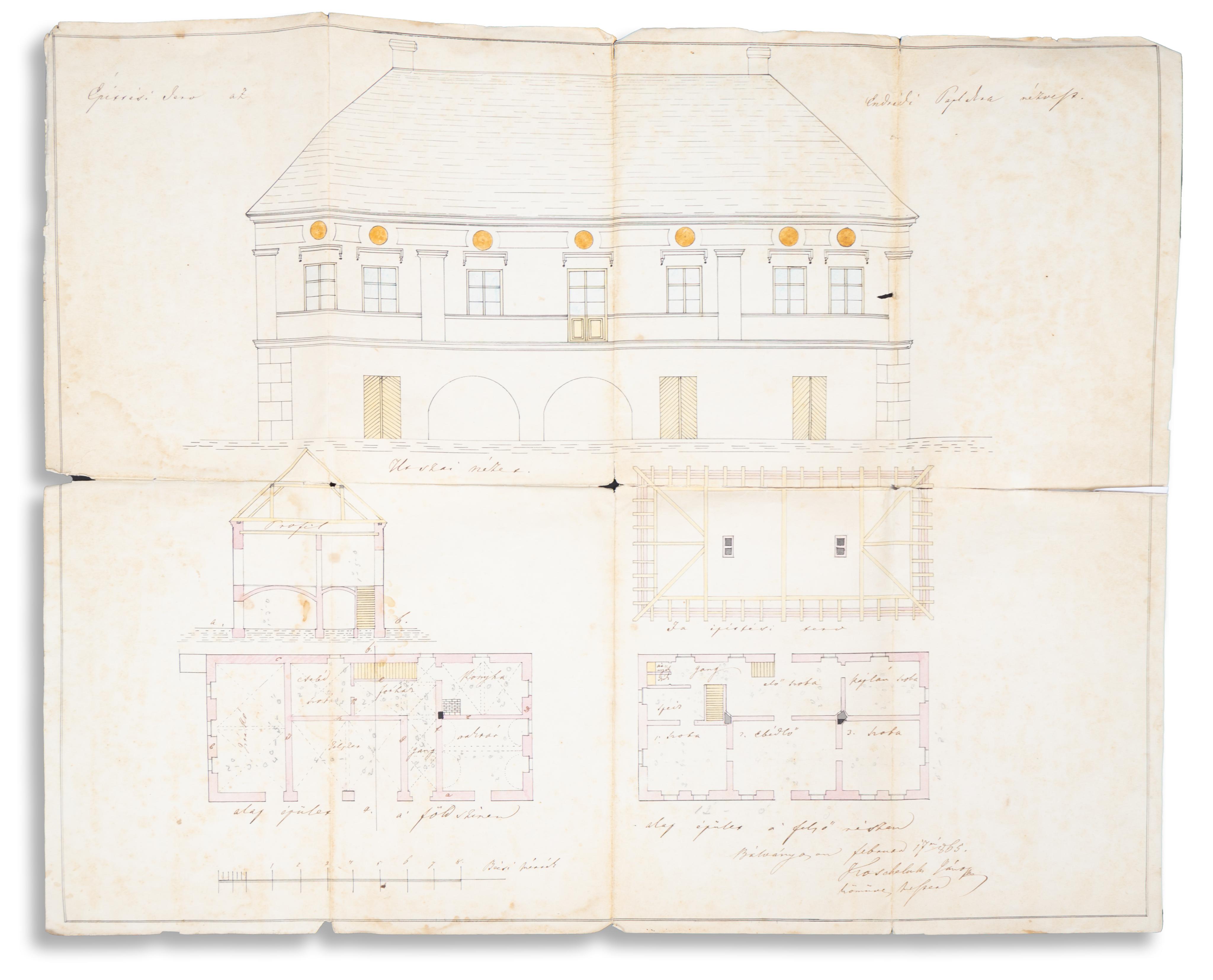 Színezett kézirajz, metszetekkel, pár szavas tintás magyarázattal. Földszint, emelet, Utcai nézet felülnézet és homlokzat.