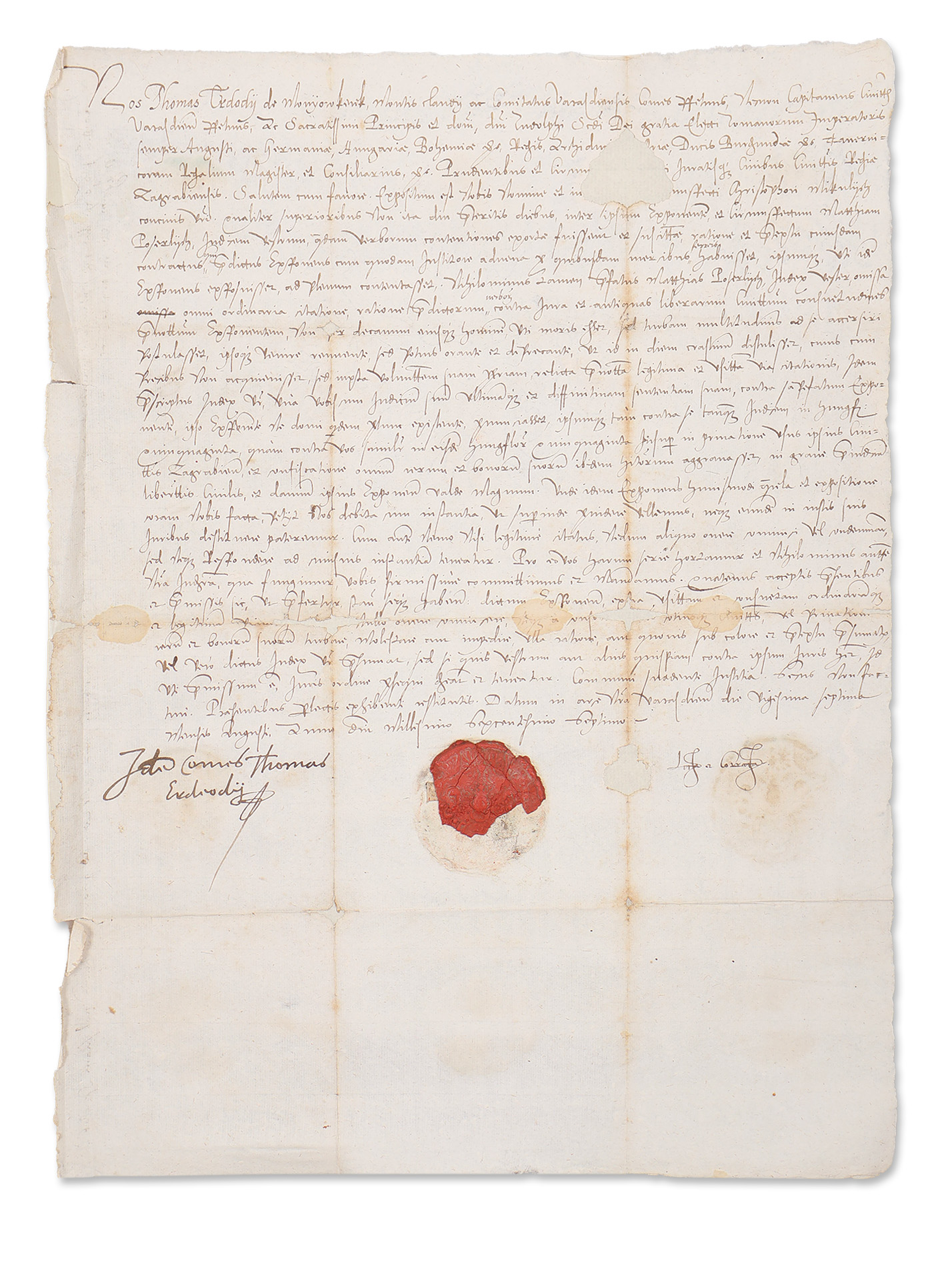 Paper, restored, in Latin, with the signature of Tamás Erdődy and a fragment of his wax seal.
