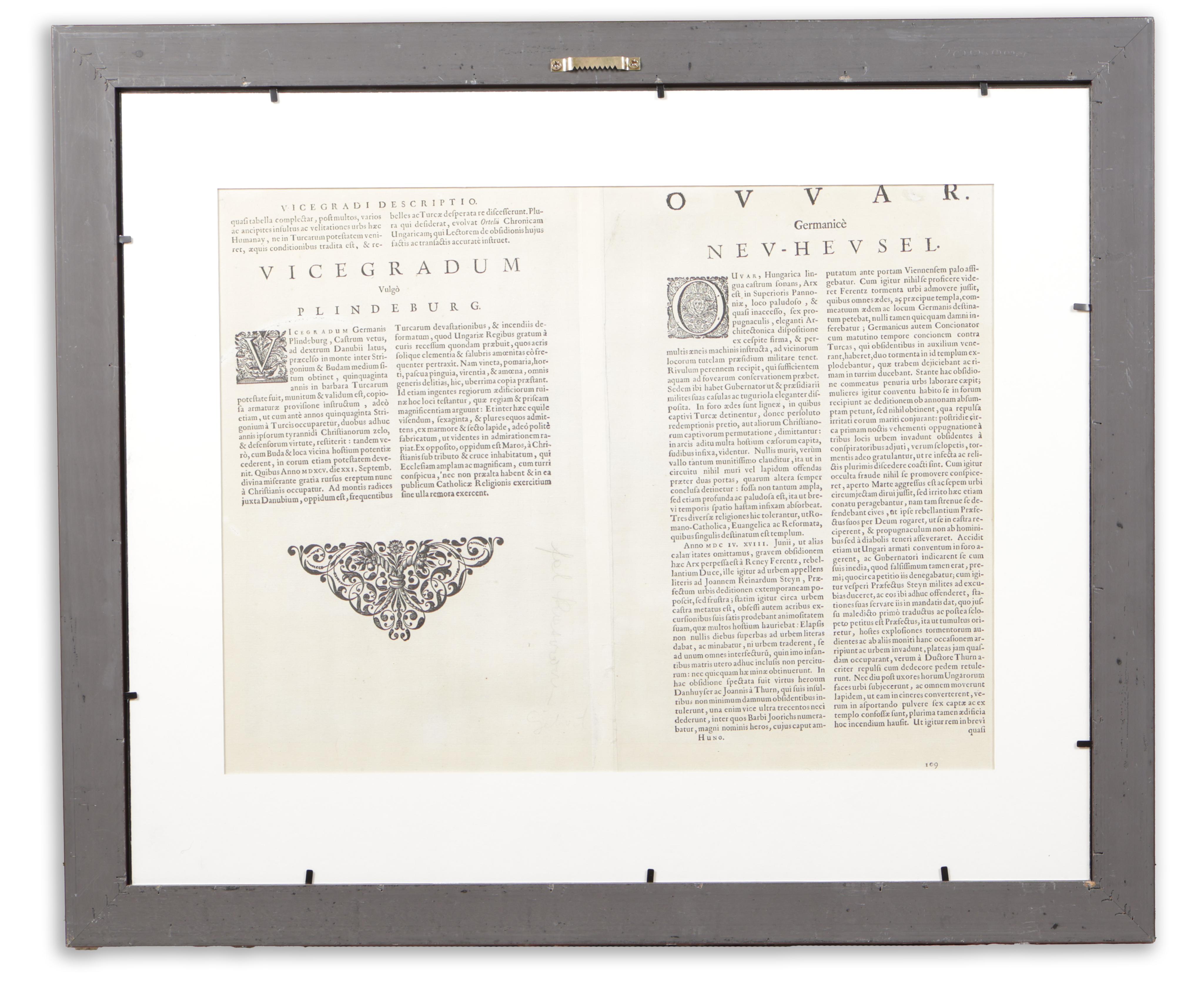 Köln, ca 1617.Érsekújvár és Visegrád rézmetszetű látképe kétosztatú, közös lapon. A rajzokat Georg Hoefnagel fia, Jakob készítette 1595-ben. Georg Braun és Frans Hogenberg monumentális díszműve, a „Civitates orbis terrarum” V. kötetének 56. lapján jelent meg (Köln, 1617).