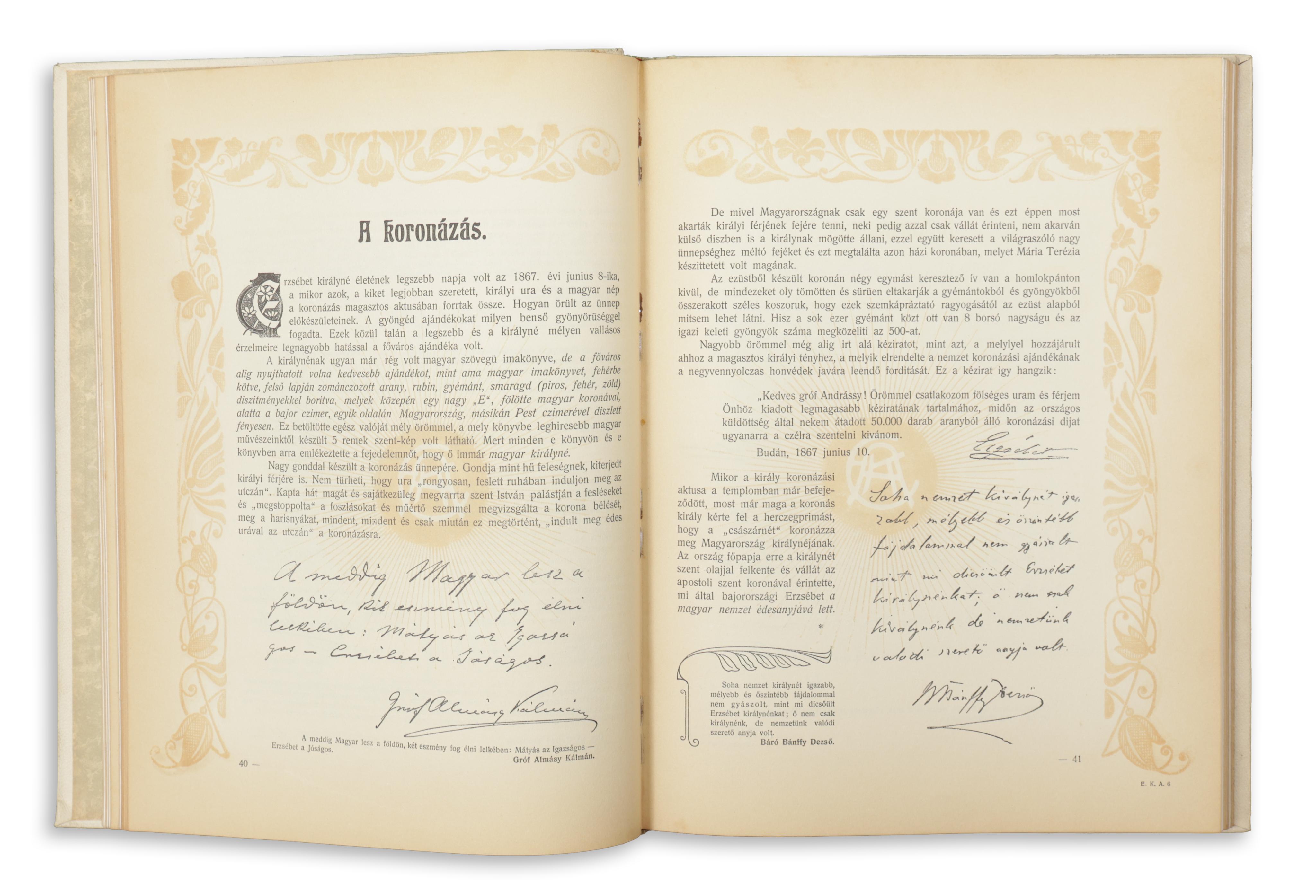 Gazdagon illusztrált, keretdíszes lapokkal, számos hasonmás levéllel és aláírással. Kiadói festett egészvászon - Gottermayer - díszkötés. Első előzéklapja hiányzik, egyébként szép állapotban.