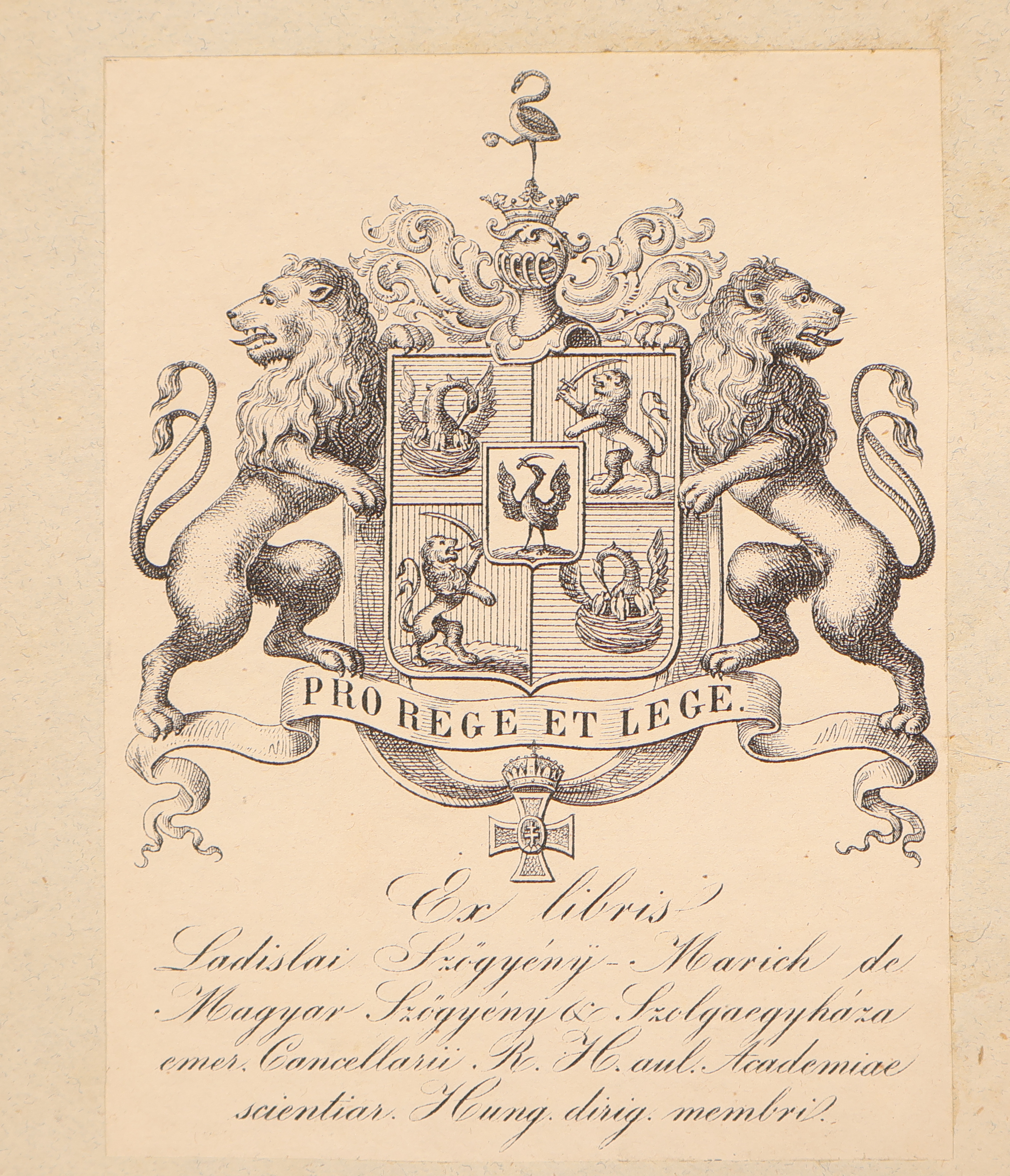 Az elülső borítók versoján Szőgyény-Marich László (1806–1893), jogász, politikus, az MTA ig. tanácsának tagja, az Aranygyapjas rend lovagja, címeres ex librise, „Pro rege et lege” jelmondattal.