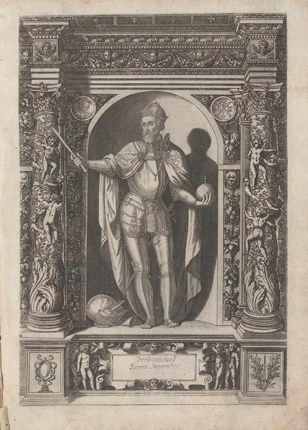 Habsburg I. Ferdinánd magyar király és német-római császár álló alakos képe, díszes fülkében. Rézmetszet és rézkarc, Dominicus Custos munkája. 1601-ben jelent meg Jacob Schrenk von Notzingen "Augustissimorum Imperatorum verissimae Imagines in celebri Ambrosiana arcis armamentario" (Oeniponti, 1601.) című művében, amely Ferdinánd főherceg ambrasi kastélyában lévő híres fegyvergyűjtemény katalógusát és bemutatását tartalmazza.