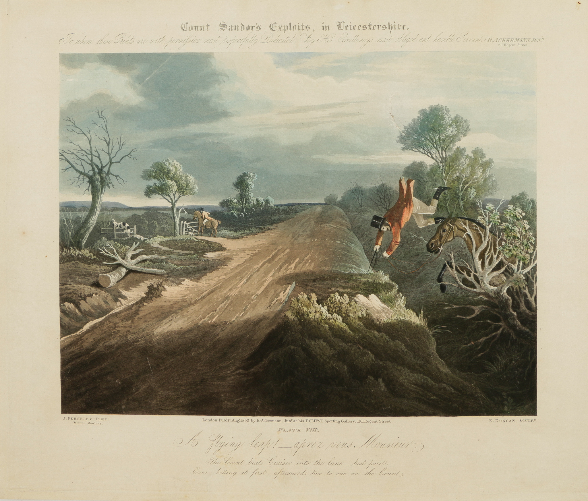 Az Ördöglovas 1833-ban másodszor járt Angliában, egy hosszabb falkavadászaton, ahol kitűnt merészségével és ügyességével. A fiatal és dúsgazdag gróf egy sokat foglalkoztatott helyi angol festőt, John Ferneley-t bízott meg tíz nagyméretű, lovasbravúrjait bemutató, olykor humoros, illetve öniróniától sem mentes festmény elkészítésével. A gróf a képekért 30 guinea-t fizetett, (összehasonlításképpen: a szezonra 1000 fontért bérelt egy angol telivér ötösfogatot). A festményeket Sándor gróf hazavitte Biára a birtokára, de előtte az eredeti képek nyomán a színes albumokra specializálódott Ackermann cég megjelentetett egy sorozatot Edward Duncan aquatintáival.