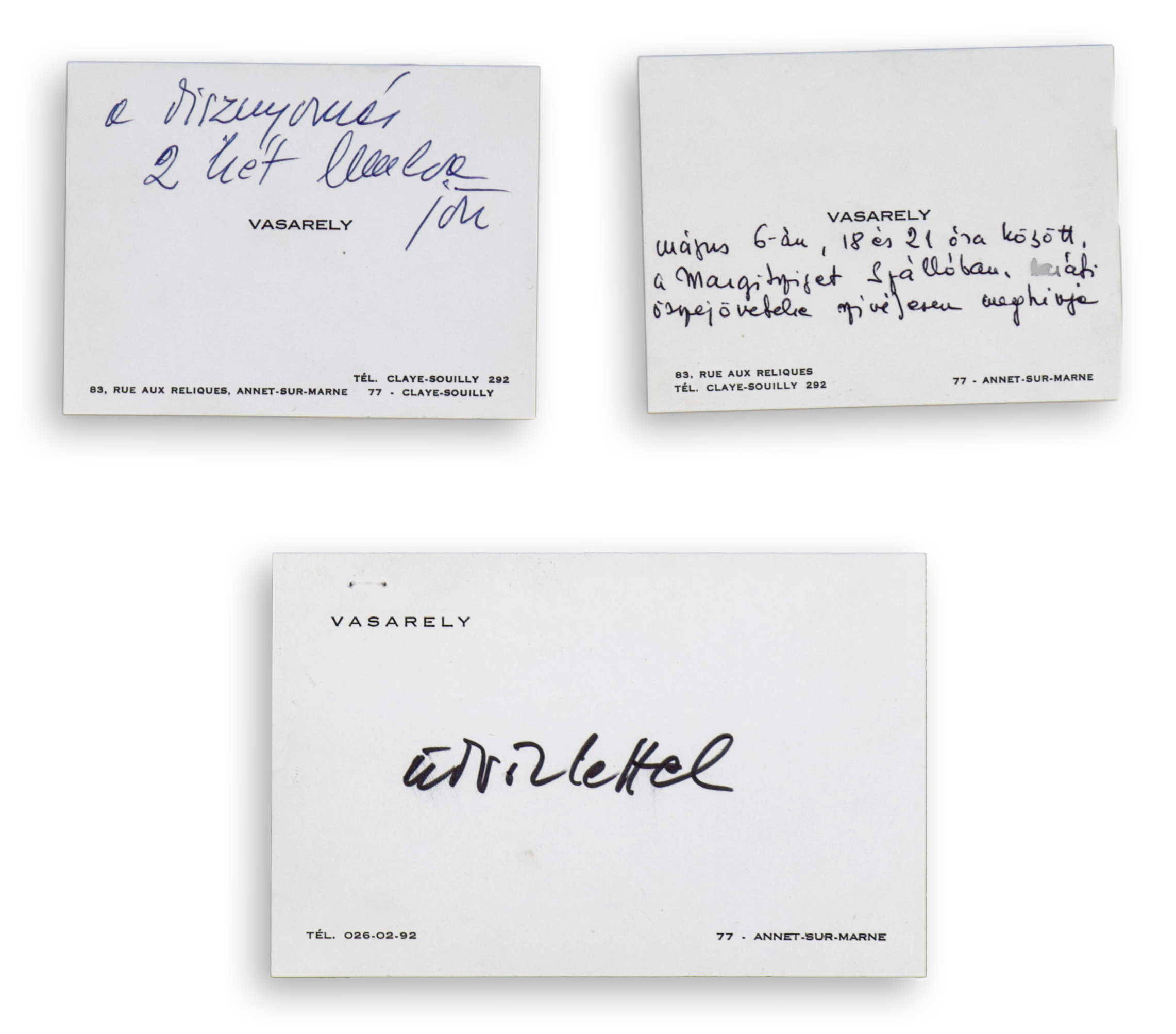 3 különböző darab Vasarely-névjegy autográf, magyar nyelvű rájegyzéssel és aláírással. Mindhárom Annet-sur-Marne-i címmel, ahová a művész 1961-ben költözött. Az egyik névjegyen Vasarely baráti összejövetelre szóló meghívója a Margit Sziget szállóba.