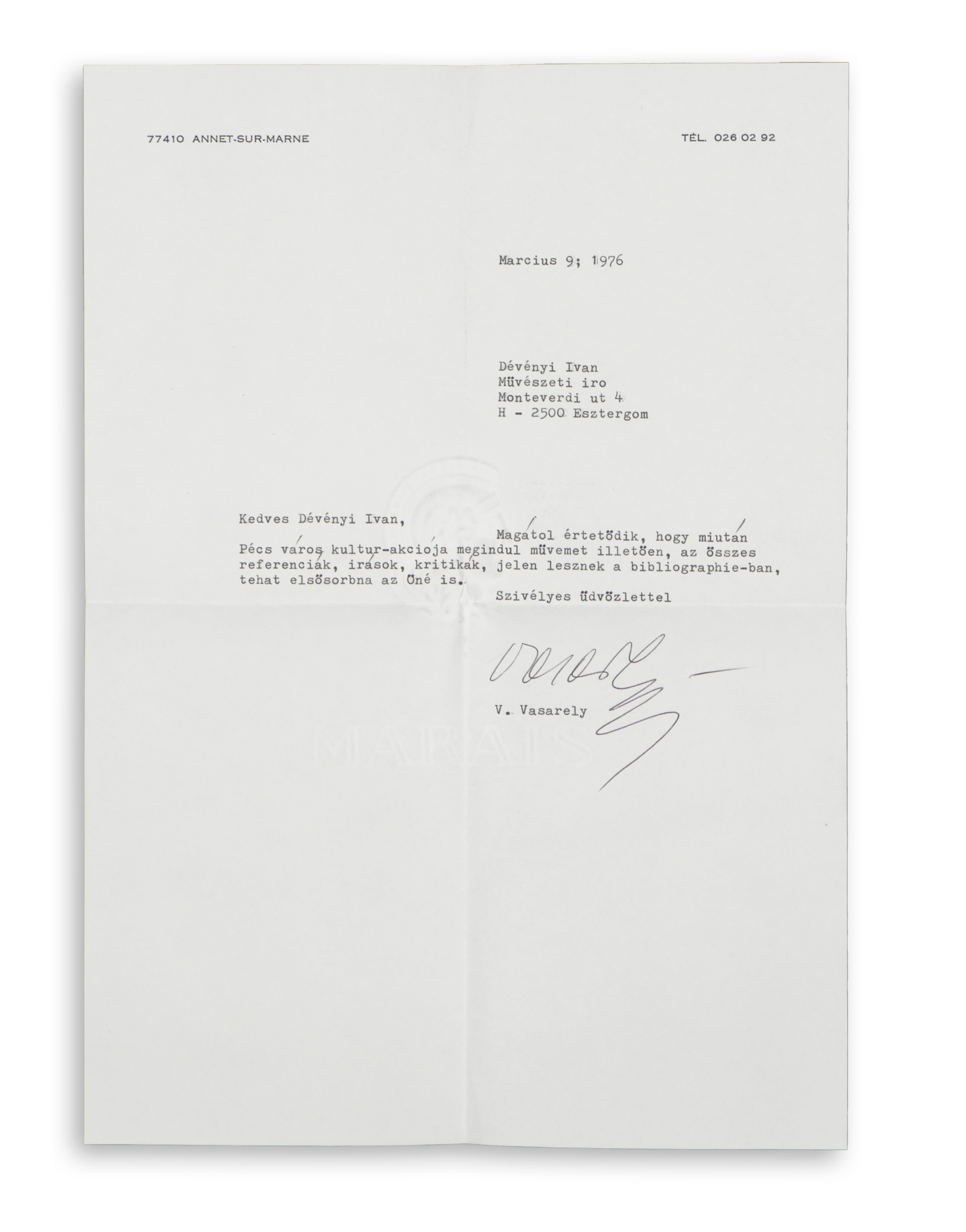 Victor Vasarely levele Dévényi Ivánnak.
