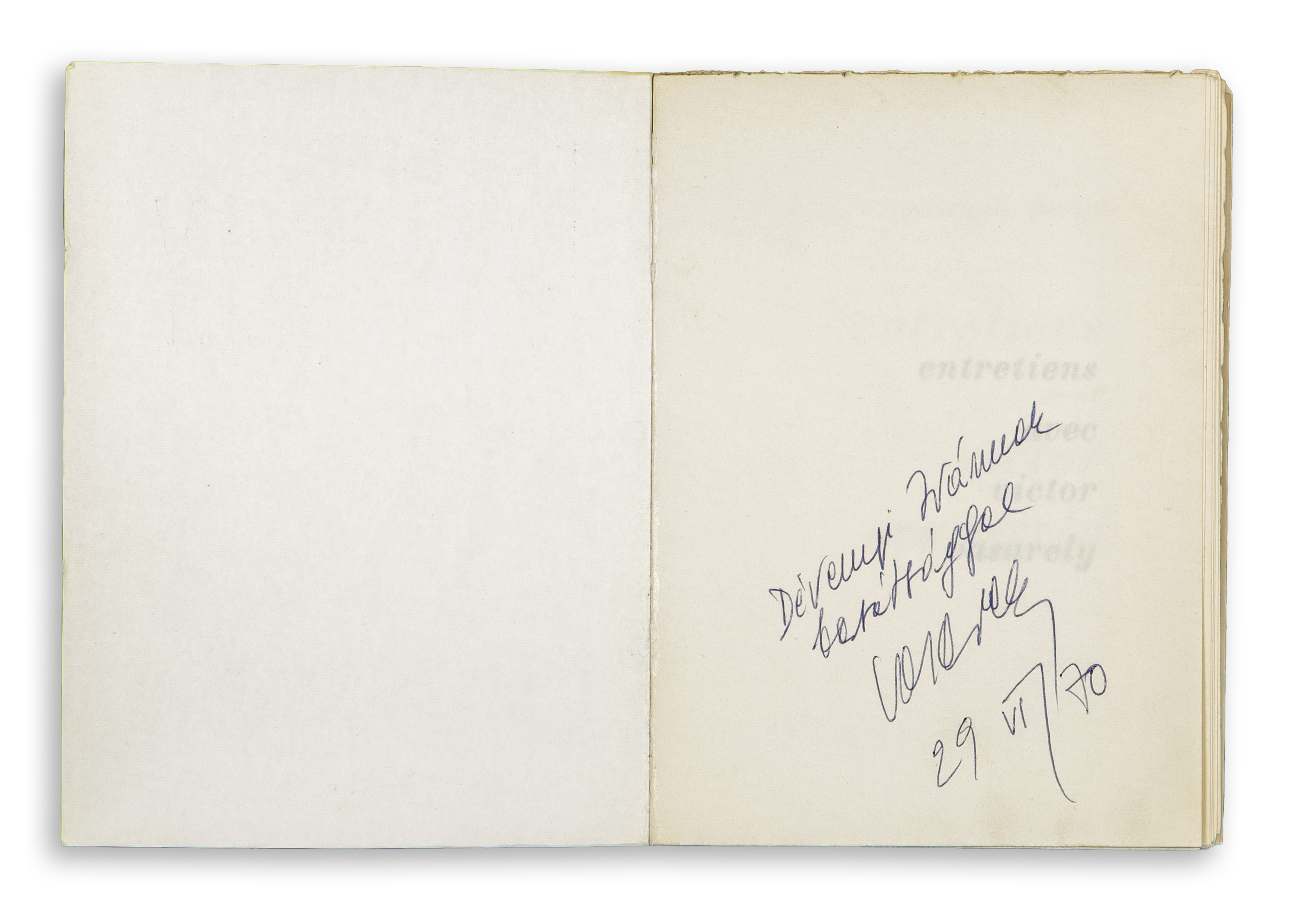 Az előzéklapon Vasarely dedikációja Dévényi Iván (1929–1977) pedagógus, műkritikus, műgyűjtőnek: „Dévényi Ivánnak bartásággal / Vasarely / 29 VI 70.”