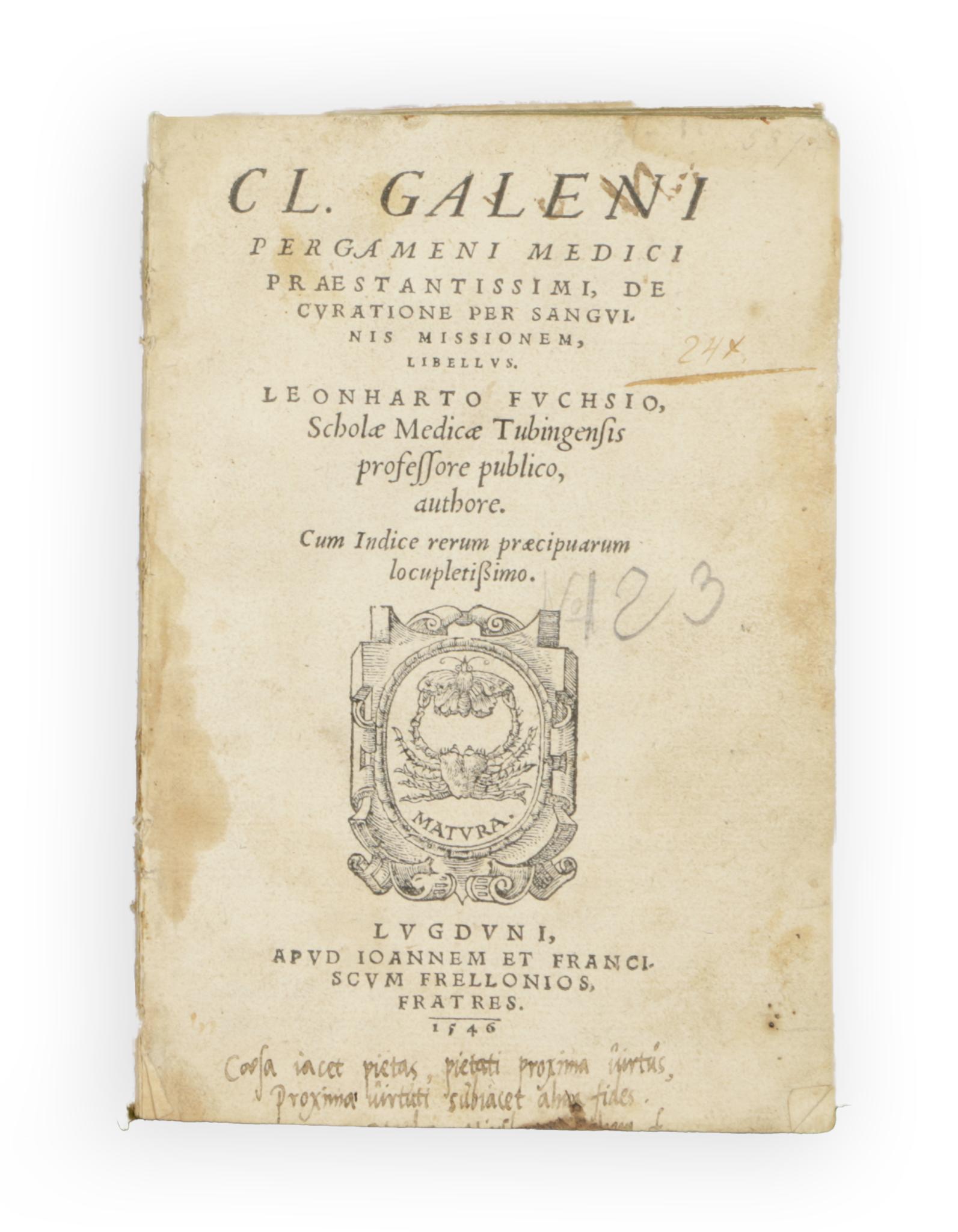 Exceptionally rare edition by Leonhard Fuchs, containing the teachings of Galen on the circulation of the blood. Galen's anatomical and medical understanding was fundamentally influenced by the then current theory of humorism (also known as the four temperaments -- black bile, yellow bile, blood and phlegm) developed by ancient Greek physicians such as Hippocrates. For more than 1300 years, Galen's teachings and theories dominated and influenced Western medicine. Galen believed that each part of the tripartite soul controls specific functions within the body and that the soul as a whole contributes to the health of the whole body, enhancing "the natural ability of a given organ or organs to function".