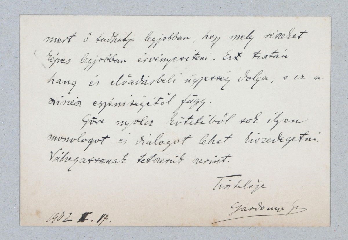 1902Az 1902. március 17-én kelt levelében az író arról tájékoztatja a címzettet, hogy Faragó Ödön (1876–1958) színésztől értesült róla, miszerint a címzett szeretné feldolgozni az egri remete Göre-műveit. Gárdonyi belegyezését adja a felajánlott díjazás fejében és a társulatra bízza, hogy melyik részeket dolgozzák fel a Göre-kötetekből.