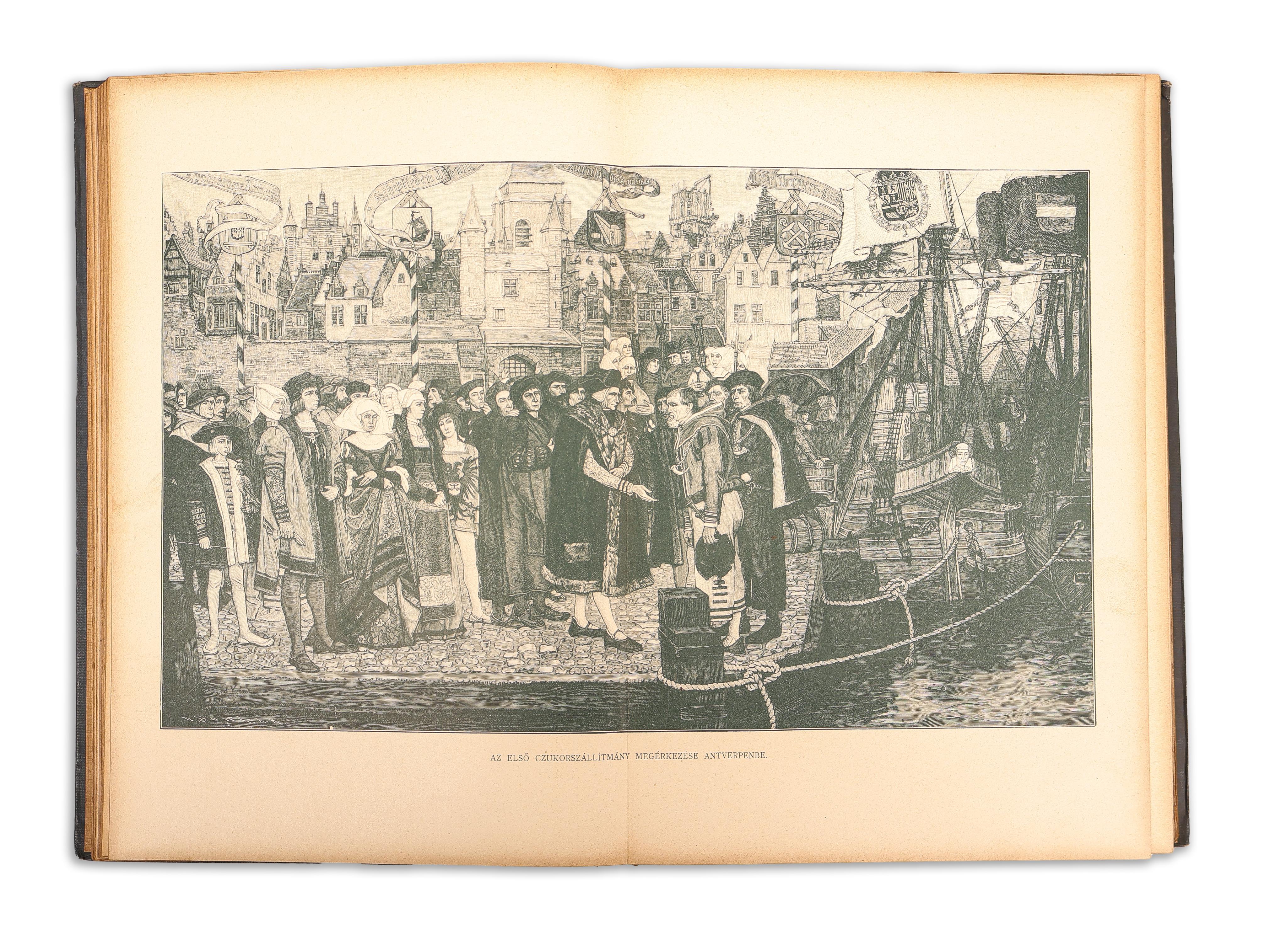 Publisher's illustrated, gilt full cloth binding. Ignác Wolfner bookbinder's embossed seal on verso of back boards.
