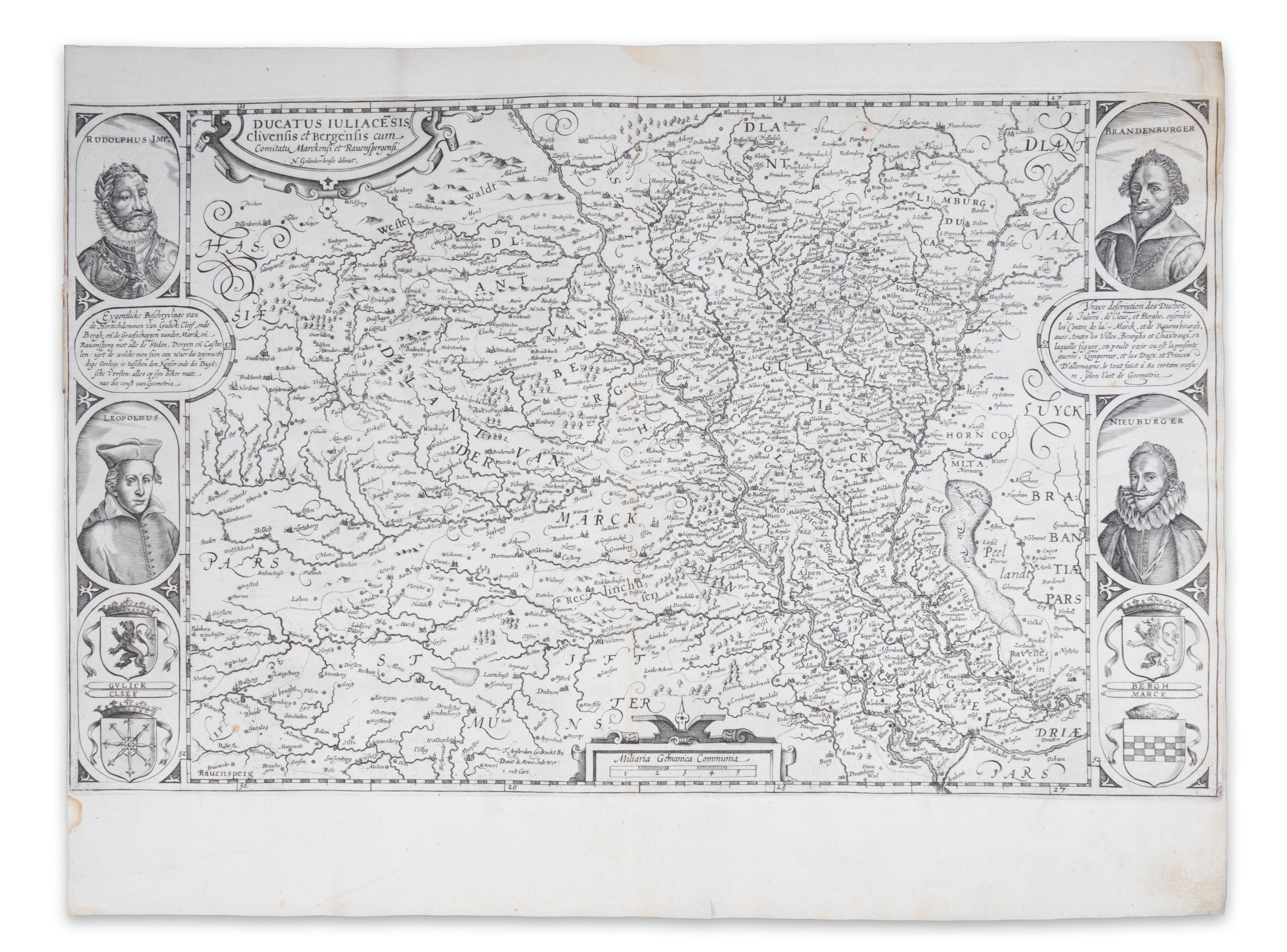 Amsztedam, 1610.Páratlanul ritka, Nicholas van Geelkercken által készített, dél-északi tájolású, és Rajna vidékét ábrázoló önálló lapként megjelent „hírtérkép”. A David de Meine által kiadott lap kartográfiai alapjául Gerard Mercator munkái szolgáltak, és nagy valószínűséggel – kétnyelvű, holland és francia feliratai miatt – nemzetközi piacra szánták, a Jülich-Cleves utódlási válság híradásaként. Mivel 1609-ben János Vilmos herceg utód nélkül halt meg, nemcsak a legközelebbi nőági rokonok, a brandenburgi és a pfalz-neuburgi herceg tartottak igényt az örökségre, hanem II. Rudolf, a Német-római császár is a Habsburg birodalomhoz akarta csatolni. A háborúval fenyegető helyzetet örökítette meg a korban divatos „carte-à-figures” stílusban készült metszet, amelynek két oldalsó keretdíszében az örökösödés iránti vitában szemben álló feleinek portréi – bal oldalt II. Rudolf császár és Lipót főherceg, jobboldalt pedig János Zsigmond brandenburgi választófejedelem, illetve Wolfgang Vilmos pfalz-neuburgi herceg –, valamint a Jülich (Gulick), a Cleves (Cleef), a Berg (Bergh) és a La Marck (Marck) dinasztiák címerpajzsai kaptak helyet. Tételünk – mivel az első Jülich-válság rövid életű volt, ezért hírértéke lecsökkent, valamint van Geelkercken 1610-ben publikált egy másik, ezzel a témával kapcsolatos térképet is – valószínűleg aránylag kis példányszámban látott napvilágot. Kocman világszerte mind-össze öt darabját említi bibliográfiájában.