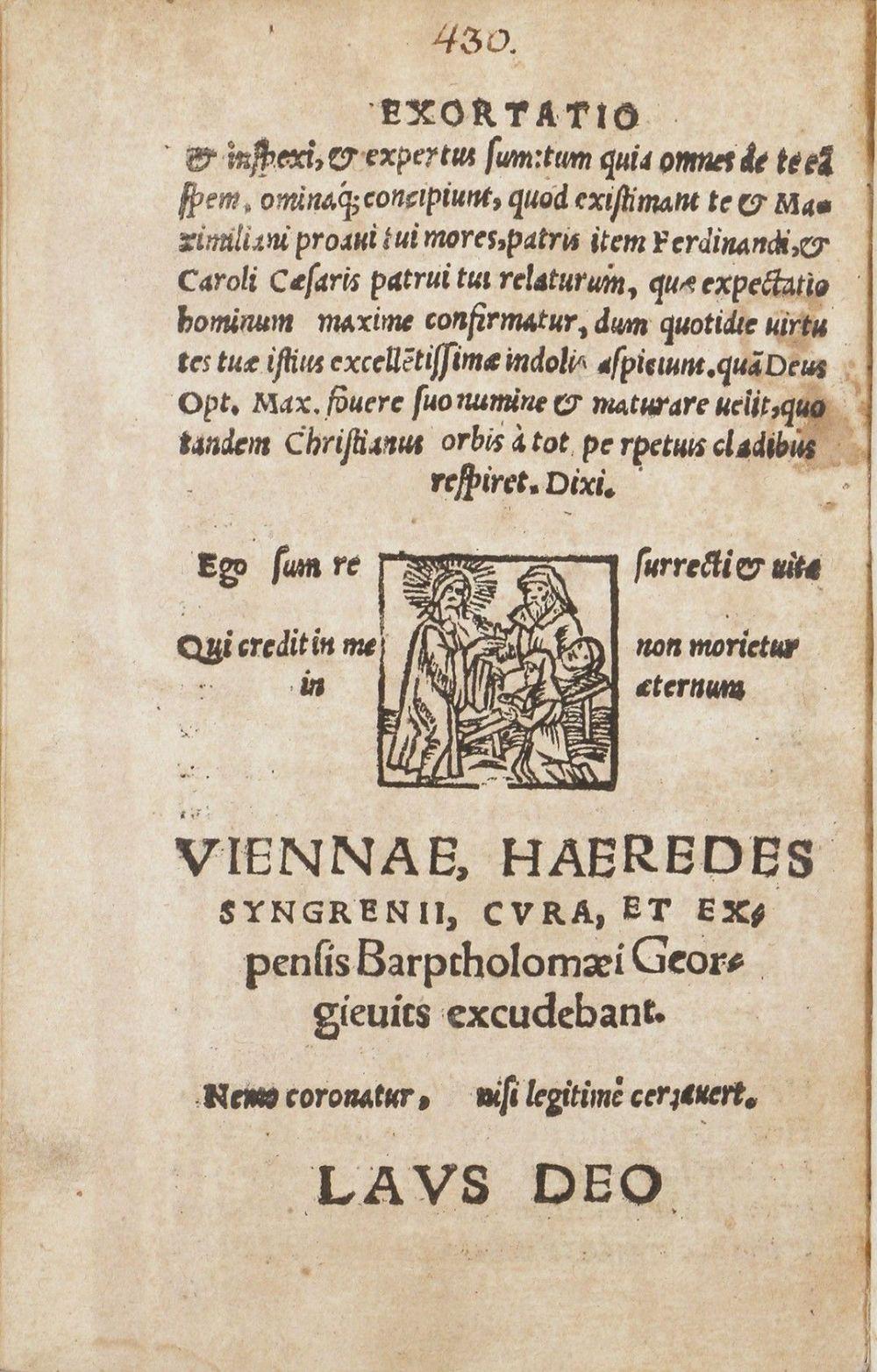 In the spring of 1547, he appeared in Transylvania at Oradea (Nagyvárad), close to the actual wielder of power, Georg Martinuzzi (born Juraj Utješenović), whom he included among his celebrated heroes of the Turkish wars. In the Franciscan monastery of Oradea, before a large audience on Pentecost Sunday, he engaged in a theological debate with a Turkish dervish (Cselebi). The debate, held in Turkish, ended in Georgievits's triumph when he derived the doctrine of the Holy Trinity from a few lines of the Quran. He concluded by teaching the dervish the Lord's Prayer in Turkish. The present lot is a copy of this debate published in Vienna in 1548 (another edition appeared in Kraków the same year, RMK III. 375). The Vienna edition was dedicated to Archduke Maximilian and contains a new dedicatory poem by Nikolaus Polites (Bourgois), a professor at the University of Vienna. The title page is adorned with a woodcut of the Basmala (the formula from the first line of the first surah of the Quran: bismillāhi r-raḥmāni r-raḥīm, "In the name of God, the Most Gracious, the Most Merciful"), and the text is multilingual. It is exceptionally rare, with public collection copies found only in the Hungarian National Museum and the Austrian National Library.