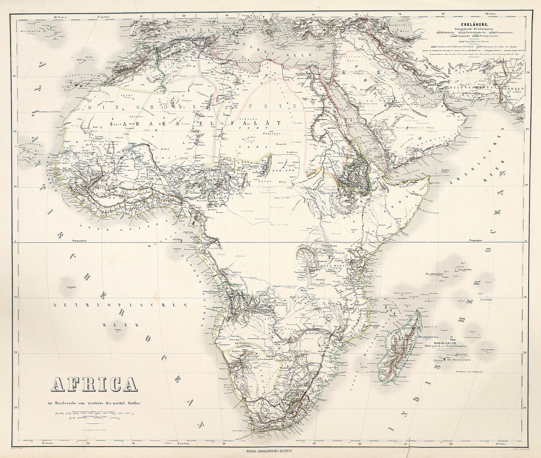 Afrikát, Az Arab-félszigetet és Madagaszkárt ábrázoló, weimari Földrajzi Intézet által kiadott határszínezett térkép. A domborzat sraffírozással jelölve. Kiepert, aki több éven át vezette az intézetet, a berlini egyetem földrajzprofesszora és az ókori történelmi térképészet szakértője volt. Bár különös hangsúlyt fektetett Kis-Ázsiára, oktatási céllal jelentős számú, más régiókat lefedő térképet is készített.