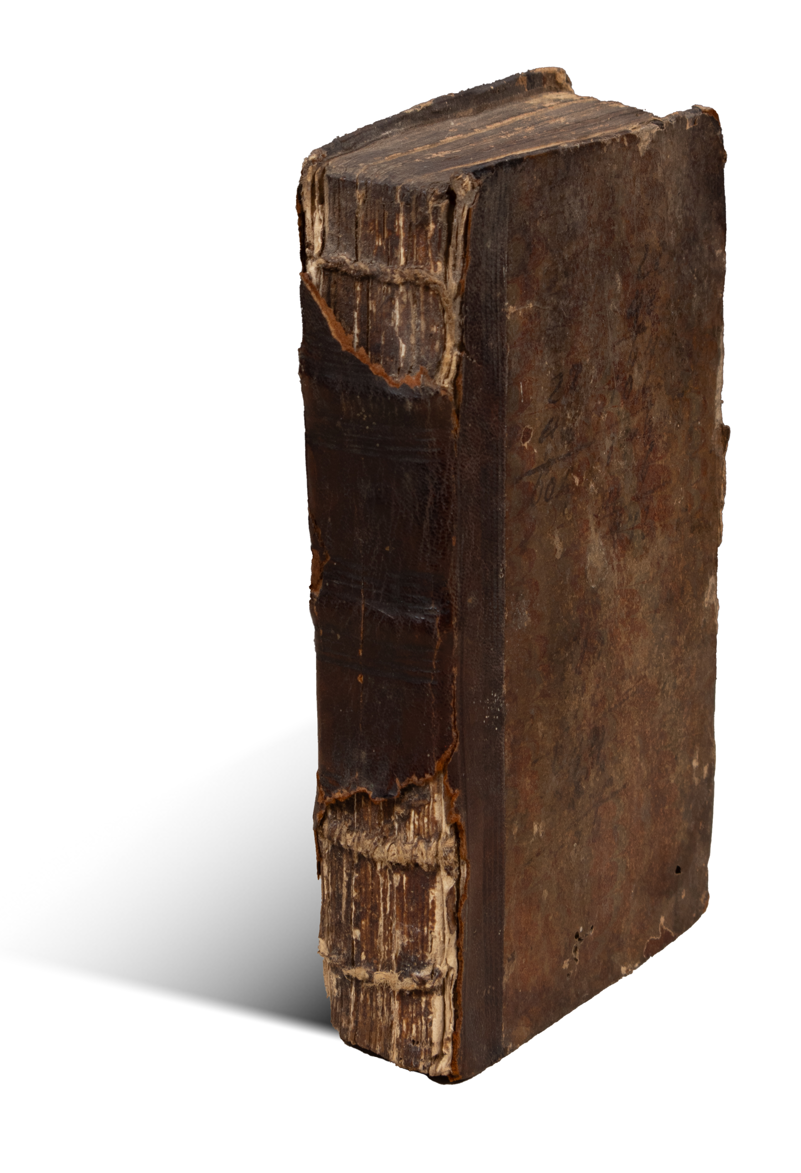 Korabeli sérült félbőr-kötésben. A gerincén a bőr hiányos. A borítón, előzéklapokon feljegyzések, rajzok. Foltos, néhol szúrágás nyomai.