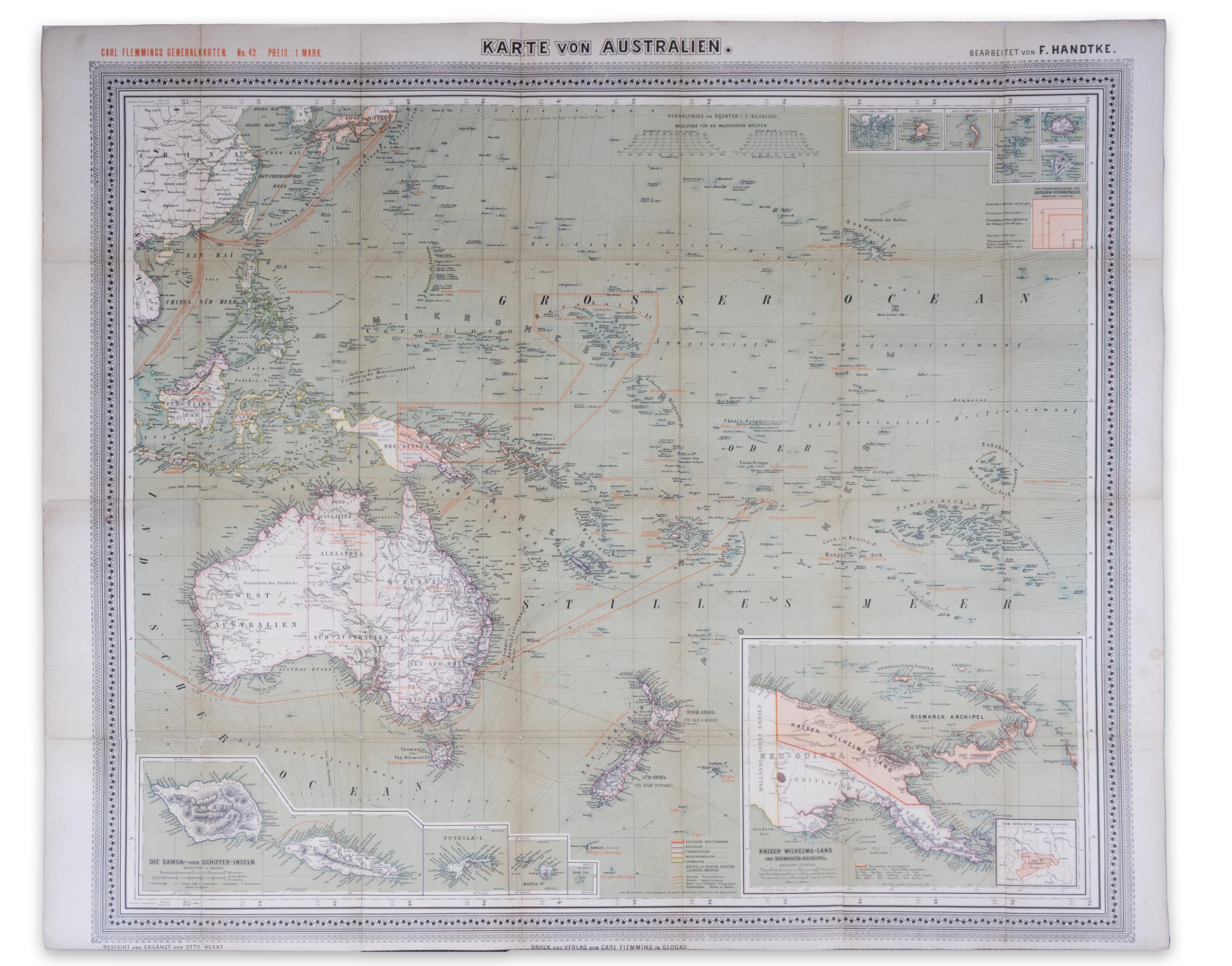 With insets of: Neiafu auf Vava'u (Tonga-ins). Scale 1:850 000 -- Neu-Lauenburg (or Duke-of-York-Island). Scale 1:850 000 -- Jaluit auf Jaluit (Marshall-In.). Scale 1:850 000 Tonga-Oder Freundschafts-In. (Friendly Islands). Scale 1:8 500 000 -- Viti Levu (Fidschi-In., or Fiji). Scale 1:8 500 000 -- I. Hawaii. Scale 1:8 500 000 -- Die Samoa-oder Schiffer-Inseln. Scale 1:850 000 --Tutuila-In. -- Manua-In. -- Rose-Ins. -- Kaiser Wilhelms-Land und Bismarck-Archipel. Scale 1:7 000 000