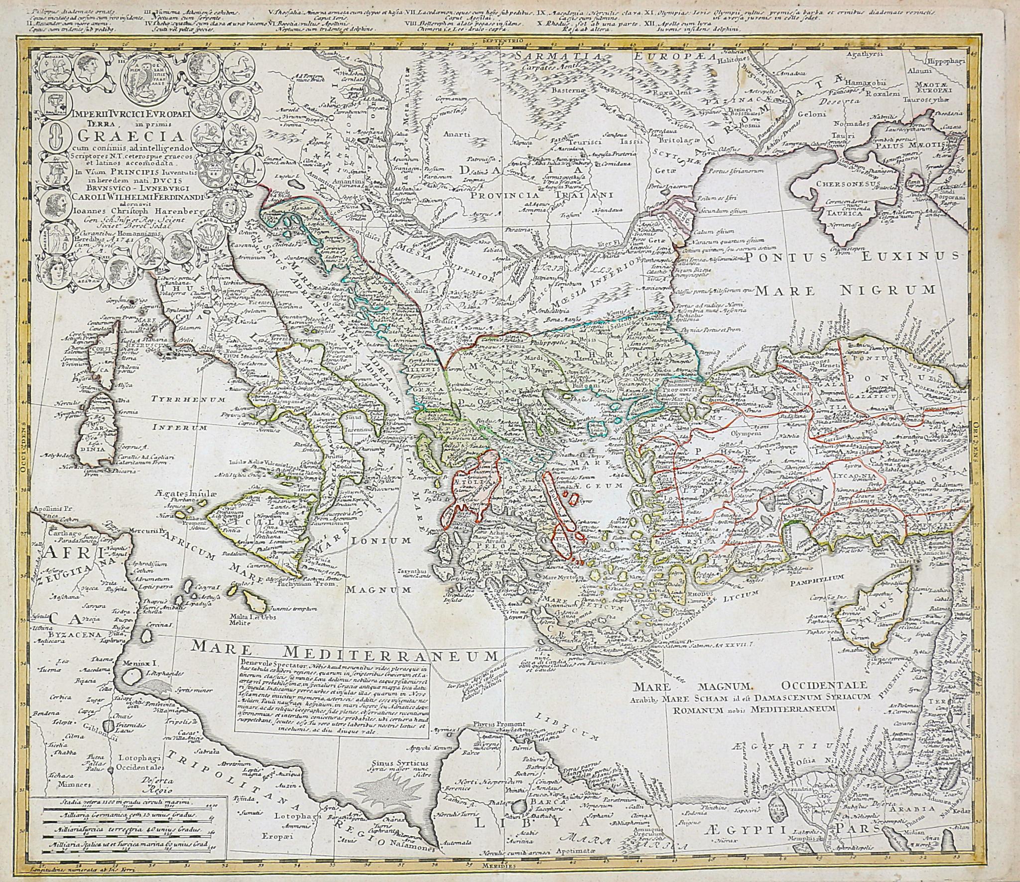 This is one of the Homann Heirs finest and most appealing maps of the ancient Greek World. Map centers on Greece but includes the entirety of the eastern Mediterranean and North Africa. Also includes the Black Sea as far as the Crimea and the sea of Azov. Extends north as far as Sarmatia and Pannonia. Includes Italy, Sicily, Corsica and Sardinia. Upper left quadrant features a decorative title cartouche adorned with the rectos and versos of 12 ancient Greek coins with explanatory numbered references outside the top border of the map. Show the important Greek provinces and colonies through the Mediterranean, especially in modern day turkey and in the Italian peninsula. Includes nautical military and trade routes. This map was drawn by Joanes Christoph Harenberg for inclusion the 1752 Homann Heirs Maior Atlas Scholasticus ex Triginta Sex Generalibus et Specialibus…. Most early Homann atlases were “made to order” or compiled of individual maps at the request of the buyer. However, this rare atlas, composed of 37 maps and charts, was issued as a “suggested collection” of essential Homann Heirs maps.