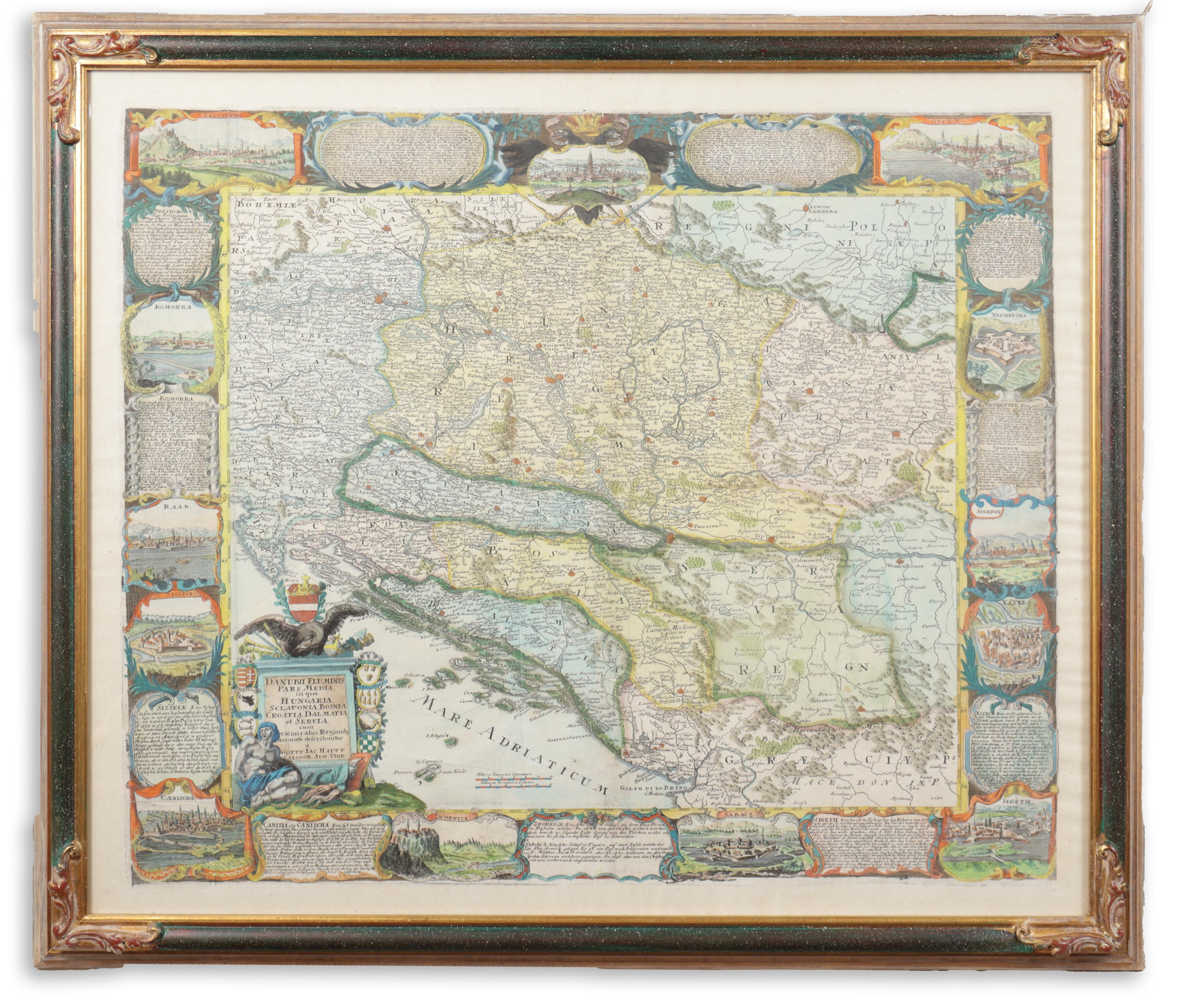 Magyarország és a déli szomszédos területek nagyméretű, gyönyörűen színezett rézmetszetű térképe. Önálló lapként jelent meg. A rendkívül ritka, dekoratív térképet 13 városkép övezi: felül Pozsony, Bécs és Buda, balra Komárom, Győr és Sziszek, jobbra Érsekújvár, Szeged és Eszék, alul Kanizsa, Zvornik, Szabács és Szigetvár látható.