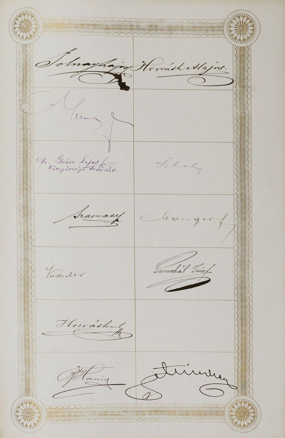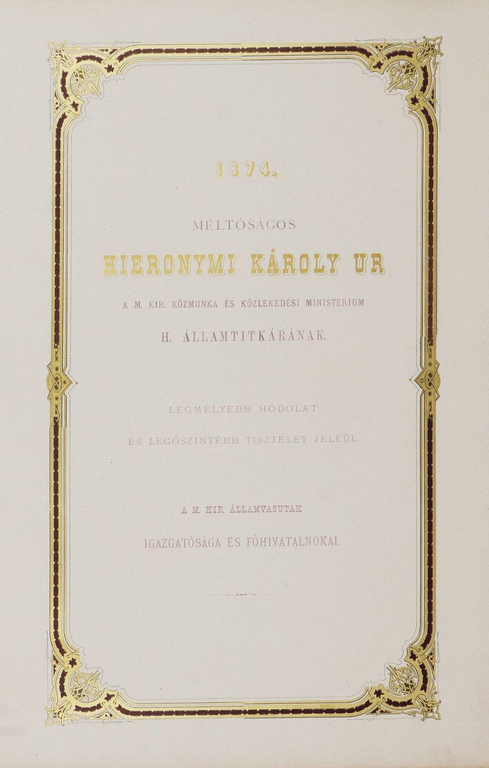 1874A Magyar Királyi Államvasutak igazgatósági tagjainak és főhivatalnokainak aláírásokkal ellátott üdvözlőlapja Hieronymi Károly politikus, 1874 októberétől közmunka- és közlekedésügyi helyettes államtitkár, későbbi belügyminiszter (1892–1895), majd kereskedelemügyi miniszter (1903–1905, 1910–1911) részére. Az aláírók sorában – összesen két és fél oldalon – szerepel többek között: Tolnay Lajos MÁV-igazgató, Horváth Alajos MÁV-igazgatóhelyettes, Grósz (1878-tól Csatáry) Lajos MÁV-főorvos (itt: „közegészségi tanácsos”), Szmekál József miniszteri tanácsos, Kun Adolf Károly ügyosztályfőnök.