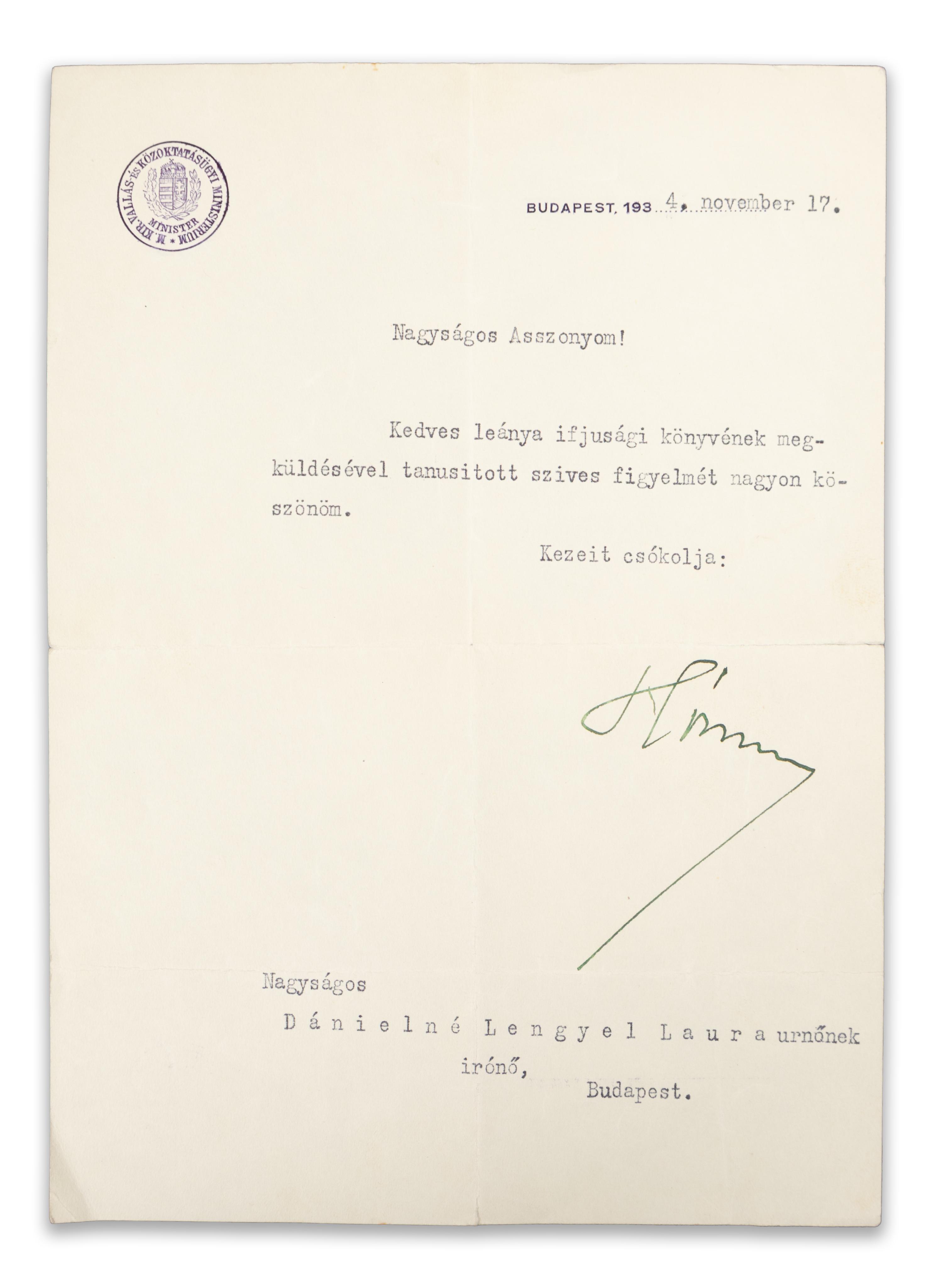 1934 BudapestHóman Bálint (1885–1951), politikus, történész, egyetemi tanár, 1932-1938 között Magyarország vallás- és közoktatásügyi minisztere, Budapesten, 1934. november 17-én kelt, Dánielné Lengyel Laurának címzett levelében megköszöni, hogy megküldte lányának, Dániel Anna írónak a regényét. Valószínűleg Dániel Anna (1908-2003), író, irodalomtörténész, Valahogy élni kell... című regényéről van szó, mely egy művészcsalád életét mutatja be, akiket lányuk, a 19 éves zongoraművésznő tart el. Dániel Anna édesanyja, Dániel Miklósné Lengyel Laura (szül. Pollák Laura, 1874–1954) maga is magyar író, kritikus, újságíró, aki Budapesti Hírlapnál dolgozott, előbb mint színikritikus, majd az irodalmi és színházi részleg vezetőjeként. 1927-től a Pesti Hírlap munkatársa lett.