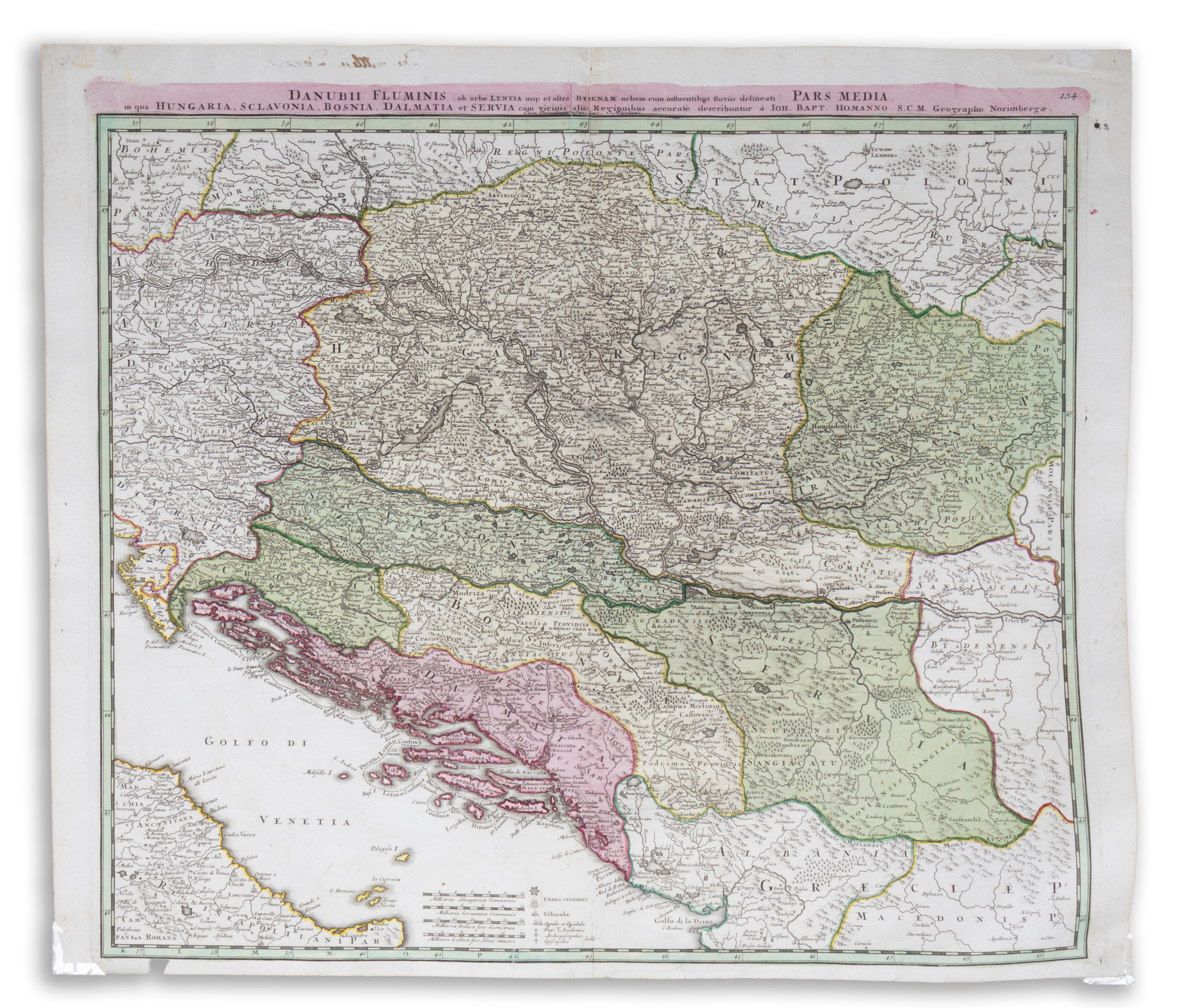 The second of three sheets of Homann's Danube map published in 1713. Copper engraving with period colouring, good condition. It shows the Danube river from Linz in Austria, via Vienna, Belgrade, up to Vidin in Bulgaria. Bottom left the Adriatic Sea.