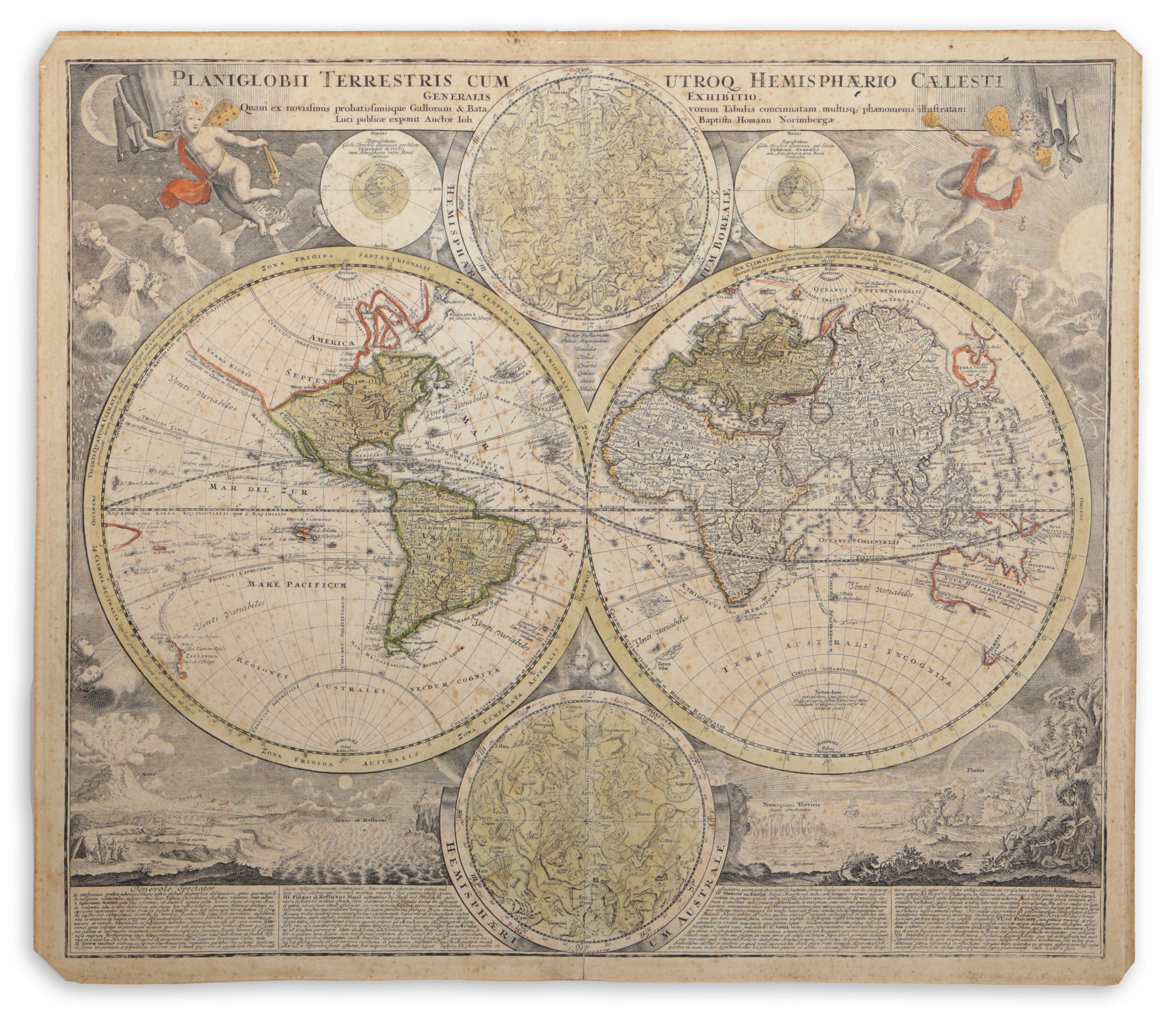 Nuremberg, 1707.Ez a gyönyörű, kézzel színezett rézmetszetű kettős-félgömb térkép kiváló példája a 18. század eleji térképészet gyakorlatának és esztétikai érzékenységének. A világtérkép nemcsak földrajzi ábrázolása miatt figyelemre méltó – amely a korszakra jellemző, jól ismert pontatlanságokat mutat, például a hiányos Ausztráliát –, hanem gazdag művészi díszítései révén is. Ezek közé tartoznak a csillagászati ábrázolások az északi és déli féltekéről, az allegorikus jelenetek, melyek a tudományt és a fantáziát ötvözik, valamint a természeti jelenségek részletes bemutatása, mint a vulkánok működése vagy a rejtélyes örvények.