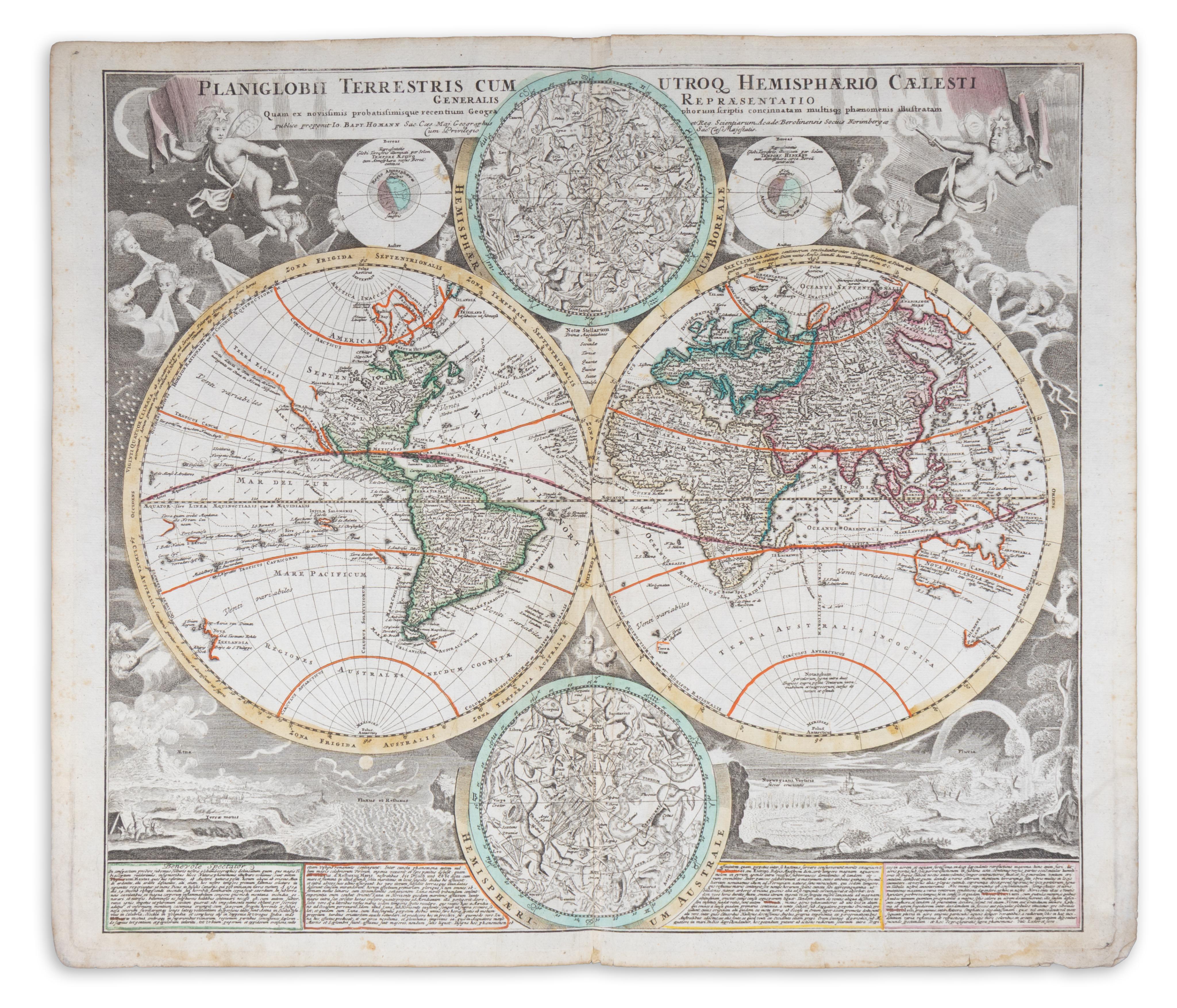 This beautiful copper engraved, hand coloured double-hemisphere map exemplifies the cartographic practices and aesthetic sensibilities of the early 18th century. This worldmap is notable not only for its geographical representation, showcasing the familiar inaccuracies of the period such as an incomplete Australia, but also for its lavish artistic embellishments. These include celestial depictions for both the northern and southern hemispheres, allegorical representations merging science and fantasy, and detailed portrayals of natural phenomena, including the activity of volcanic mountains and the enigmatic whirlpools.