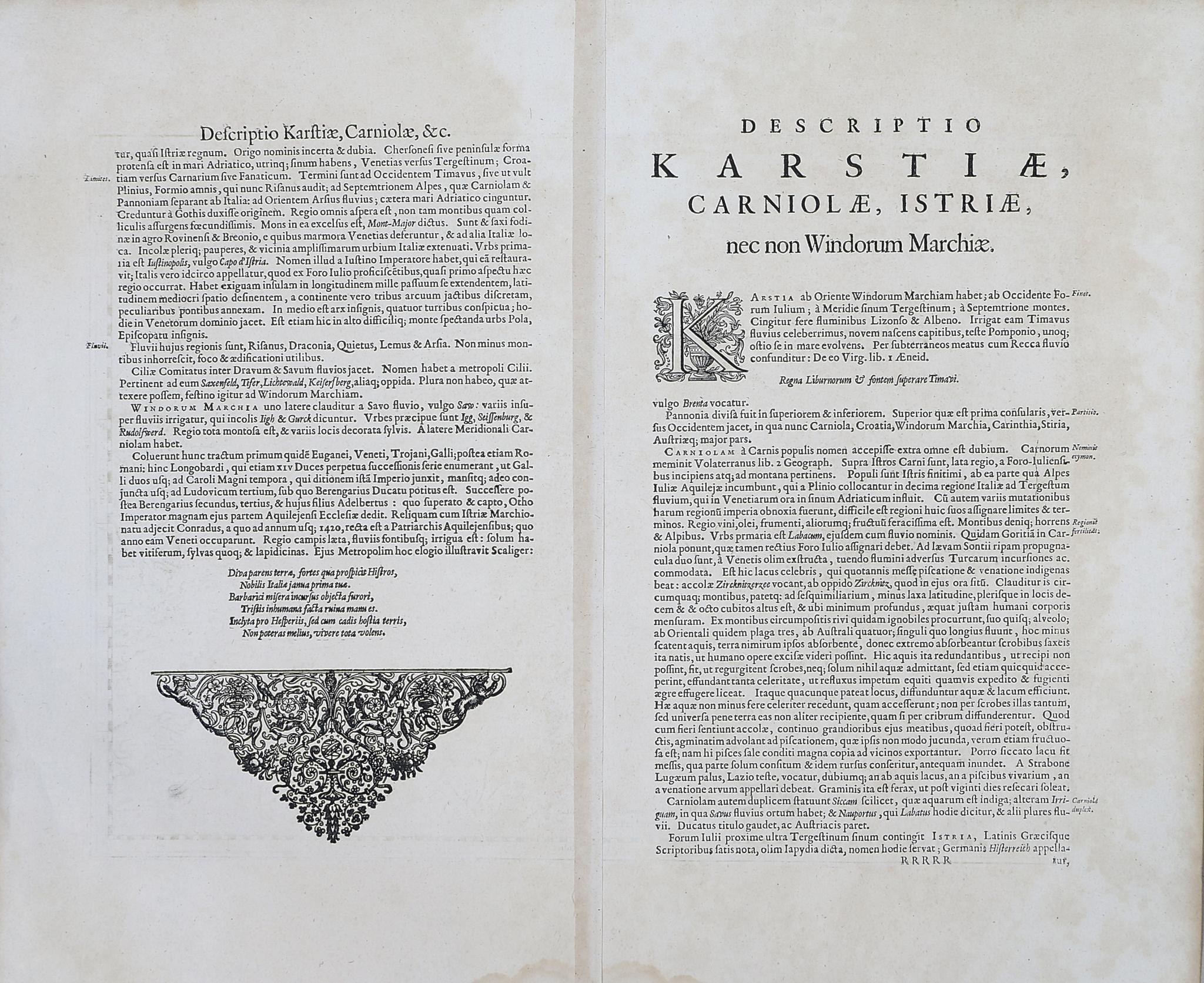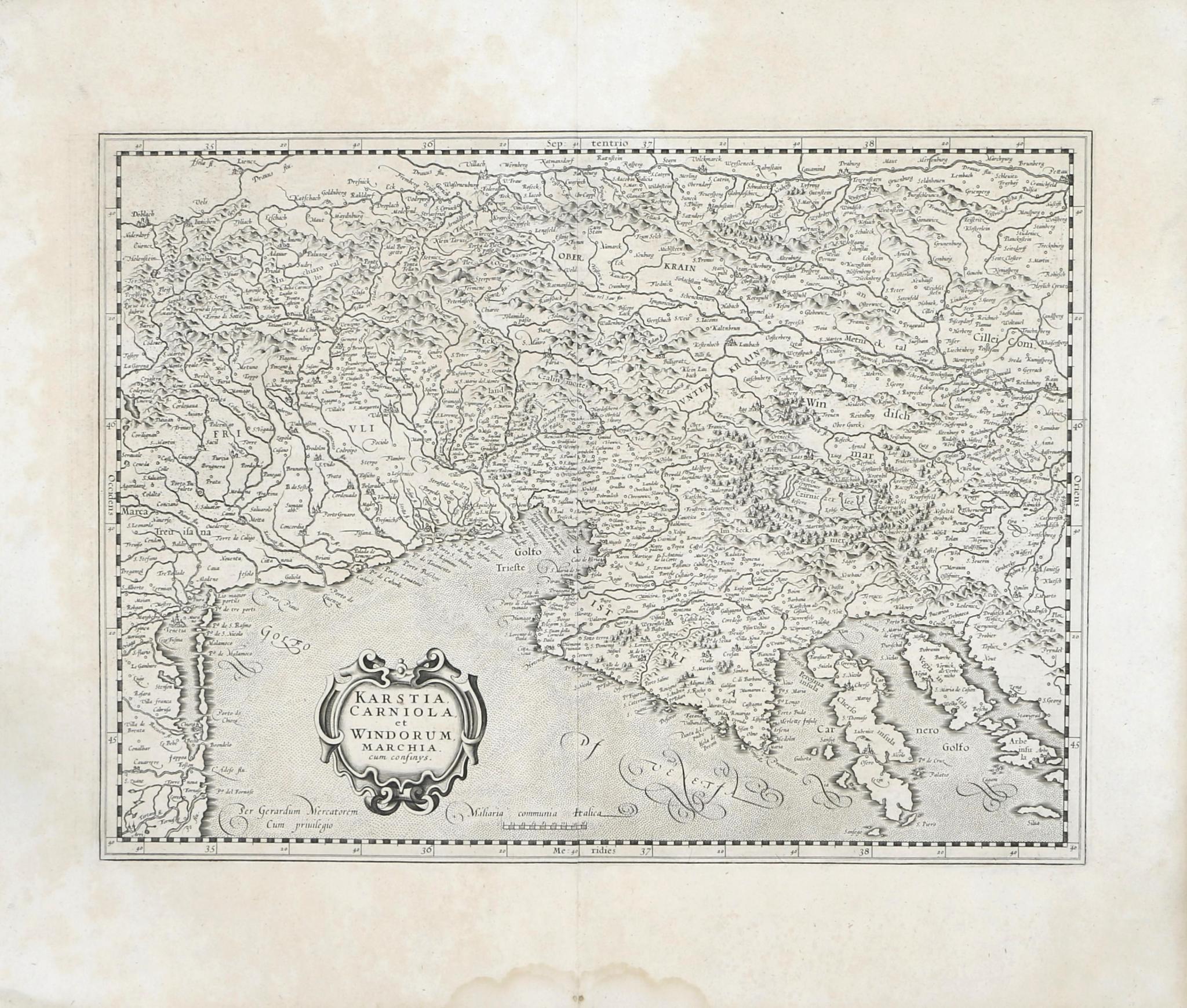 A fine example of Mercator's map focusing on the region centered around Istria and the Gulf of Trieste. The map stretches from Venice to the Island of Arbe and from Doblach to Pettau along the Dravus River.