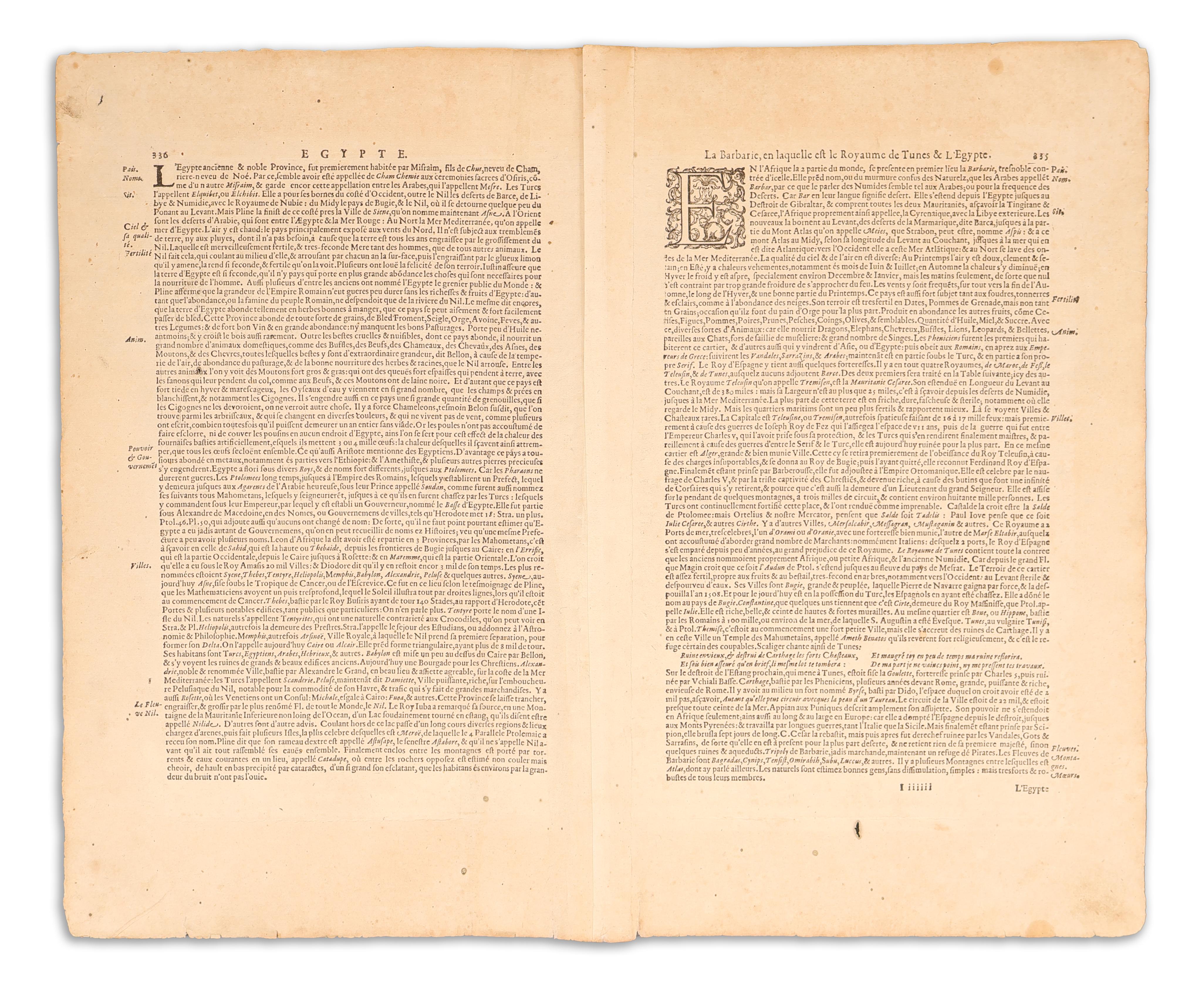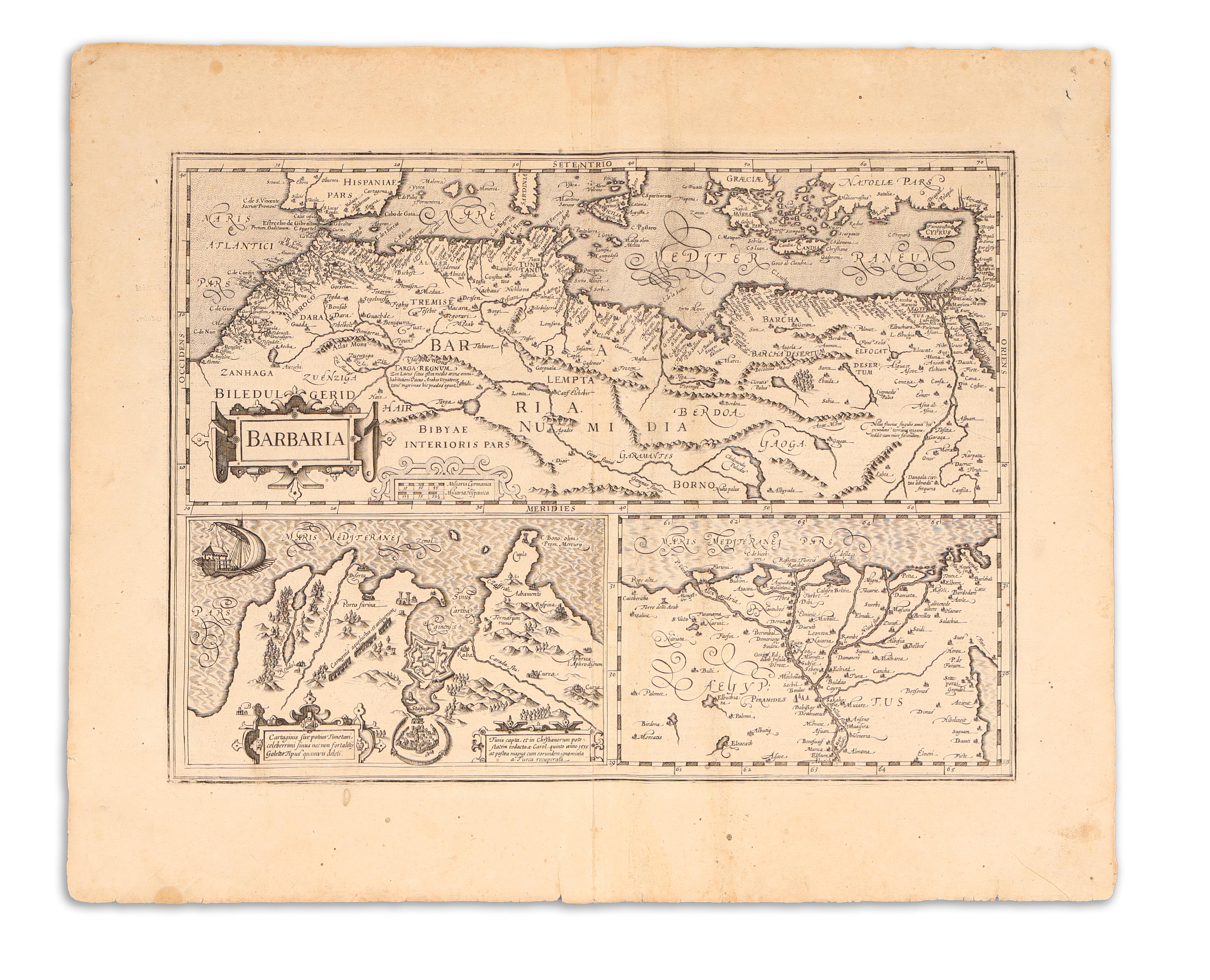 Tetszetős térkép, amely Észak-Afrikát ábrázolja Marokkóval, Algériával, Tunéziával, Líbiával, Egyiptommal, valamint a Földközi-tenger déli részével. Alul két melléktérképen Tunézia és Egyiptom. A kompozíciót egy vitorlás hajó, valamint négy díszes kartus gazdagítja.