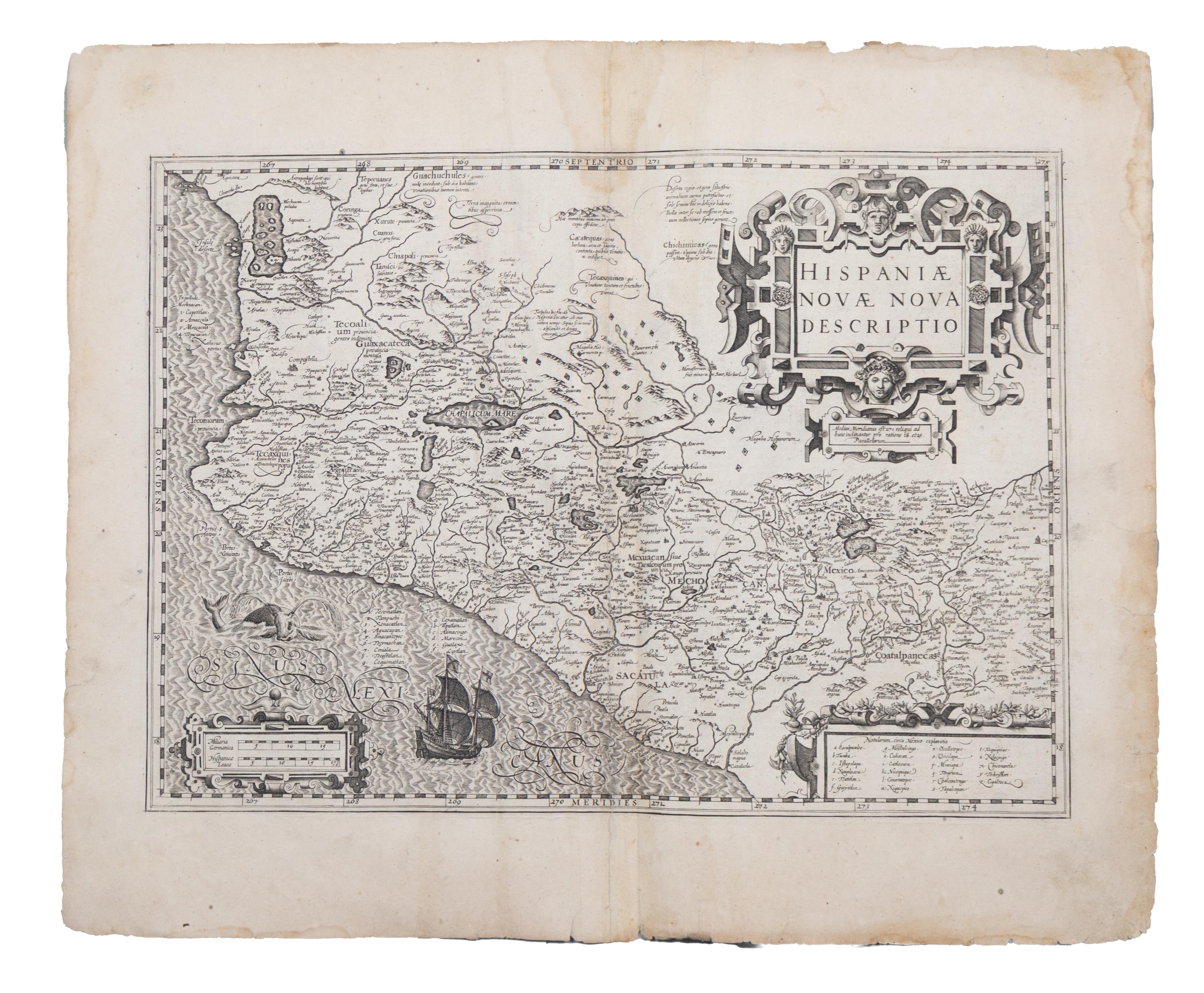 Páratlan rézmetszetű térkép Mexikóról, melyet díszes címerkartus és kettős mérföldskála (holland és spanyol) ékesít. A korai térképészet művészetének és a gyarmati képzeletvilágnak figyelemre méltó példája. Hondius Ortelius 1579-es térképéből merített ihletet, bár az eredeti kartográfiai források bizonytalanok.
