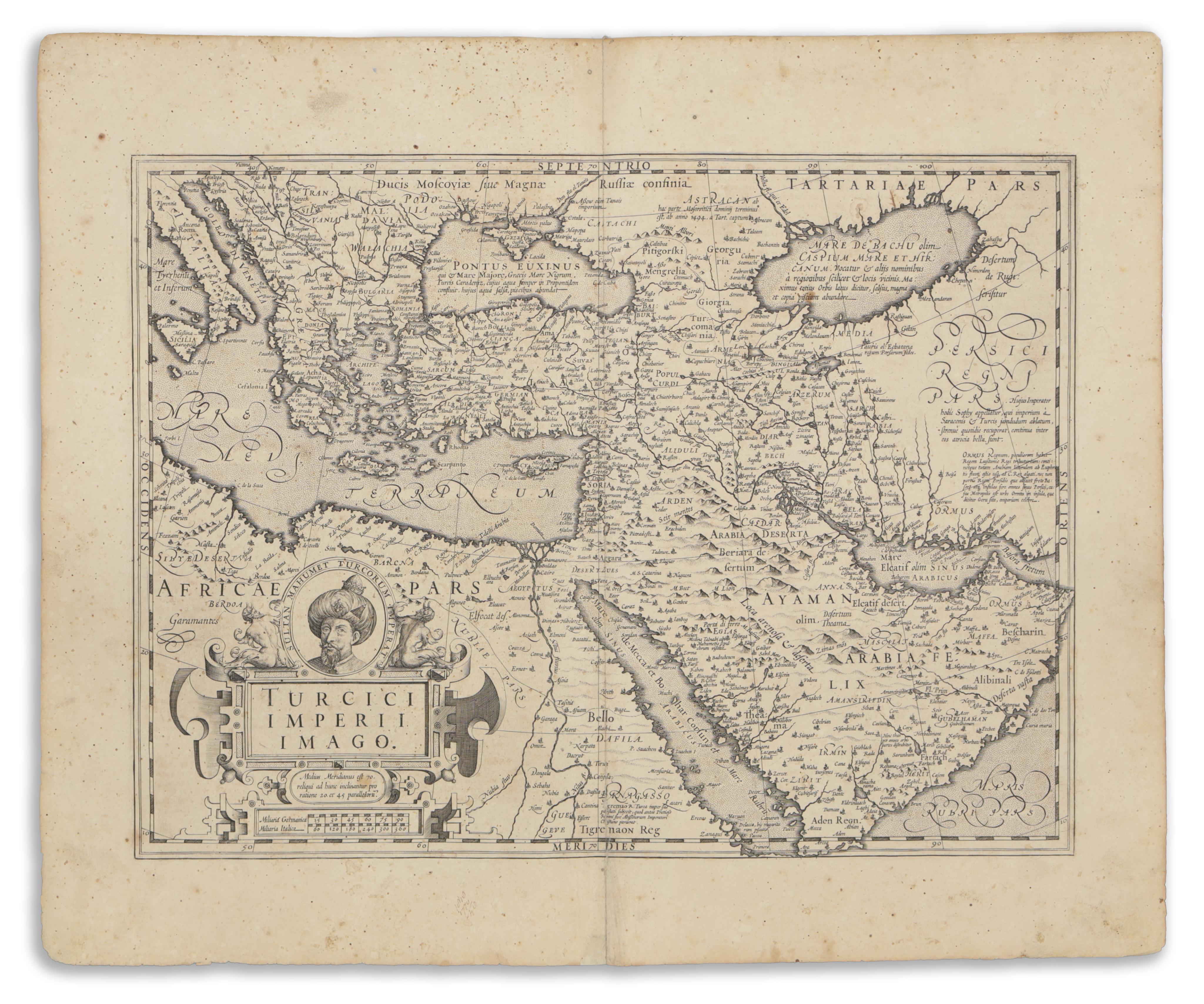 A richly ornamented strapwork cartouche in the lower left corner contains the title and scale. At the top of the map is a portrait labeled "Sultan Mahumet Turcorum Imperat.," referring to Sultan Mehmed III, who reigned from 1595 to 1603. Mehmed III is remembered for the execution of his nineteen brothers, his involvement in the Austro-Ottoman War, the Jelali Revolts, and his court's reception of Queen Elizabeth I’s envoy in 1599.